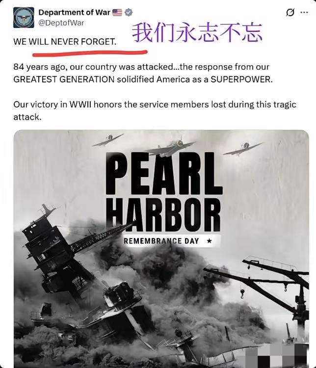 如果说现在中国对日本叫剑拔弩张的话,那么近日美国五角大楼的美国战争部突然发布的【永不遗忘珍珠港】海报就是日本的催命符! 近日美国对日本的态度突然改变,五角大楼美国战争部突然发出【永不遗忘珍珠港】的海报:“我们永志不忘,84年前,我们的国家遭受袭击……我们最伟大的一代人的反击巩固了美国作为超级大国的地位。我们在二战中的胜利,是对在这场悲剧袭击中牺牲的军人的缅怀。” 为什么它们美国人要在这个节骨眼上发布这样的消息?其实这个问题一点也不复杂,就是在敲打日本和高市早苗!敲打它高市早苗,在美国刚跟中国达成共识的时候,不经过它特朗普的同意,高市早苗这样莽撞的挑衅中国,这样的行为不但让中国觉得它特朗普又在玩花样,降低中美本就不高的信任度!同时美国战争部发布【永不遗忘珍珠港】提醒日本,再不听话就等着清算,同时也告诉中国,日本的挑衅行为跟我们美国没有关系,这就是特朗普敲打日本和高市早苗的原因所在!