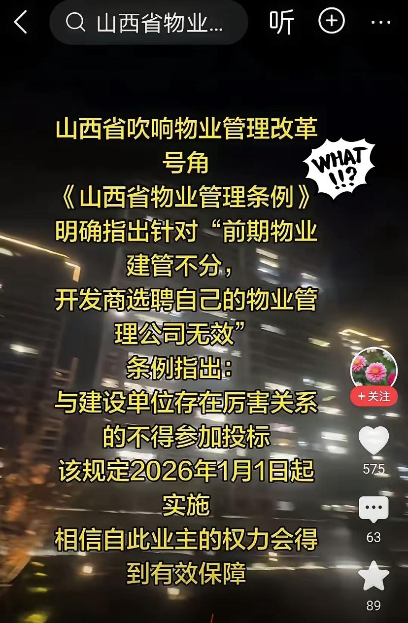 业主终于熬出头了! 2026年1月1日起,新物业管理条例正式执行,物业乱象要被狠狠整治了! 开发商自己招的物业、关联物业、 前期无效物业,通通被淘汰! 以前多少小区被“问题物业”坑惨了?前期物业跟开发商穿一条裤子,业主投诉没人管,公共收益被偷偷私分,业委会和物业“连裆裤”现象屡见不鲜。交着物业费,却享受着敷衍的服务,想换物业比登天还难,不少业主只能忍气吞声。 现在新规直接从根源下手:开发商不能再“自家人管自家小区”,关联物业、前期无效物业一律不准上岗。这波操作切断了利益捆绑,让物业真正回归“服务业主”的本质,山西这波真的带了个好头! 网友们看到消息都忍不住点赞,有人说早就该这样了,建议全国都成立专门机构,审计物业账目,查清收入支出;也有人吐槽,有些贪官污吏借着物业谋便利、收黑钱,山西这措施又及时又果断,太顺民意了。 咱们买套房花光一辈子积蓄,图的就是住得舒心安心。可现实中,不少物业拿着业主的钱,却干着“大爷式服务”,维修拖沓、收费不明、态度蛮横,让业主苦不堪言。山西新规的落地,终于给业主们撑了腰。 物业本就该是业主的“服务员”,而不是“管理者”。山西这波整治物业乱象的操作,值得全国推广!你们所在的城市有物业糟心事吗?是不是也盼着这样的新规赶紧落地?评论区聊聊你的经历!