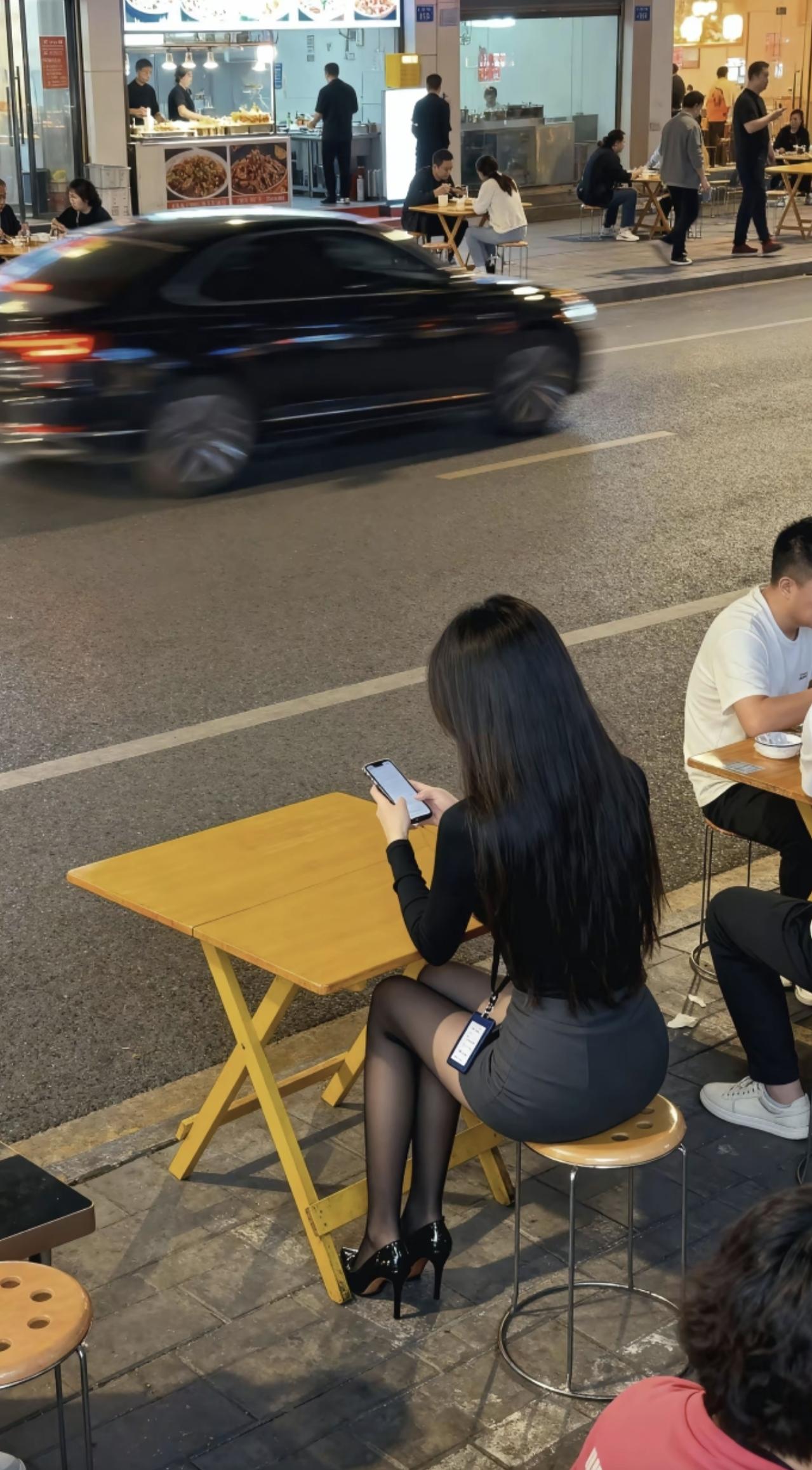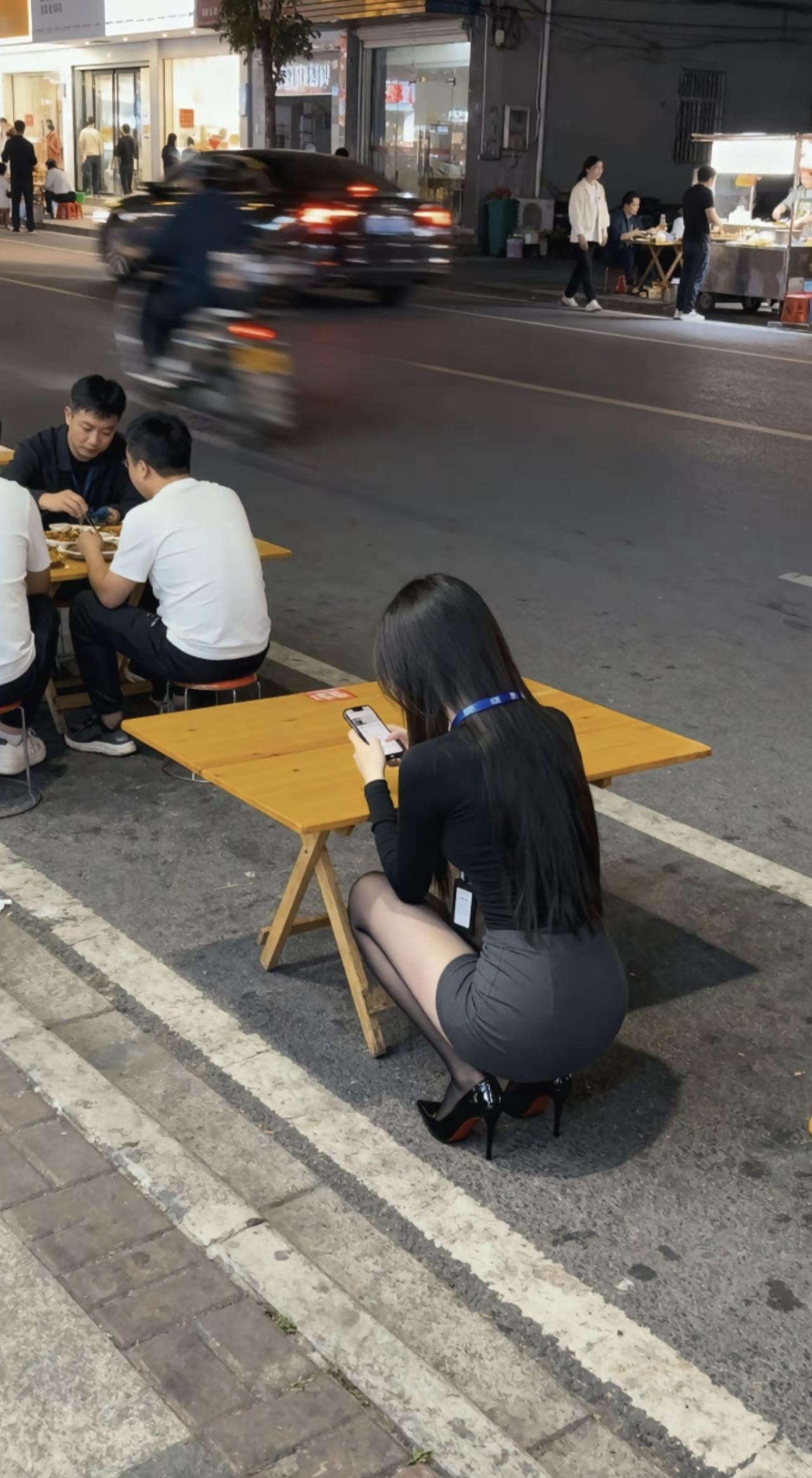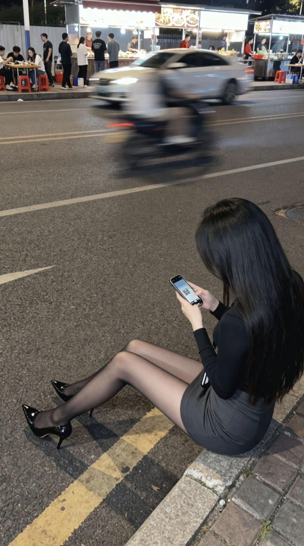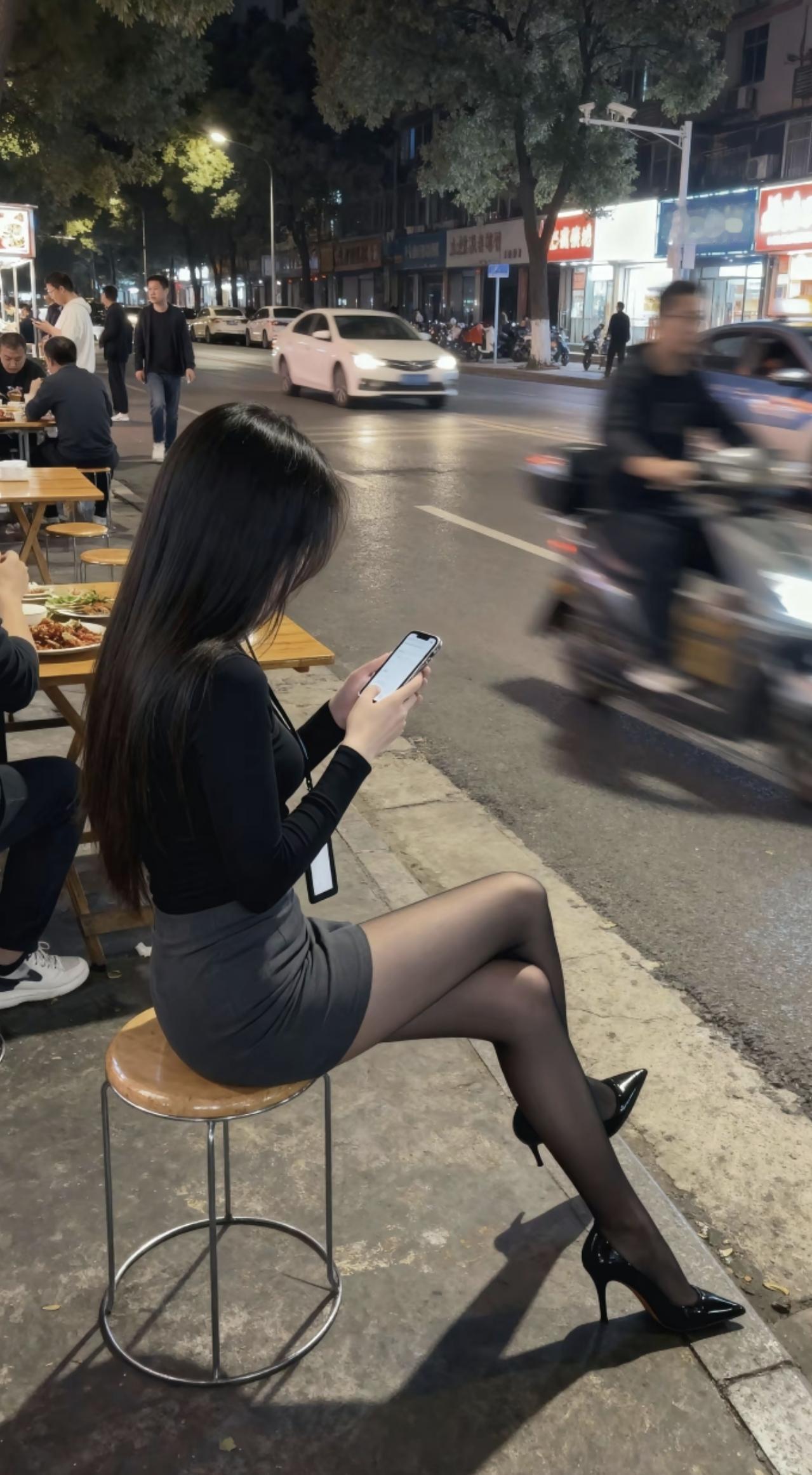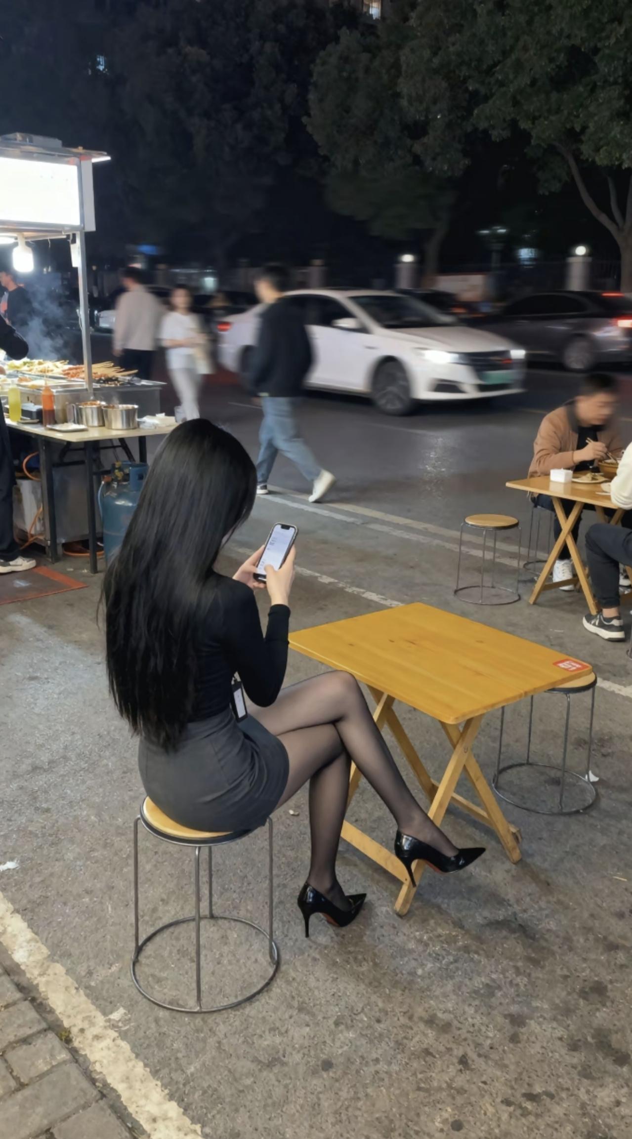 夜晚的路边摊,烟火气裹着晚风。长黑发配黑裙,高跟鞋踩着市井的热闹,手机屏亮着,是独属于城市夜晚的松弛。