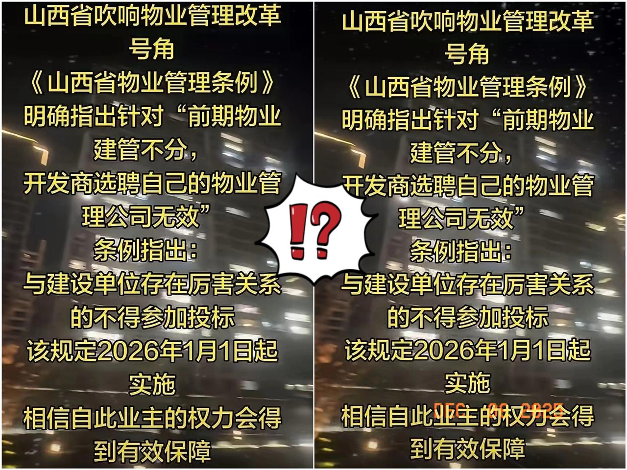物业要变天了。 昨天新闻已经报道了,山西省物业从2026年1月1日起,执行新的物业管理条例。 这消息一出来,简直像在物业圈投了颗重磅炸弹,不少人直呼“物业要变天了”。 长久以来,物业和业主之间的矛盾不少,乱收费、服务差等问题屡见不鲜,甚至还有物业和业主委员会勾结私分物业费的情况。山西这一举措,无疑是给全国物业行业敲响了警钟,也给业主们带来了希望。 在我看来,这不仅仅是规范物业行业,更是对业主权益的有力保障。不过,光有条例还不够,后续监管也得跟上,才能真正让新规落地。 你觉得山西这一做法能在全国推广吗?对于规范物业行业,你还有啥好建议? 请大家说说自己的观点。