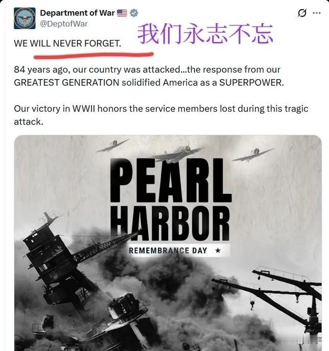 超级罕见!美国公开敲打日本! 美国对日本的态度,正随着高市早苗上台执政肆无忌惮的张牙舞爪而悄然改变,最明显的信号就表现在12月7日,日本偷袭美国珍珠港84周年之际,美国战争部突然一反历史上淡忘珍珠港事件的常态,超级罕见的发出【永不遗忘珍珠港】的海报,用再次复现二战珍珠港战争场景的形式(原文见图二,译文见图三),公开敲打日本。 事实上,国际问题专家早在高市早苗抛出错误言论之初就已经指出,日本政府就是希望通过他们的挑衅激化亚洲矛盾,让日本获得扩大军队,增强军事实力的机会。或许,正是日本的这些野心小伎俩已经被美国人识破,美国不但没有在日本挑衅期间为其提供支持,反而还要求高市早苗不要继续挑衅,让日本政府深感失望,还在日本阴谋偷袭珍珠港84周年之际,特意发文敲打日本。由此可见,尽管高市早苗打着维护美国第一岛链安全的旗号,偷偷行扩张日本军事力量之实,仍然引起了美国政府的警觉之心。从美国此番公告可以看出,不到万不得已,美国不会让日本的阴谋得逞。由此可以预见,在中美俄的监督下,小小日本翻不起大浪!