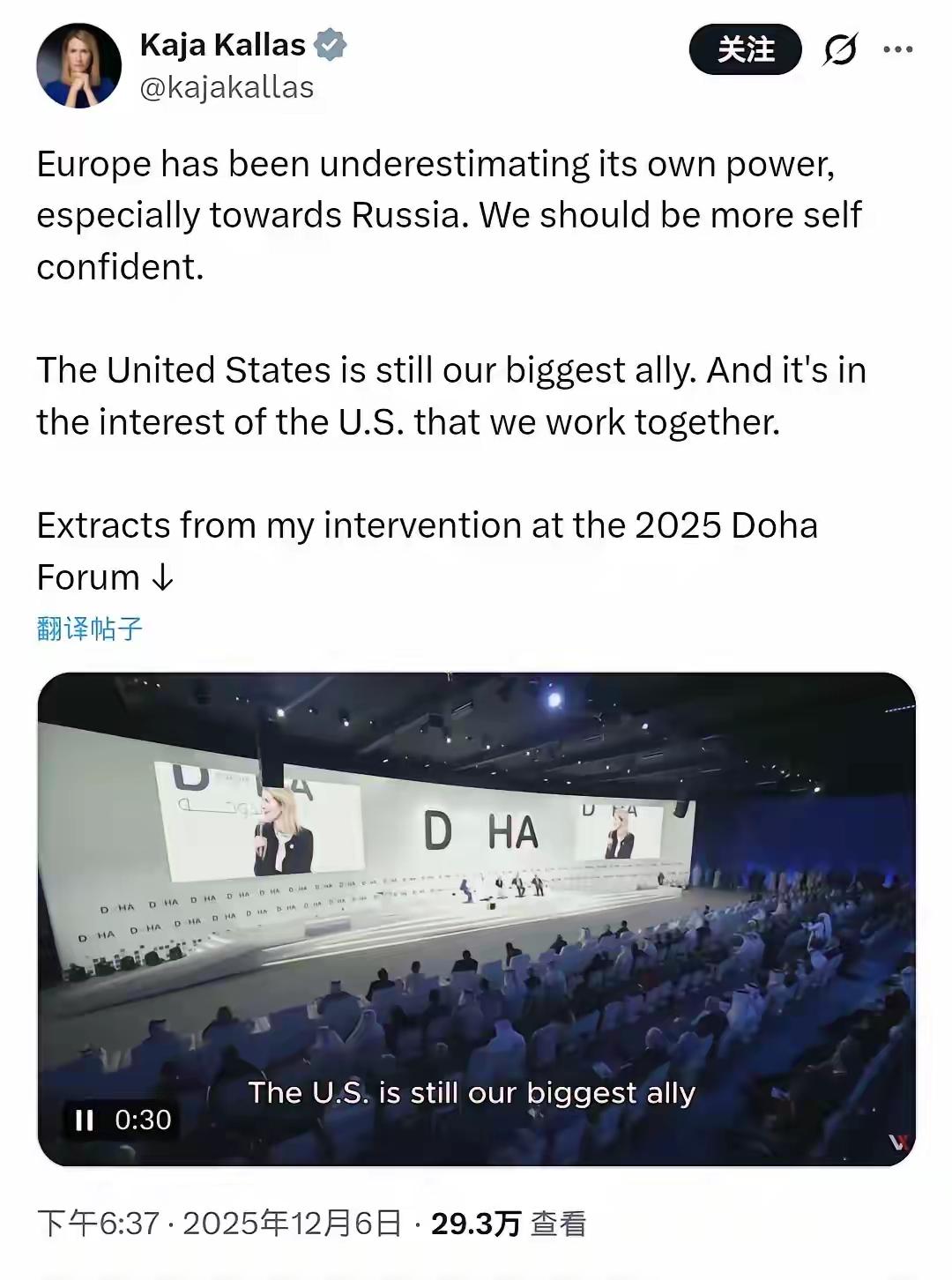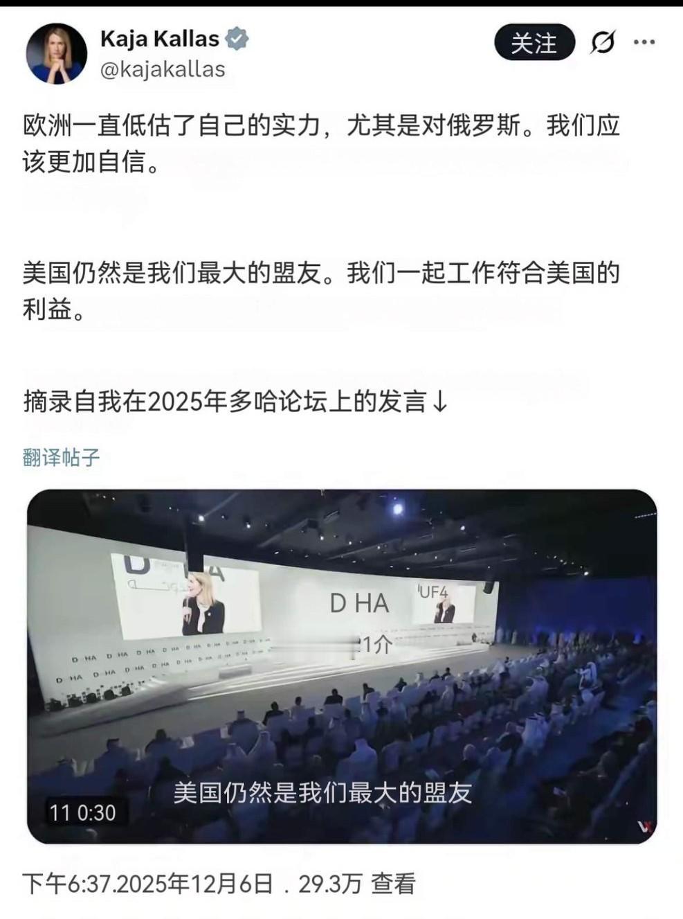 太搞笑了! 美国最新的《美国国家安全战略》白纸黑字的把欧洲定义为“文明正在消亡”的地区,并要求欧洲在2027年前接手北约大部分常规防务。作为欧盟外交与安全政策高级代表的卡娅•卡拉斯却说美国仍然是欧洲的最大盟友,欧美一起工作符合美国的利益。真怀疑这样的认知水平是怎么当上欧盟外长的!闹笑话也就不足为奇了!