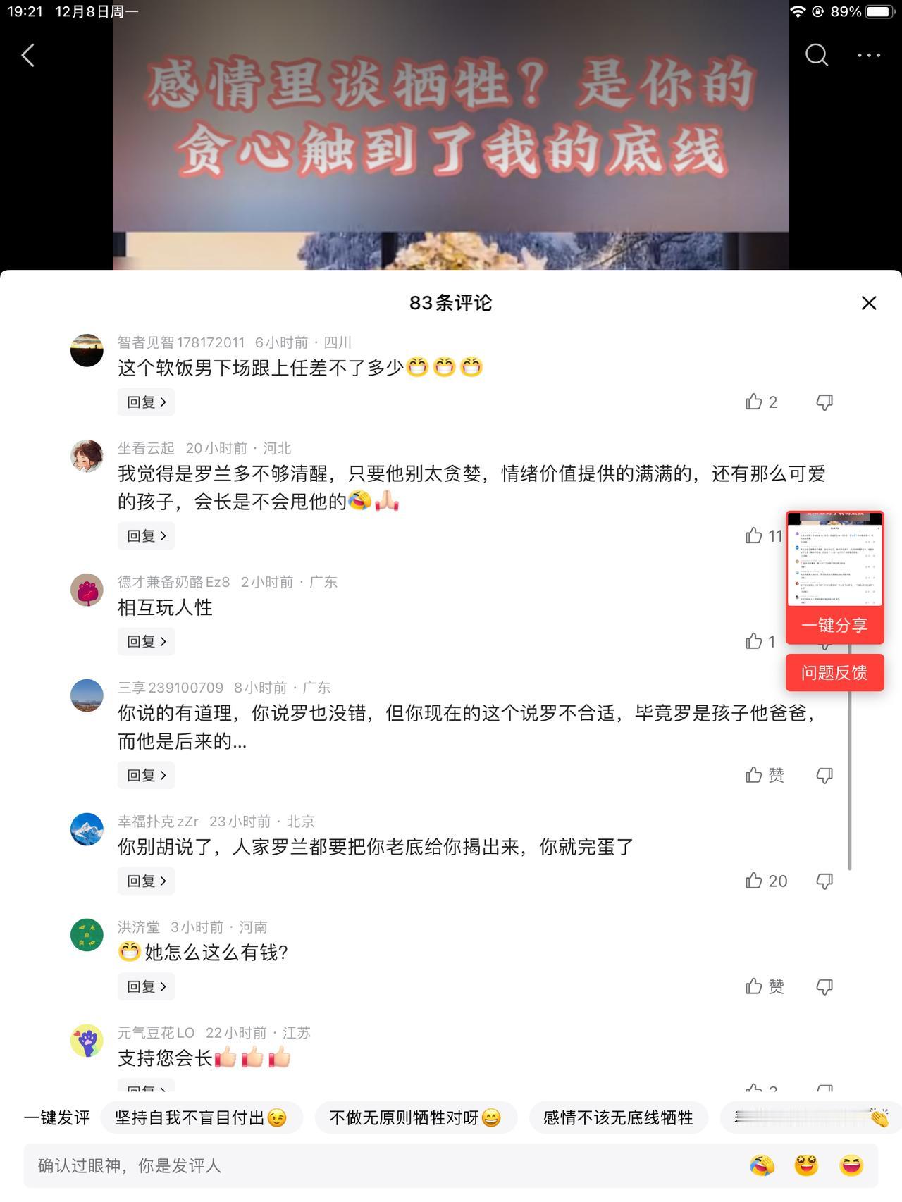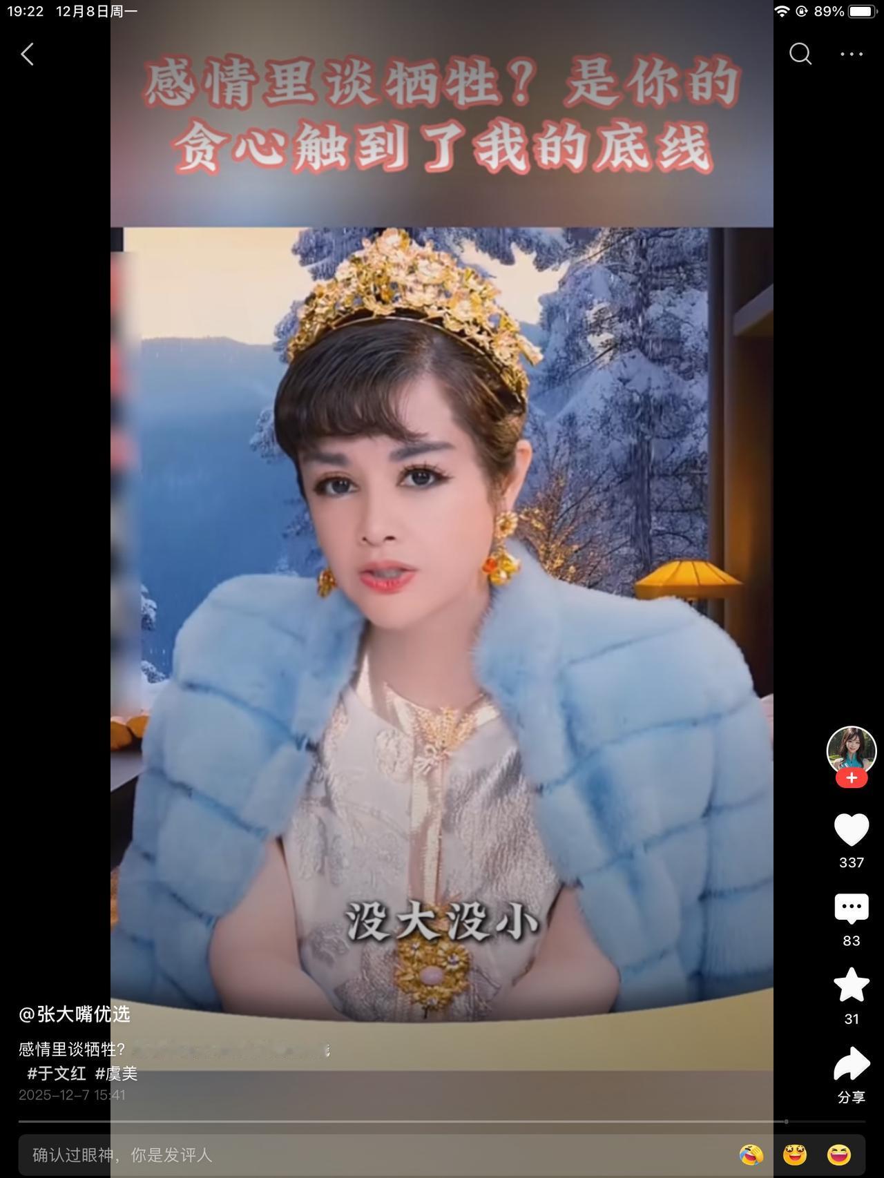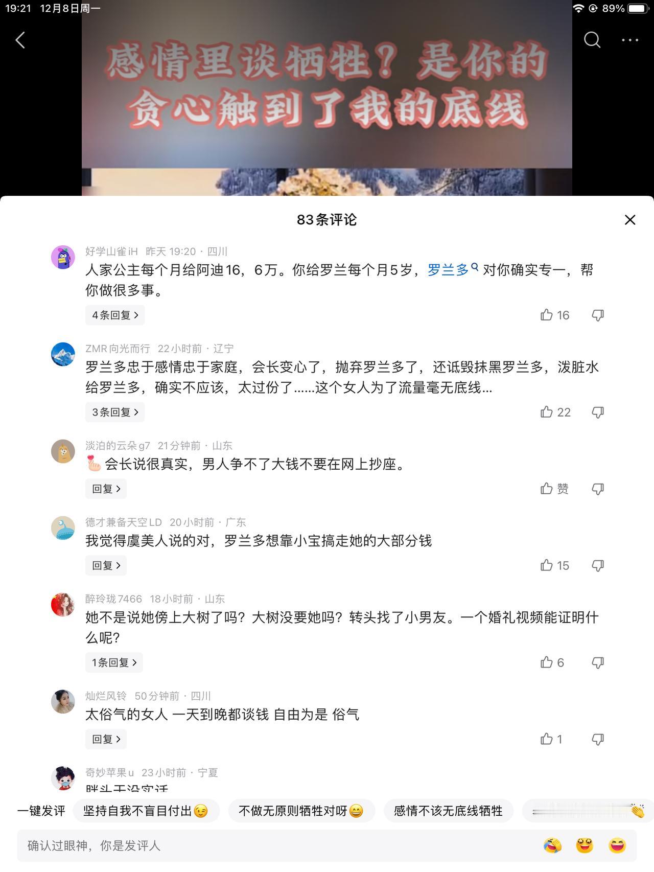 撕 比的时候,都说自己的好。你看哈,罗兰多说会长出轨了。这一听就是没摆正自己的位置。她俩没登记。和会长有个儿子,这是会长留情面给五万的前提。 其二,给的少不少。如果站在普通人的角度,五万不少了。但女大男小。也不多。但这男的家人确实生孩子多。怎么说呢?没有长远规划。没有国人的思维。 你听小任任,老六咋说的,我永远不会给你机会跟我撕,你撕我,我也不撕你,我就开直播说,我爱你我爱你哦我爱你。这脑子,这是软饭圣体啊!开课能赚钱的那种。 他还说,老大永远是第一位的,指的是于的大儿子。这觉悟,你不服都不行。你能拎的清,会长也高兴,一高兴,就给买东西。不用要,这其实不是变相的在要吗?人家灵啊!不要给的更多。 这他 妈我一辈子也学不会啊!我跟罗兰多的思维一样。先给钱,在办事。其实这些年,罗兰多干的少吗?而且没少给于大姐挡刀!当年她进去六个月,是罗兰多在打理。帮她隐瞒真相,打理公司。有功劳也有苦劳。但不能邀功。他不知道自己是在向金主要钱,你得有个低头的姿态。不能像杨修一样恃才放旷。要会服软,就是跪。这里面没有平等。表面上,是站着的,实际上,就是跪着把钱挣了! 小任任,真绝了。祖上肯定跟李莲英是近亲。那一套,天生的。盖了帽了,我的老北鼻。