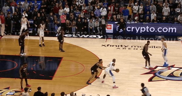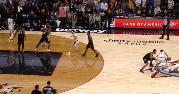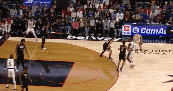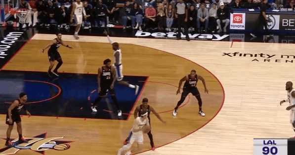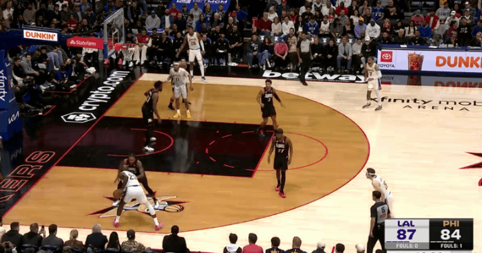詹姆斯末节收割比赛的细节:阅读防守&与东里的联动&战术执行图1边线球回合,詹姆斯借助文森特的“Cross Screen”起手到左侧低位接球,格莱姆斯给延误、沃克在詹姆斯接球前就迅速归位,没能成功制造错位,于是老詹低位拿球单打沃克:图2背身接球等待队友完成跑位后转面框,刺探步调动沃克防守重心,格莱姆斯见老詹使用刺探步立即从弱侧45°上前执行“延迟夹击”。对于詹姆斯而言,这种回合就相当于“送空位”,见招拆招:赶在格莱姆斯夹击到来、弱侧麦凯恩轮转到位之前,就直接找到弱侧空位的文森特。图3里夫斯上线持球操刀“Double Drag”拒绝掩护走左路突破没出机会,随后再回给詹姆斯发动第二波边路挡拆配合。老詹接球后下球突破处理短下顺,吸引恩比德防守注意力后立即为幽灵区埋伏的艾顿送上空接,打穿恩比德身后。图4里夫斯要到麦凯恩错位,老詹立即与其发动挡拆配合,扎实的掩护挂住麦凯恩后立即转身观察里夫斯的动向并抓身位优势顺下,接里夫斯口袋传球下球调整后直接起步,隔着篮下的恩比德起跳滞空终结。图5和里夫斯的边路挡拆二人转没出机会,随后高位背身拿球,八村趁格莱姆斯和回退篮下的恩比德不注意,立即执行溜底线的“后门切入”(Backdoor Cut),詹姆斯人到球到、精准制导。图6东契奇和艾顿挡拆配合,老詹站弱侧接应,东契奇挡拆行进间见乔治回收中路垫防、延阻艾顿顺下立即回给弱侧接应的老詹,詹姆斯接球见乔治留出投篮空间踩线三分手起刀落。图7东契奇和艾顿的边路挡拆遭遇“ice”后出球给艾顿,艾顿接球处理多打少中转给弱侧45°接应的詹姆斯,詹姆斯接球迅速调整后三分线外一步抬手就进。图8,“Ram Flip”:“Ram Screen”的变种,詹姆斯借助里夫斯“下掩护”(Pin Down)上提后没有按照“Ram Screen”的原本环节直接衔接和卢卡的挡拆配合,而是与卢卡衔接“Flip”配合,随后迅速“Slip”假挡快拆至三分线,接遭遇双人夹击的东契奇的回传,三分手起刀落。图9、10和东契奇LOGO位置的挡拆起手,换走乔治、要到格莱姆斯错位:接球后三威胁起手,不断调动格莱姆斯防守重心,右脚向右前方蹬地后立即启动交叉步左路突破,行进间沉肩对抗撞开格莱姆斯,随后迅速衔接左手炸球合球后的撤步中投。稳稳命中后110-105——既保证了进攻成功率,也成功压缩了时间。图11马克西命中超级极限后仰三分、东契奇两罚命中后,詹姆斯预判传球路线抢断彻底杀死比赛:最后防守回合湖人执行无限换防,恩比德借助VJ无球掩护起手再给格莱姆斯设置“Away Screen”。詹姆斯刚准备要换防到恩比德,但看到格莱姆斯要借掩护上提接球,直接识破了76人战术意图,立即执行换防的同时冲刺上前,成功预判传球路线完成抄截——最长的河流的经验与判断。洛杉矶湖人詹姆斯杀死比赛詹姆斯王冠重新戴起