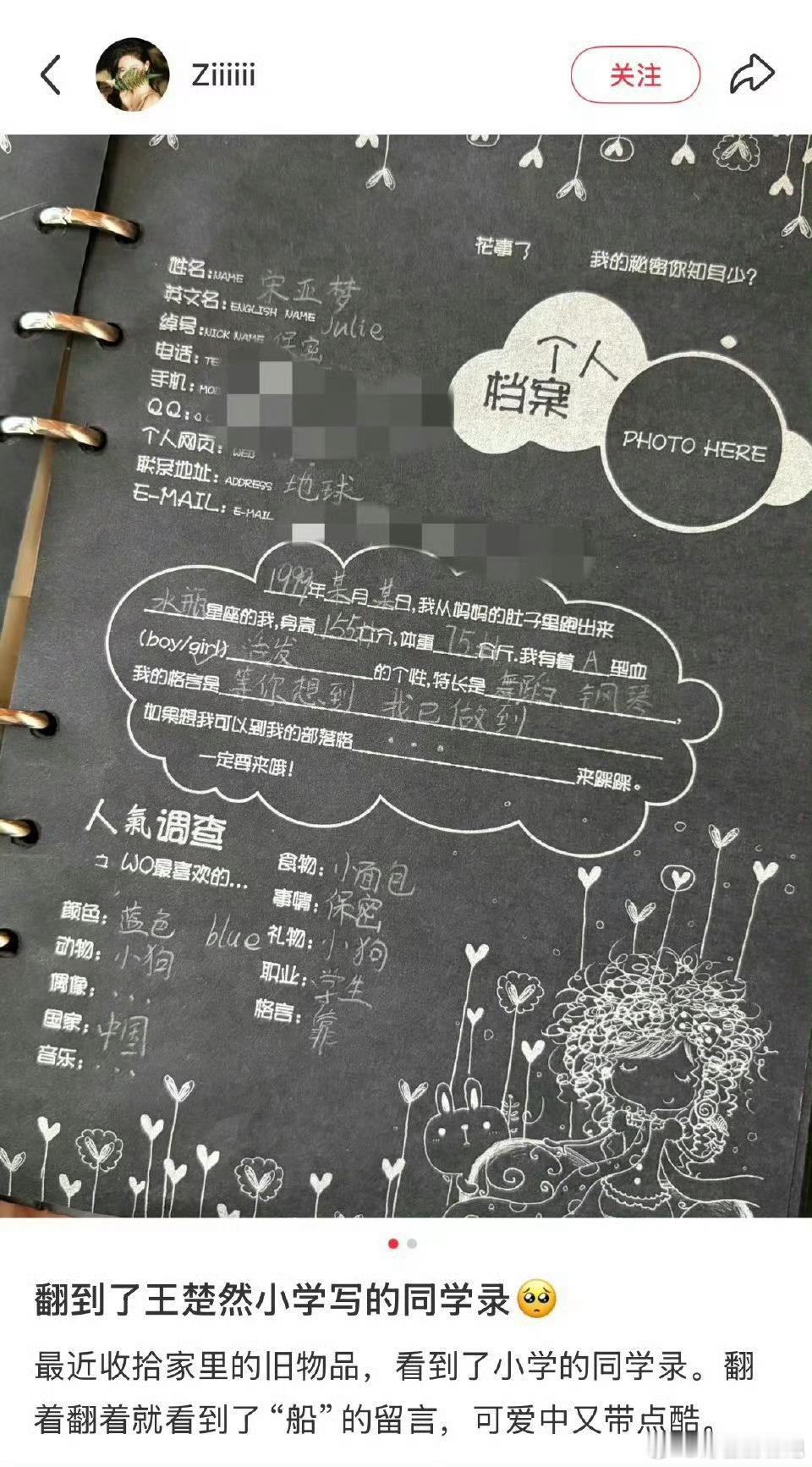 王楚然小学写的同学录王楚然打小就是搞笑女来的吧地址:地球,格言“靠”,果然每个人都有中二时期