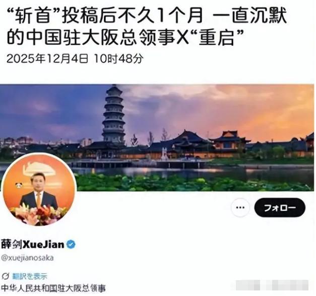 沉默1个月后,中国驻大阪总领事再度发文,没威胁高市,薛剑作为中国驻大阪总领事,却遭到了日本民众的围攻,这已经不是一件单纯的政治外交事件,而是日本右翼有意对中国的围攻,此前薛剑的“斩首”发言让其遭到了日本的围攻,薛剑并未指名道姓,只是说了想说的话,但是有些人却对号入座十分生气,日本右翼借此炒作,直接把薛剑列入了不受欢迎名单。   2025年12月4号那天,中国驻大阪总领事薛剑的西方社交媒体账号突然有了新动静,没有那种特别激烈、火药味十足的话,也没有用什么表情符号来渲染情绪,就只是转发了中国驻日大使吴江浩关于“一中原则”的阐述。 还配上了贵州乡村早晨的雾气、吉林林海冬天的雪景,这个已经整整一个月没更新的账号,就这么平平淡淡地,完成了一次特别受关注的“重新露面”。 要理解这次“重新露面”为何如此特别,就得把时钟拨回到一个月前。当时,薛剑在一次发言中用了“斩首”这个词,虽然没有指名道姓,但话音刚落,就像往平静的湖里扔了一块巨石,瞬间在日本激起了千层浪。 日本的一些右翼势力像是找到了靶子,迅速抓住这个话柄,大肆炒作,将薛剑的个人言论上升到对整个国家的“威胁”。一时间,各种批评、围攻的声音铺天盖地而来,甚至有人直接给他贴上了“不受欢迎人物”的标签。这已经超出了正常外交交锋的范畴,更像是一场精心策划的舆论围猎,目标直指中国。 在那之后的一个月里,薛剑的账号陷入了沉寂。这一个月,外界充满了各种猜测。有人认为他是被按下了暂停键,有人觉得这是中方在冷处理,避免事态进一步升级。那段时间,日本右翼的攻击并未停歇,仿佛在用这种沉默来印证他们所谓的“胜利”。 然而,外交的博弈从来不是看谁的声音大,也不是看谁暂时退让。这一个月的静默,更像是一场太极推手,看似后退,实则是在积蓄力量,观察对手的每一个动作。风波的中心人物暂时隐去,但中日之间那根紧绷的弦,却一刻也没有放松。 那么,一个月后的这次回归,又传递了什么信号呢?这就有意思了。他没有选择用激烈的言辞去回击,也没有对之前的争议做任何解释。 他只是默默地转发了大使的推文,内容是“一中原则”——这是中国外交政策中不可动摇的底线,是原则问题,没有任何妥协的余地。 这个动作本身,就是一种表态:我可以不跟你争论细节,但我的核心立场,坚如磐石。这是一种无声的宣告,比任何辩解都更有力量。 而那两张风景照,更是神来之笔。贵州的雾,吉林的雪,展现的不是咄咄逼人的气势,而是一种深沉、辽阔和宁静的美。这是一种文化上的自信,一种“此时无声胜有声”的东方智慧。它仿佛在告诉外界,中国的内涵远比你们想象的要丰富和深远。 我们不仅有坚定的政治立场,更有壮丽的山河和深厚的文化。当别人在泥潭里打滚时,我们选择站在山巅,看云卷云舒。这种格局上的降维打击,让那些喧嚣的攻击显得格外渺小和苍白。 薛剑的这次“回归”,可以说是一次教科书级别的外交沟通案例。它巧妙地将一场政治风波,转化为一次文化展示和立场重申。他没有陷入对方设置的议题陷阱,而是用自己的方式,重新定义了对话的语境。 这既是对之前围攻的一种回应,也是对未来中日关系走向的一种暗示:对话可以,但必须在尊重彼此核心利益的基础上进行。这种以柔克刚的方式,或许比硬碰硬更能达到效果。这件事也让我们看到,在当今这个信息爆炸的时代,外交的形式正在变得越来越多样化。 有时候,一张图片,一次沉默,一次转发,其蕴含的信息量,可能远超一篇千字长文。那么,你认为这种“安静”的外交方式,在处理复杂的国际关系时,真的能比激烈的言辞更有效吗?