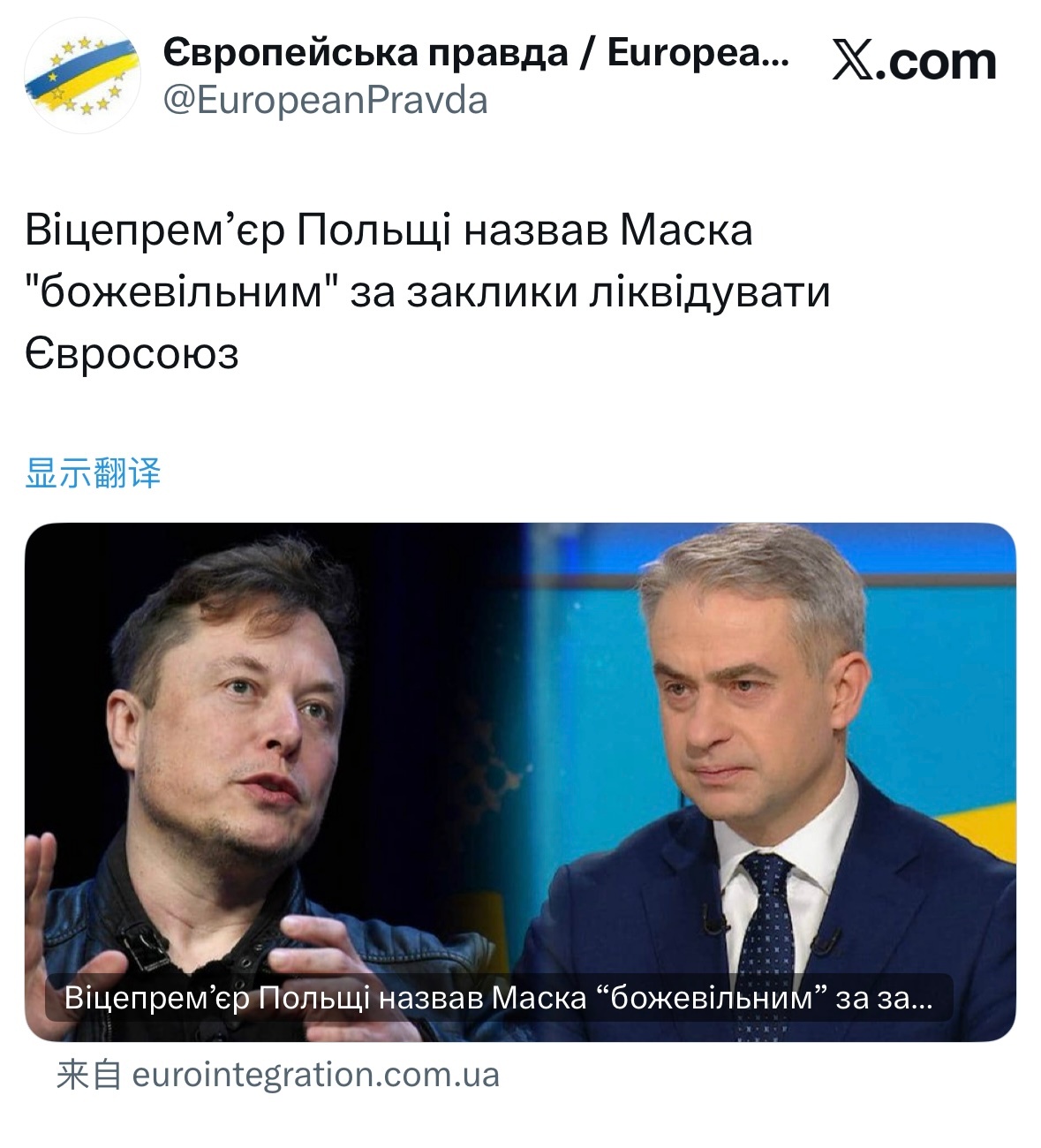 乌克兰UA 波兰副总理称马斯克呼吁解散欧盟是“疯了”关注俄乌局势最新进展俄乌局