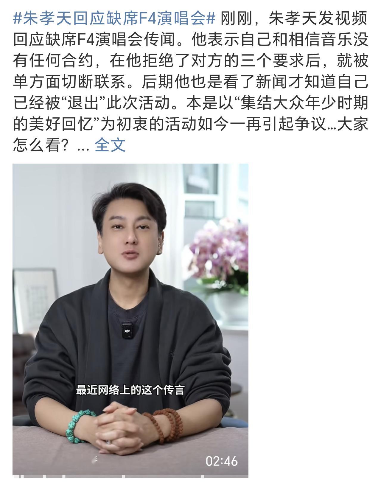朱孝天回应缺席F4演唱会一边说着自己拒绝了相信音乐的邀请,一边又说被退出,然后又说期待合作,可真的太拧巴了 朱孝天看到新闻才知道自己被退出