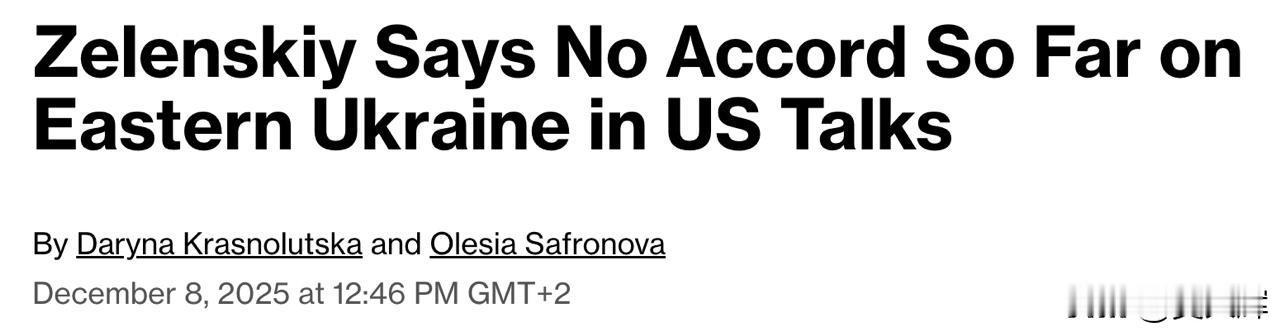 【泽连斯基终于承认:领土问题致谈判陷入僵局】12月8日,泽连斯基在接受彭博社采访时表示,“美国、俄罗斯和乌克兰各方均有自身立场,而我们在顿巴斯问题上尚未达成共识。”乌克兰同时坚持要求与西方盟友(首先是美国)单独签署安全保障协议。