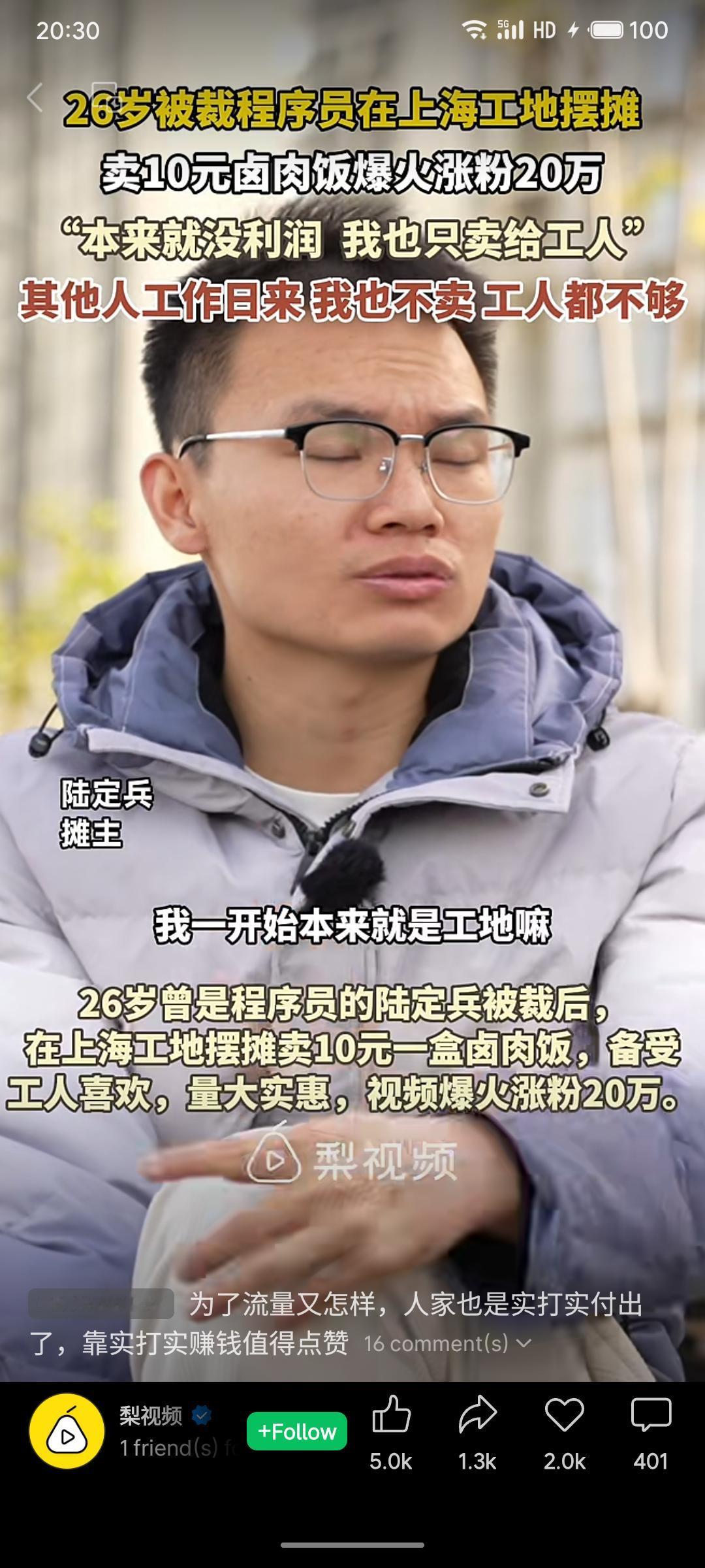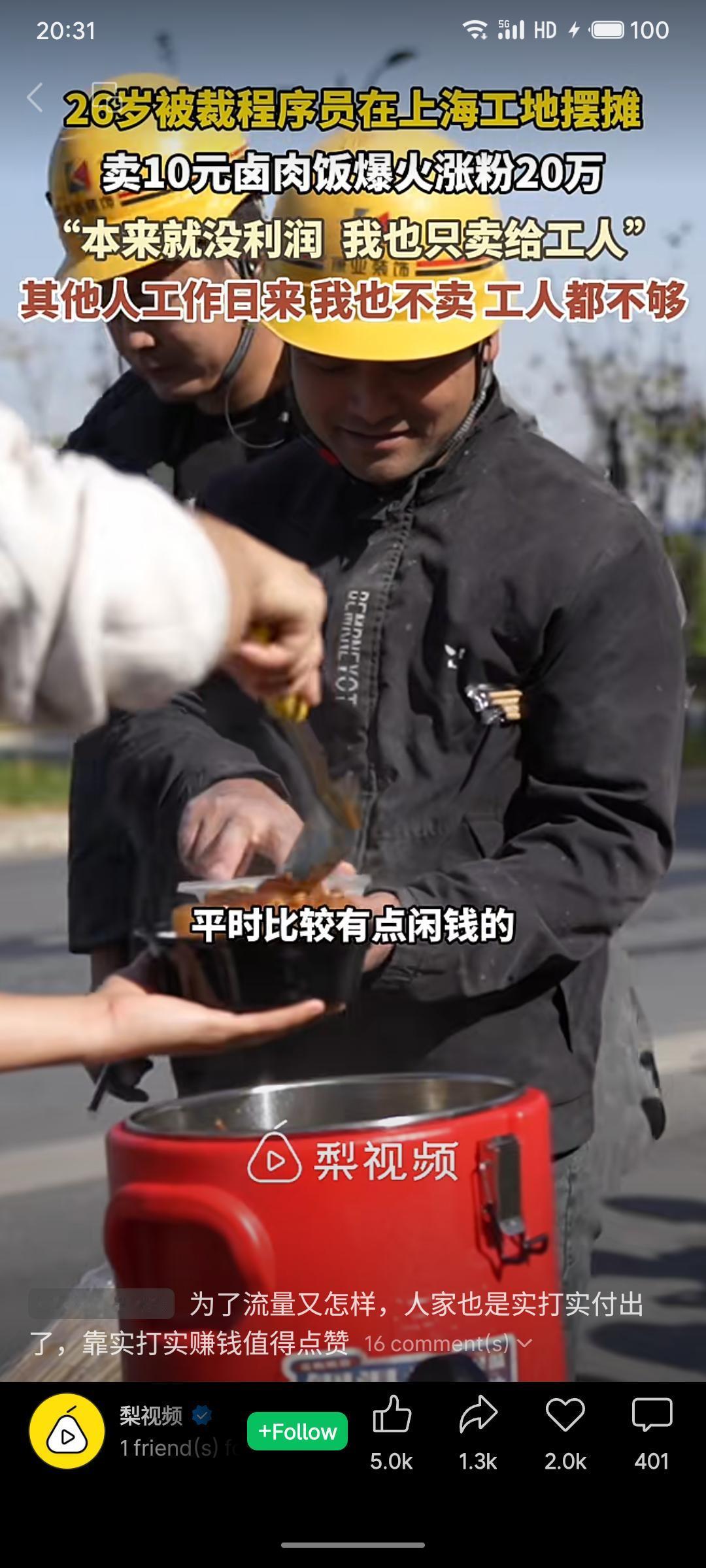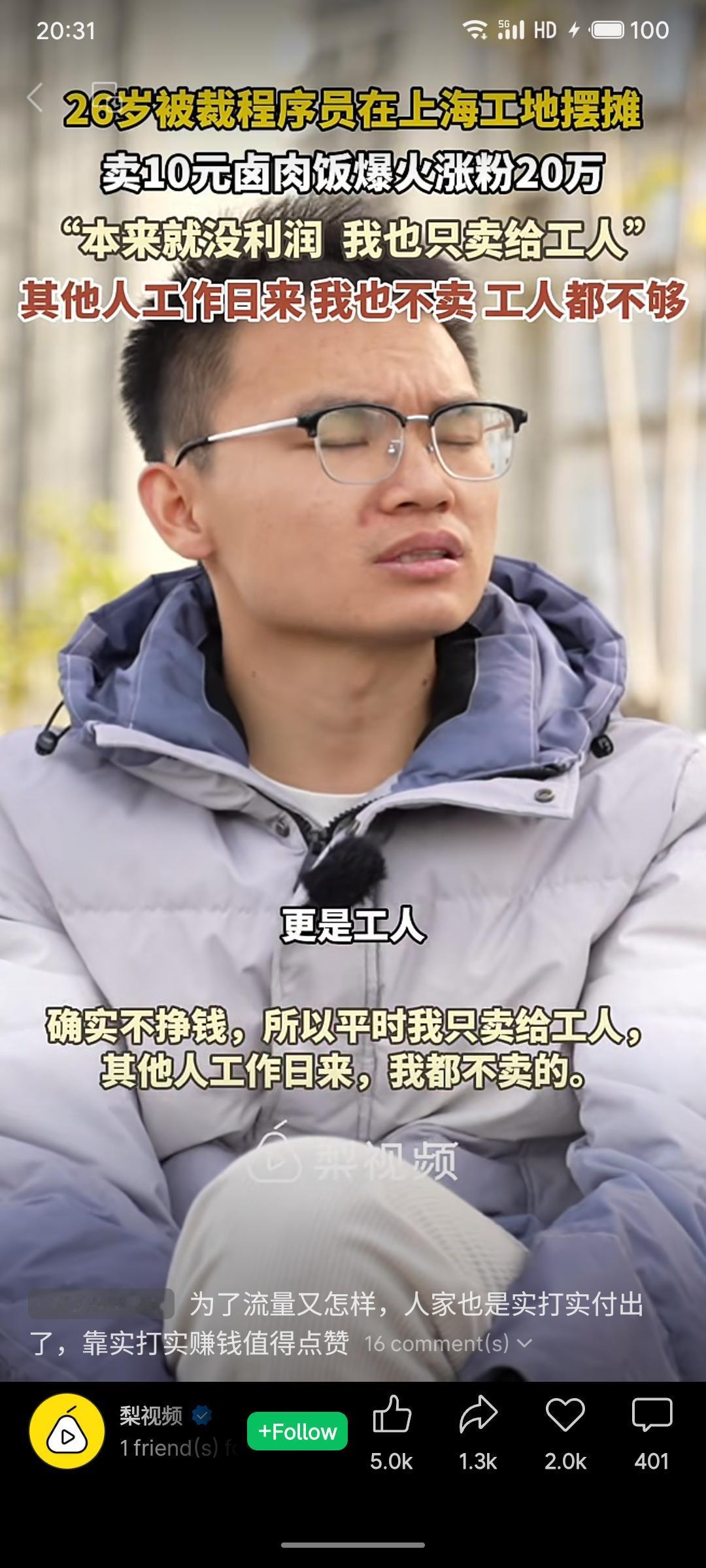 26岁被裁程序员在上海工地摆摊,专供工人10元卤肉饭,因量大实惠走红网络,涨粉20万。他坚持只卖给工人,称几乎无利润,获赞“实打实赚钱”。
