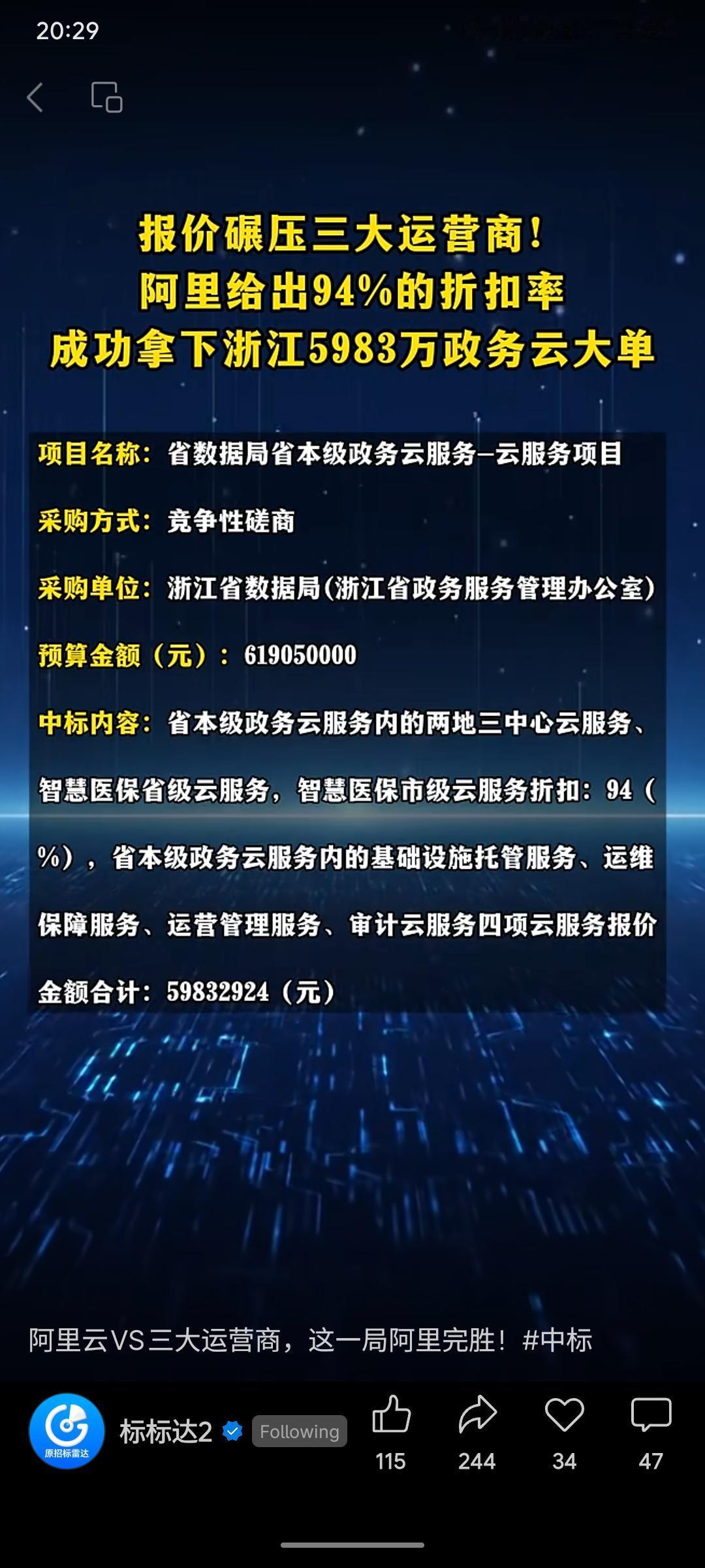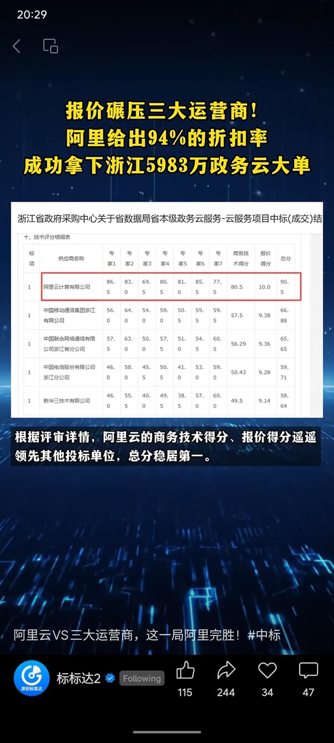 阿里云以94%的高折扣报价,击败三大运营商,成功中标浙江省数据局近6000万元的政务云服务项目。其在商务技术及报价评分中均大幅领先。