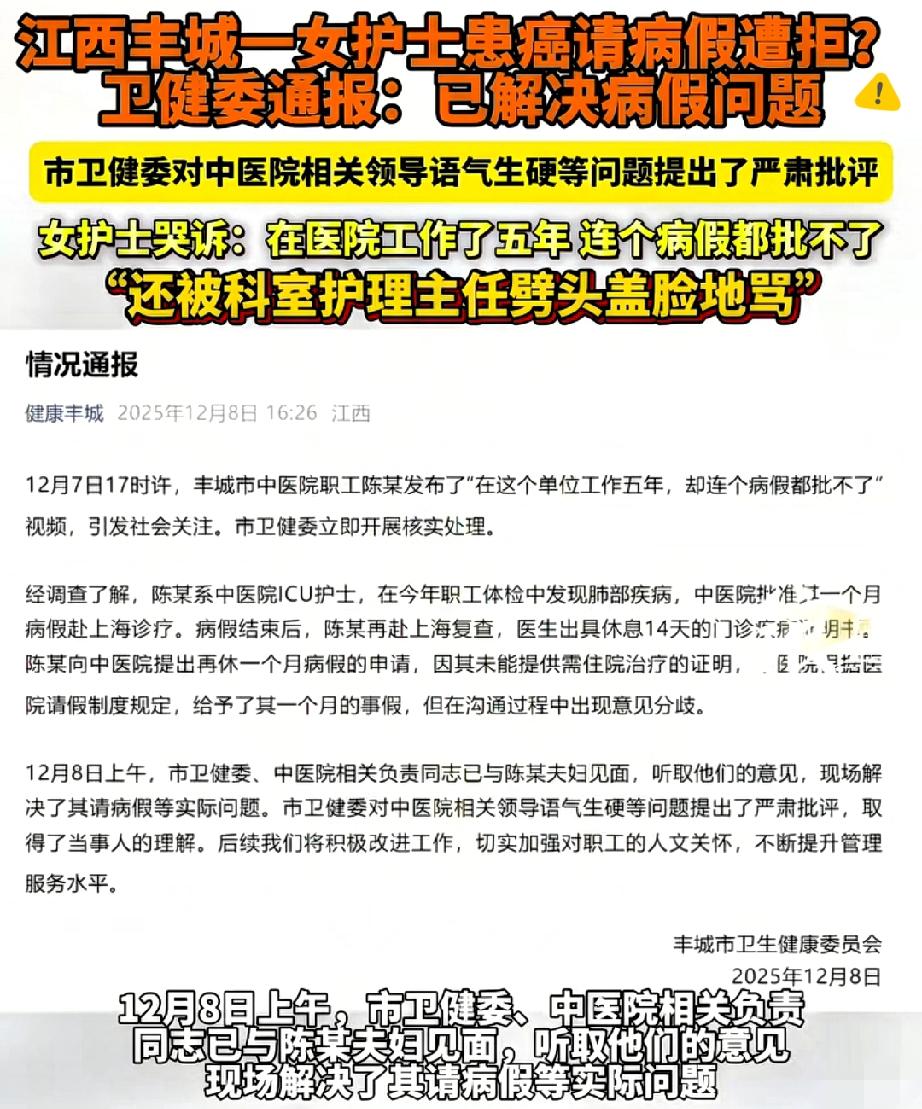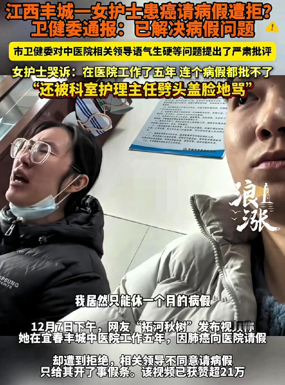 真的离谱到刷新认知! ICU护士五年熬夜加班救死扶伤,查出肺癌要手术,拿着门诊病假条请假却被医院说“不算数”,只能批事假? 最扎心的是她得知患癌都没哭,为一张病假条却哭到崩溃。 法律明明规定,工作五年的职工能享六个月医疗期,医院却拿“内部规定”当挡箭牌,忘了医护人员也是需要被呵护的普通人。 还好卫健委介入后解决了问题,但这事儿根本不是“误会”那么简单—— 制度是死的人是活的,连医院都不懂共情病痛,还谈什么救死扶伤? 你们觉得职场里的“人性化”,该怎么平衡规则和人情?