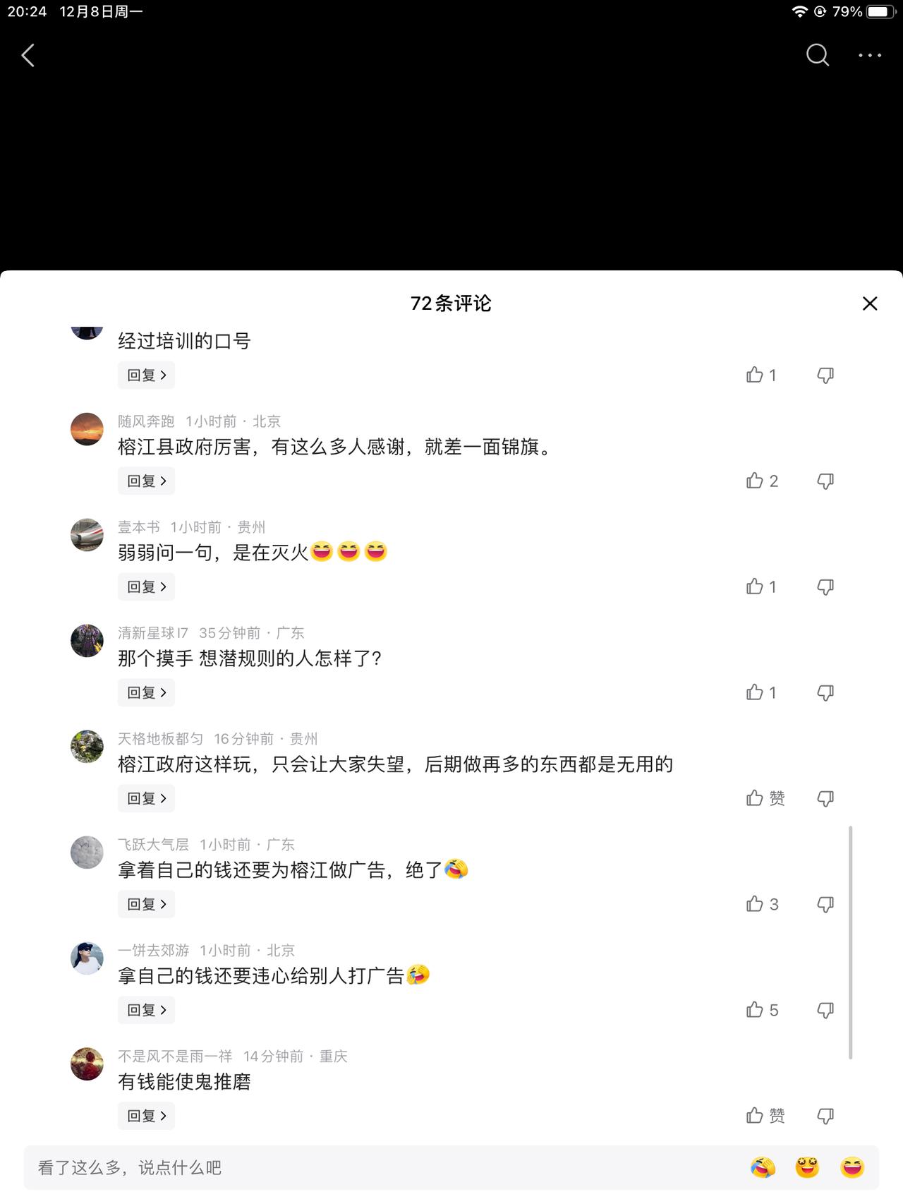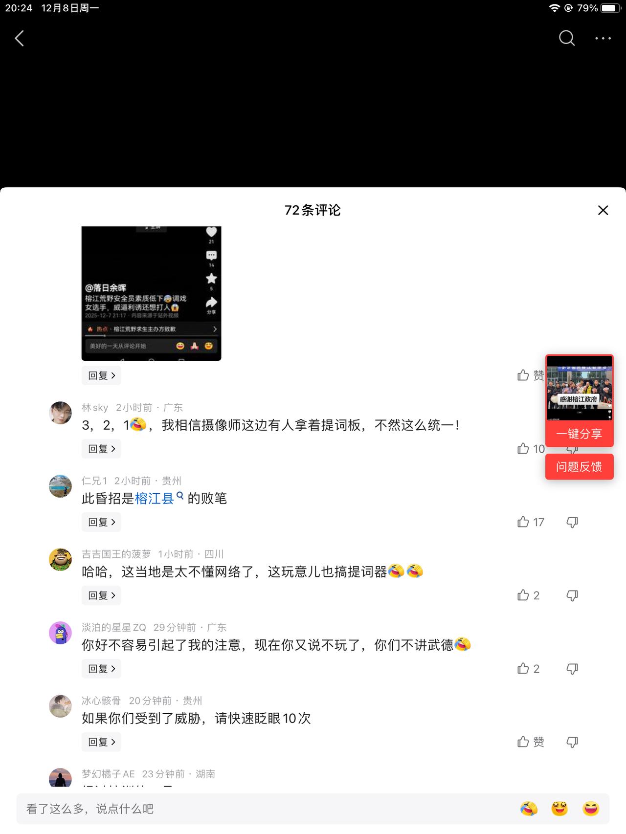 榕江不仅有村超,还有能人啊!榕江荒野求生这事儿结束了,发了报名费和路费。看手里那一沓子钱应该是翻倍了,给到位了,大家都满意了。 这出戏,没办法,但顺利结束了,各回各家各找各妈吧! 摸手的,偷塞大米的,兜里有火腿肠的,都闭嘴得了。这么大的榕江,丢不起那人了。散了散了! 提词器的字肯定是挺大的,离得这么远也能看到。费心了!手心手背都是肉,谁的脸也不能打。给了钱,给榕江打打广告。钱到位了!叫 大 爷都行。
