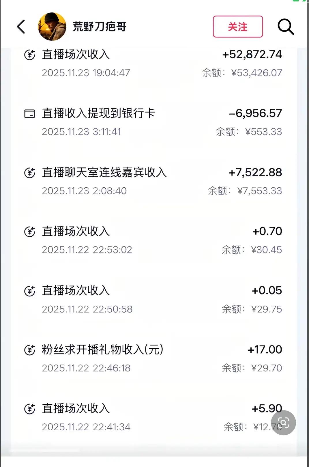刀疤哥真是个狠人。晒收益给大家看了,解散了粉丝群。307.万,到手只有30几几个。终于知道了土豪的钱原路返回,底层的钱,一分为二,在扣税。你想想是不是这么个逻辑。要不然,怎么可能就这么多钱。 盖房子差不多够了。还不如答应那个人,要盖房子的那个人,拉了那么多的家电赞助。直接就成了。这下子,只够盖房子的钱。不知道后续还开播了不开。这一段就过去了吗?对刀疤哥来说?