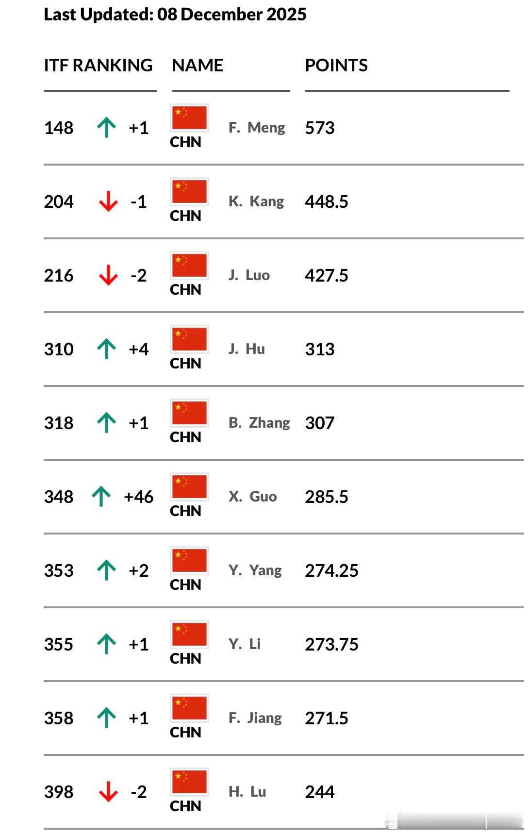 【ITF青少年男子排名】🇨🇳孟凡茗:148🇨🇳康凯高歌:204🇨🇳罗俊昊:216🇨🇳胡佳:310🇨🇳张博雄:318国内Top10 中 ,6人明年1.5清除排名 (2007年的)剩下四人:康凯高歌 2008年胡佳 2009年李彦宏 2008年 陆翰擂2009年目前男子后备情况 不太好网球talking大会