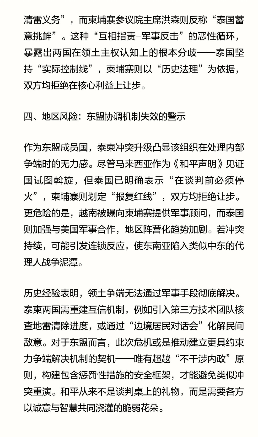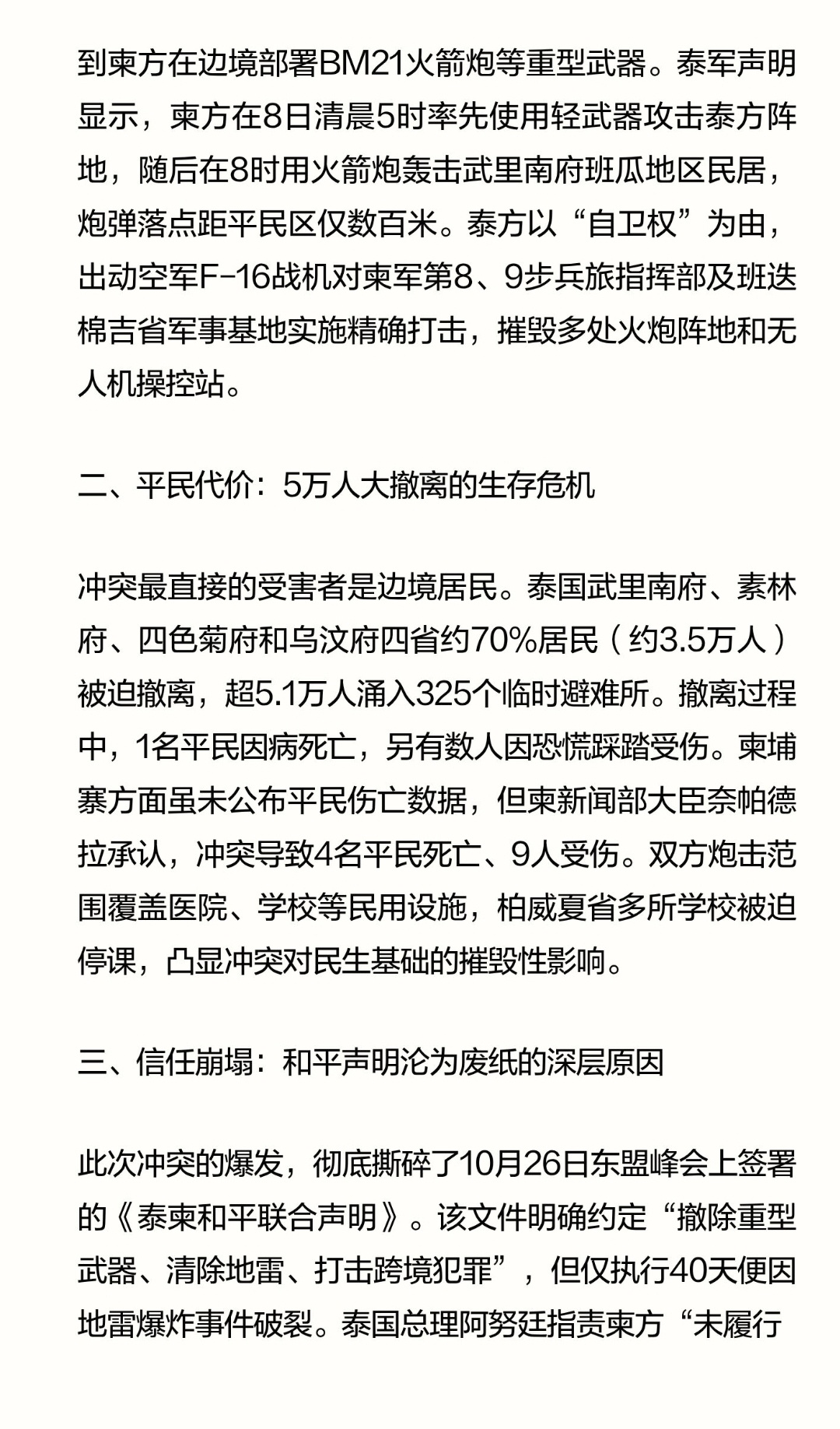 | 2025年12月8日,泰国陆军第二军区宣布,在当日6时至10时35分的冲突中,泰军成功摧毁柬埔寨多个关键军事目标,包括指挥所和火炮阵地。这一军事行动标志着泰柬边境持续数月的冲突正式升级,双方从局部摩擦转向系统性对抗,暴露出两国在领土争端、历史遗留问题上的深层矛盾。此次冲突的直接导火索是12月7日四色菊府的地雷爆炸事件,导致两名泰国士兵受伤。泰国政府随即暂停执行10月签署的《泰柬和平联合声明》,并于8日凌晨侦测到柬方在边境部署BM21火箭炮等重型武器。泰军声明显示,柬方在8日清晨5时率先使用轻武器攻击泰方阵地,随后在8时用火箭炮轰击武里南府班瓜地区民居,炮弹落点距平民区仅数百米。泰方以“自卫权”为由,出动空军F-16战机对柬军第8、9步兵旅指挥部及班迭棉吉省军事基地实施精确打击,摧毁多处火炮阵地和无人机操控站。泰国武里南府、素林府、四色菊府和乌汶府四省约70%居民(约3.5万人)被迫撤离,超5.1万人涌入325个临时避难所。撤离过程中,1名平民因病死亡,另有数人因恐慌踩踏受伤。柬埔寨方面虽未公布平民伤亡数据,但柬新闻部大臣奈帕德拉承认,冲突导致4名平民死亡、9人受伤。双方炮击范围覆盖医院、学校等民用设施,柏威夏省多所学校被迫停课,凸显冲突对民生基础的摧毁性影响。此次冲突的爆发,彻底撕碎了10月26日东盟峰会上签署的《泰柬和平联合声明》。该文件明确约定“撤除重型武器、清除地雷、打击跨境犯罪”,但仅执行40天便因地雷爆炸事件破裂。泰国总理阿努廷指责柬方“未履行清雷义务”,而柬埔寨参议院主席洪森则反称“泰国蓄意挑衅”。这种“互相指责-军事反击”的恶性循环,暴露出两国在领土主权认知上的根本分歧——泰国坚持“实际控制线”,柬埔寨则以“历史法理”为依据,双方均拒绝在核心利益上让步。作为东盟成员国,泰柬冲突升级凸显该组织在处理内部争端时的无力感。尽管马来西亚作为《和平声明》见证国试图斡旋,但泰国已明确表示“在谈判前必须停火”,柬埔寨则划定“报复红线”,双方均拒绝让步。更危险的是,越南被曝向柬埔寨提供军事顾问,而泰国则加强与美国军事合作,地区阵营化趋势加剧。若冲突持续,可能引发连锁反应,使东南亚陷入类似中东的代理人战争泥潭。历史经验表明,领土争端无法通过军事手段彻底解决。泰柬两国需重建互信机制,例如引入第三方技术团队核查地雷清除进度,或通过“边境居民对话会”化解民间敌意。对于东盟而言,此次危机或是推动建立更具约束力争端解决机制的契机——唯有超越“不干涉内政”原则,构建包含惩罚性措施的安全框架,才能避免类似冲突重演。和平从来不是谈判桌上的礼物,而是需要各方以诚意与智慧共同浇灌的脆弱花朵。