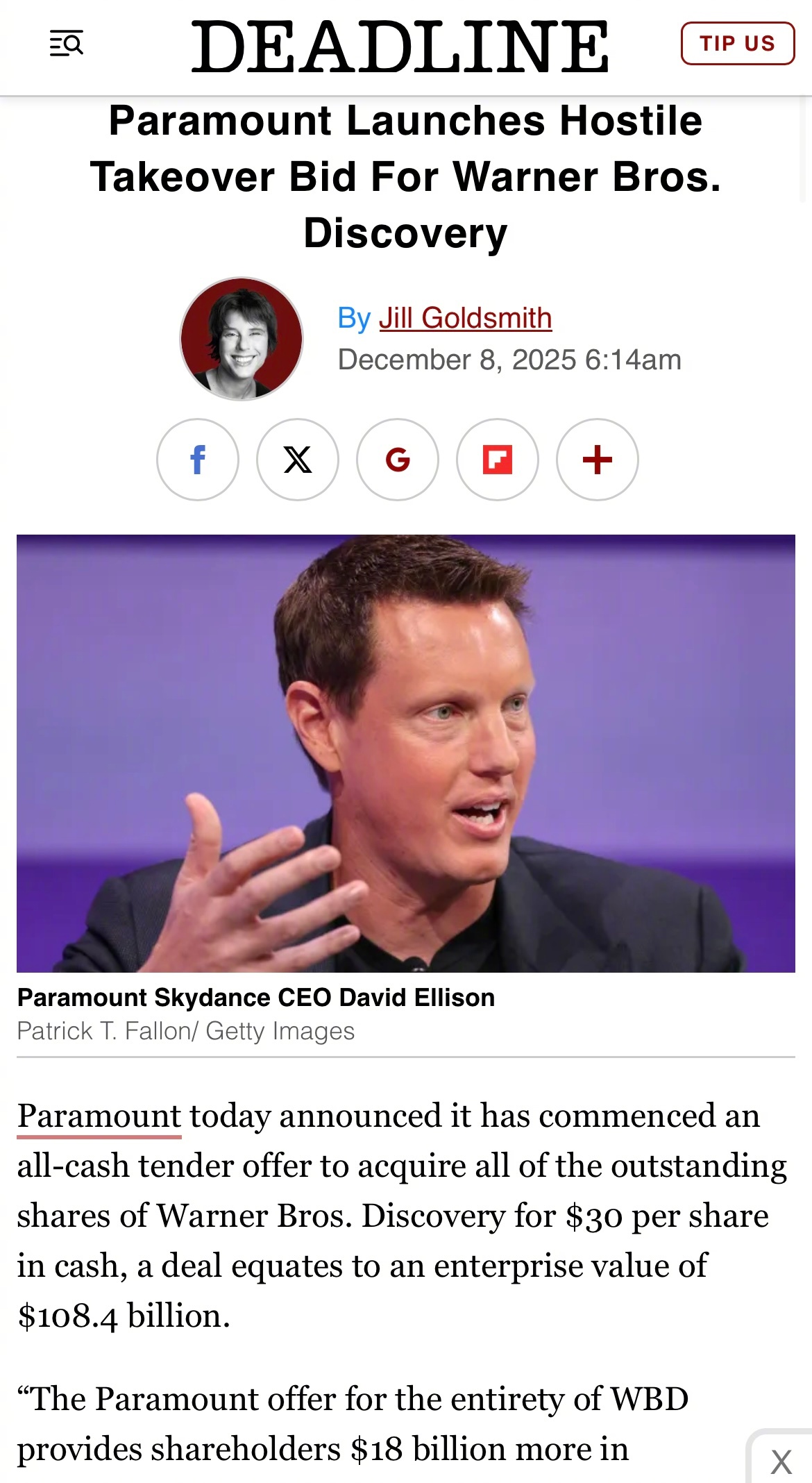 派拉蒙决定出手了,30美金一股,总计1084亿美金,要跟Netflix抢华纳。来自deadline的消息派拉蒙公司今日宣布,已正式发起全现金收购,计划以每股30美元的现金价格,收购华纳兄弟探索的所有流通股。这笔交易的企业价值估值约为1084亿美元。