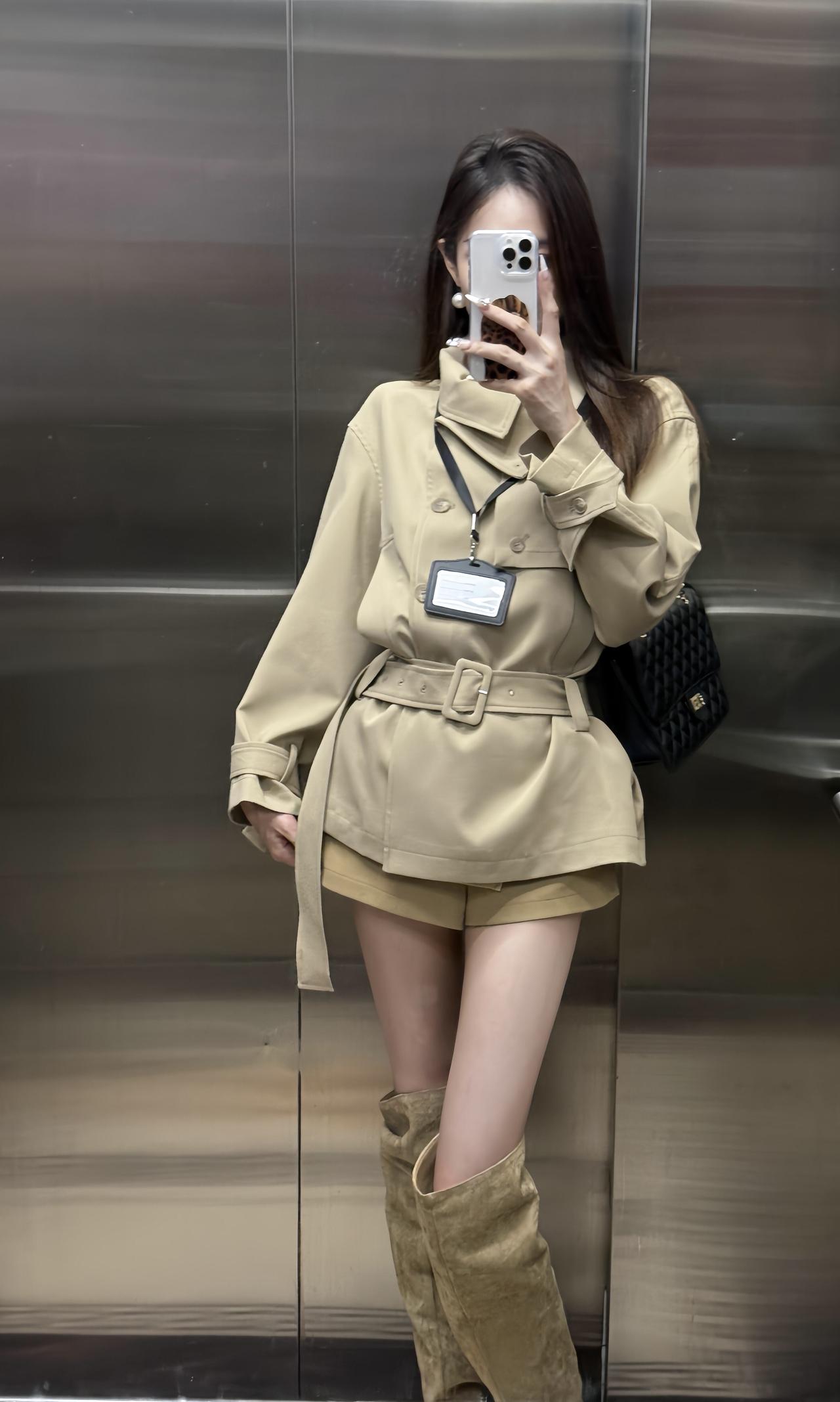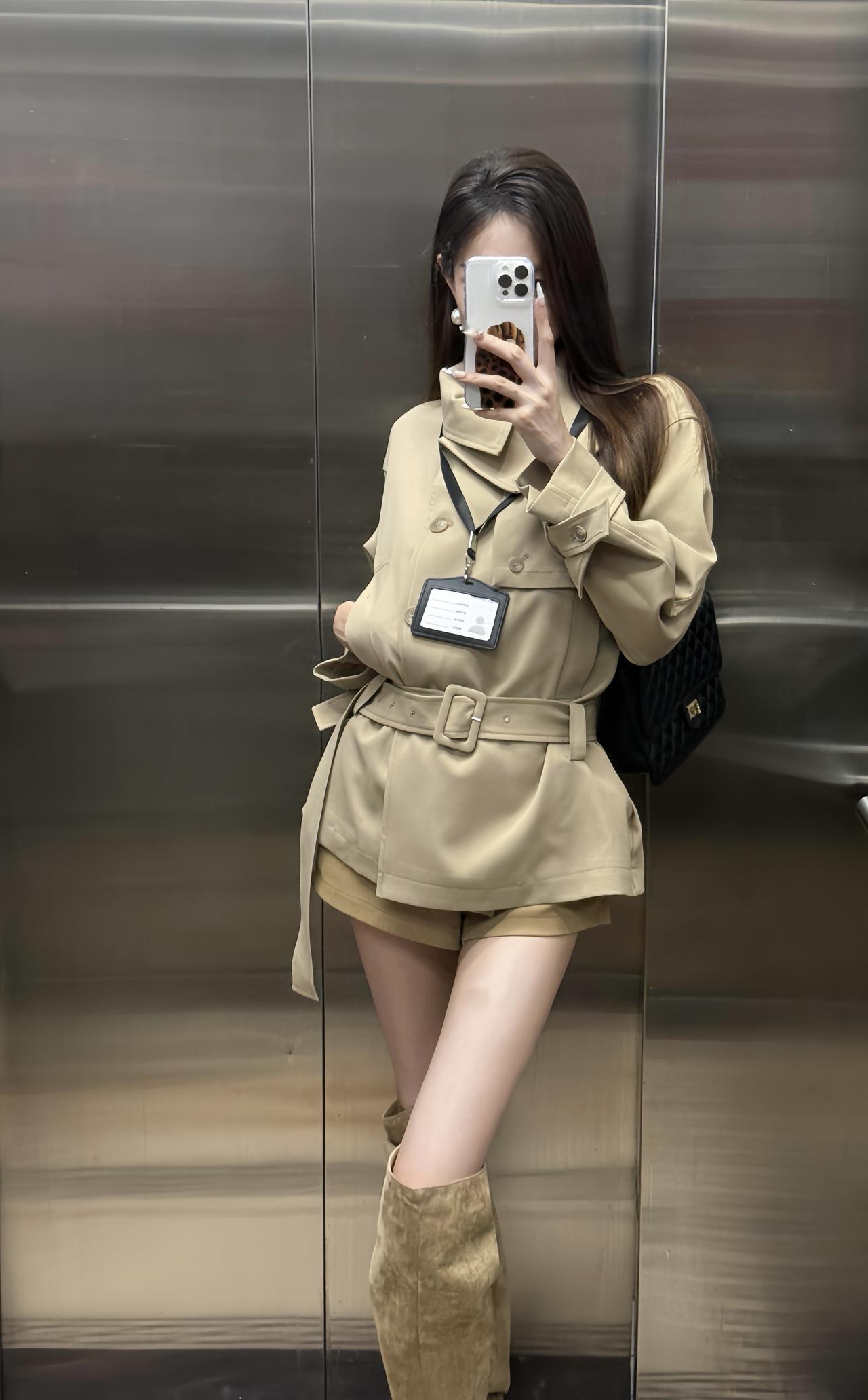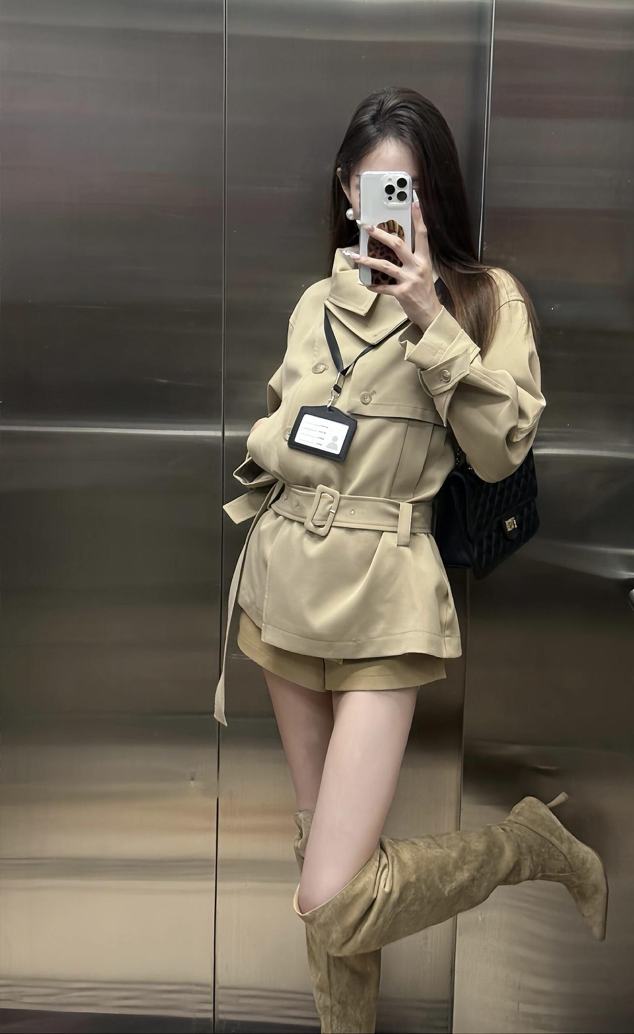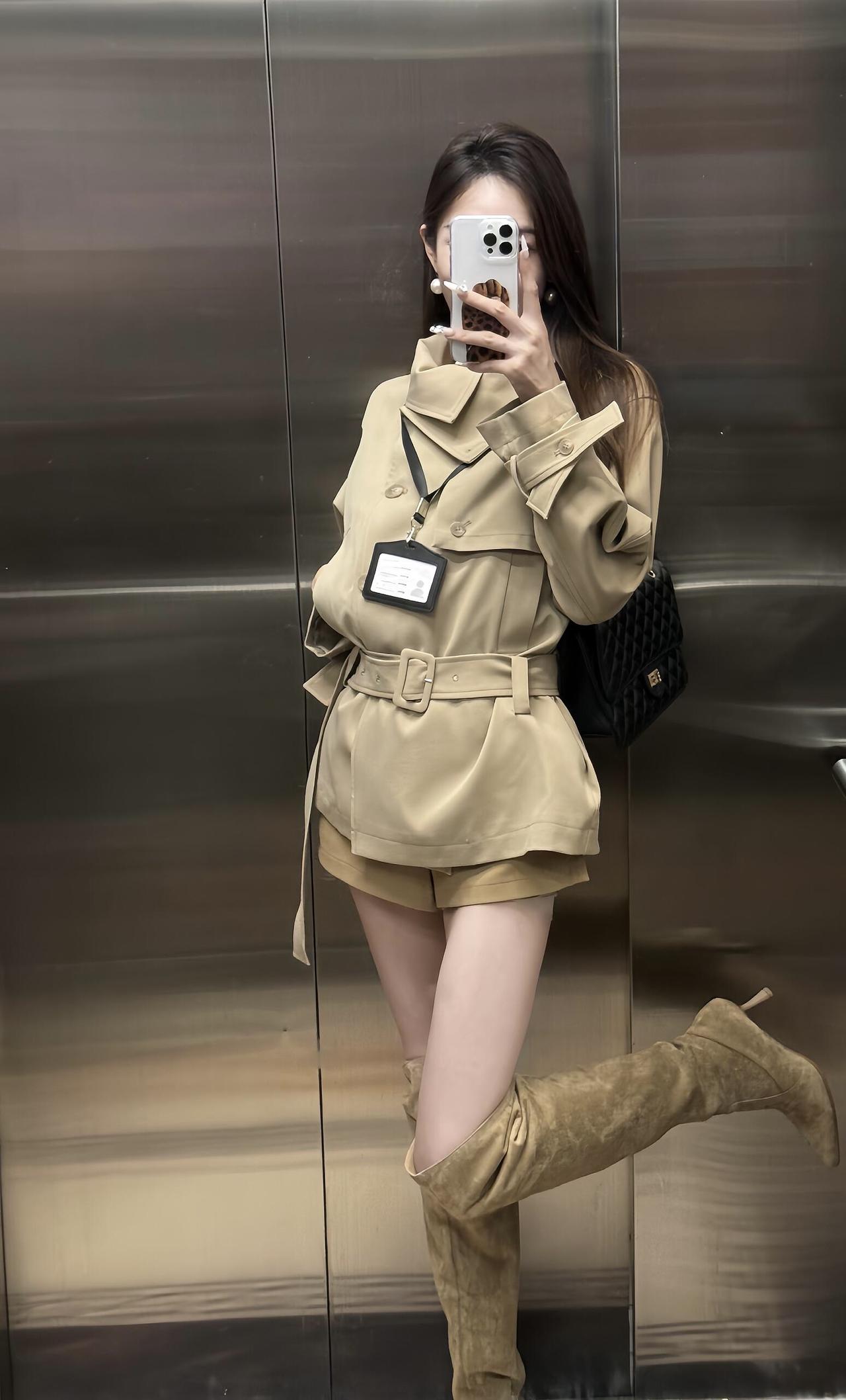 今日穿搭推荐是轻熟风通勤,整体协调又有细节亮点: 单品组合:浅卡其短款风衣(配腰带收腰)+同色系短裤+过膝长靴,搭配黑色链条包,既保留了风衣的干练,又用短裤、长靴增加了随性和时尚感。 风格特点:浅卡其色系统一显高级,收腰设计优化比例,长靴修饰腿型,是“通勤不刻板、休闲不轻浮”的适配款。 适合的场合: 日常通勤、逛街、轻社交场合、轻度商务场合:整体穿着既得体又不会显得过于严肃。