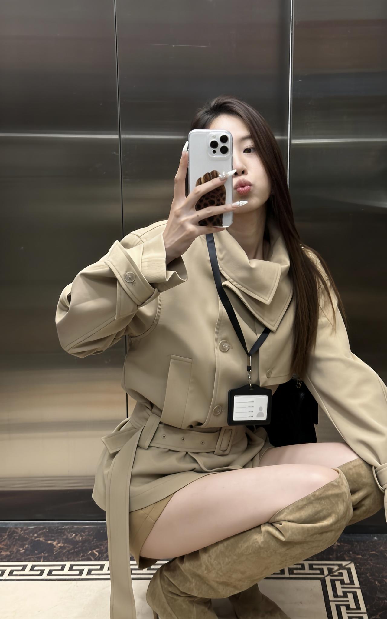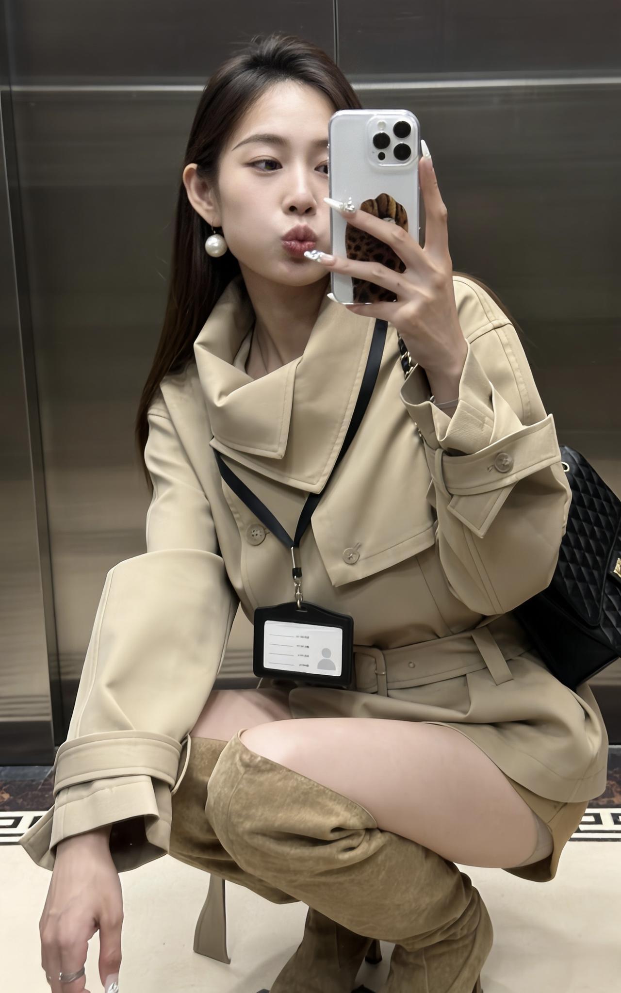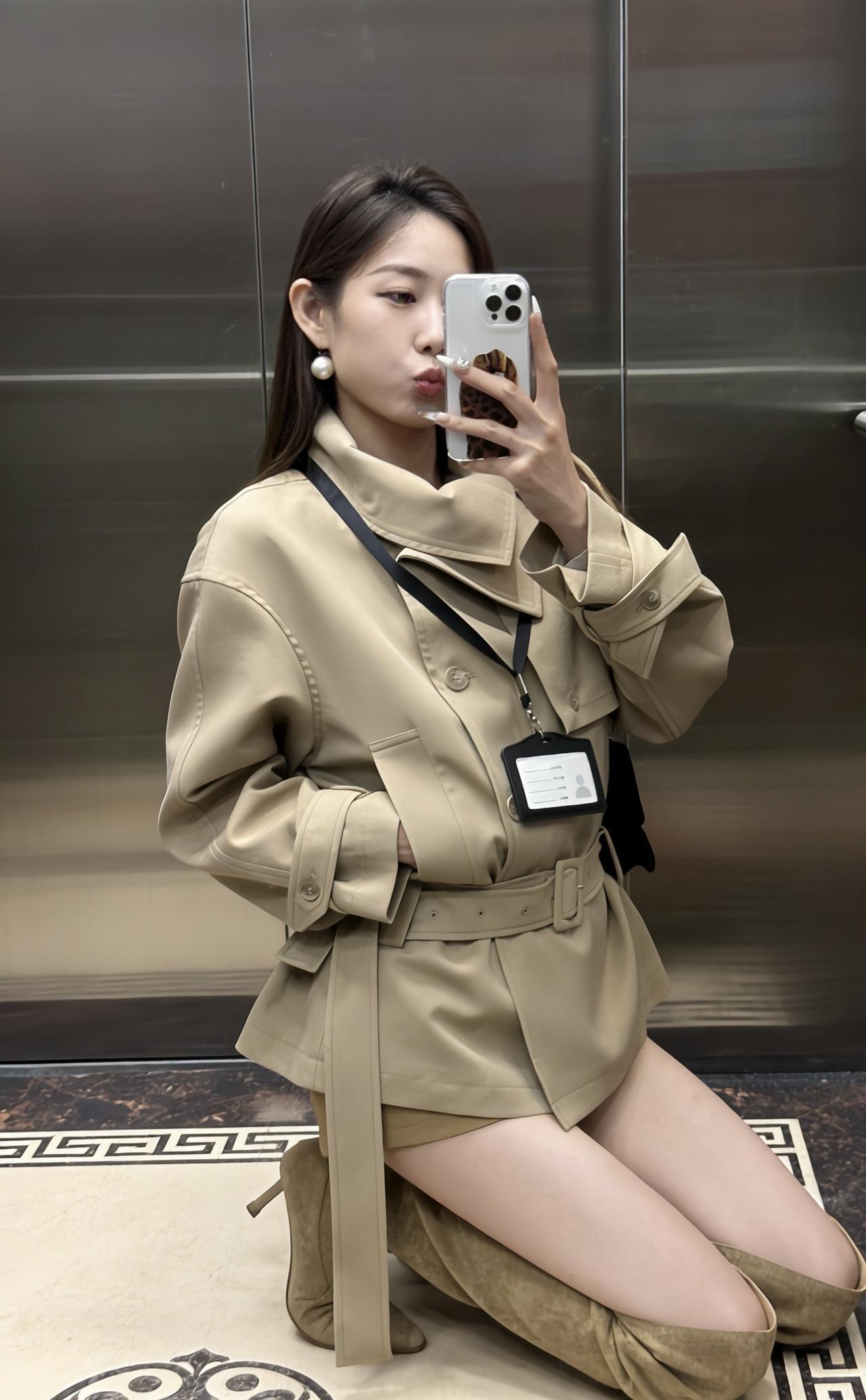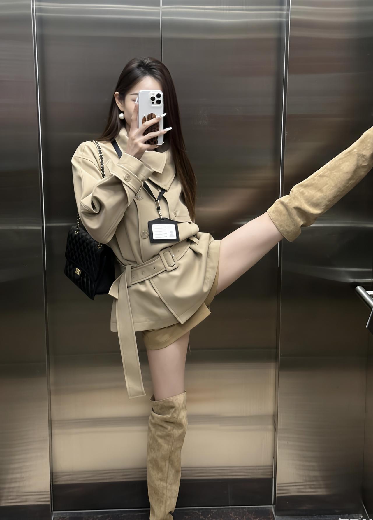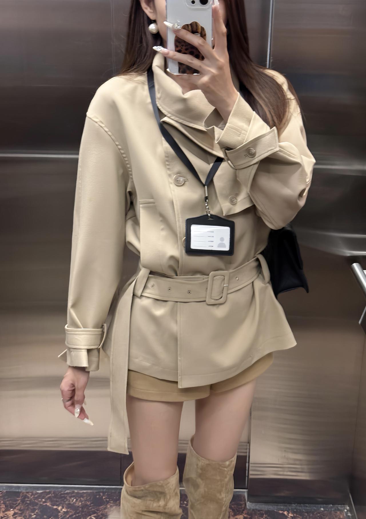 今日穿搭推荐是轻熟风通勤,整体协调又有细节亮点: 单品组合:浅卡其短款风衣(配腰带收腰)+同色系短裤+过膝长靴,搭配黑色链条包,既保留了风衣的干练,又用短裤、长靴增加了随性和时尚感。 风格特点:浅卡其色系统一显高级,收腰设计优化比例,长靴修饰腿型,是“通勤不刻板、休闲不轻浮”的适配款。 适合的场合: 日常通勤、逛街、轻社交场合、轻度商务场合:整体穿着既得体又不会显得过于严肃。
