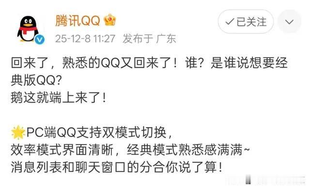你说什么?PC端的经典模式QQ回来? 可惜我已经被微信支配,QQ早已不用 当“经典QQ回归”刷屏,我们总被一种复杂情绪包裹——既有“青春归来”的触动,也藏着“早已不用”的现实,最终发现它早已悄悄换了新主人。 “QQ回来了”是真的。窄面板、独立聊天窗口、贴边隐藏的设计,精准戳中80、90后的青春:为挂“太阳”等级熬夜、为偷菜定闹钟、为火星文签名绞尽脑汁的日子,随界面一并复活。腾讯的“双模式”,实则把“情怀选择权”交给用户,哪怕只点开一眼,也是对青春的温柔回望。 但“我们都不用QQ了”也是事实。工作靠微信、生活刷抖音、社交用小红书,QQ早已从“全民社交工具”退居角落。对多数成年人而言,它更像“记忆存储盘”:老友头像不再亮起,聊天记录停在“有空聚”,偶尔打开只为传大文件或翻旧空间。经典模式再还原,也填不满社交场景迁移的缺口。 而“QQ的受益群众是学生”,正是它的新生存逻辑。对05后、10后来说,QQ不是“怀旧工具”,而是专属社交场:自由头像、花哨气泡、班级群匿名互动、小组作业传文件,甚至靠“扩列”识同好——这些功能精准适配学生需求。成年人眼中的“过时”,在他们那里是“新鲜”,QQ已完成用户代际交替
