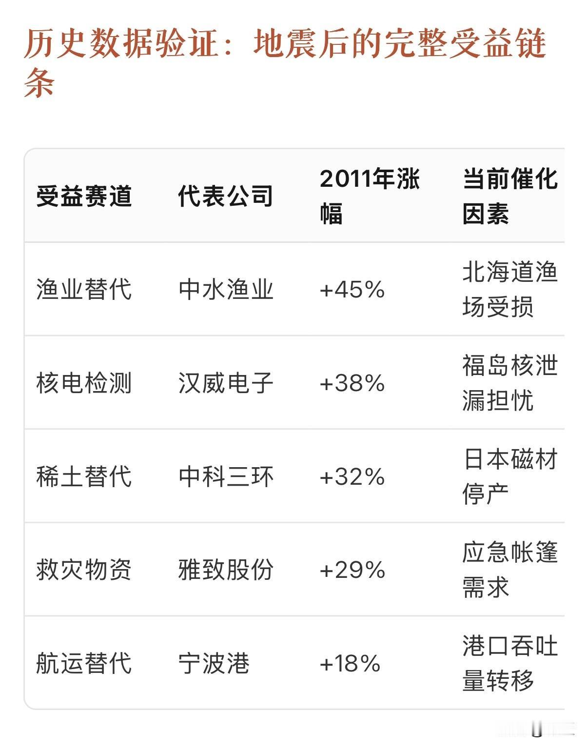 日本大地震,大A 8大赛道淘金! 除了半导体、汽车、建材、医药、石油这五大主线,日本地震还隐藏着8大被忽视的机会赛道 ,从渔业替代到核电检测,从稀土回收到救灾物资,构成一张完整的"灾后经济受益图谱"。 被忽视的8大机会赛道 1. 渔业替代逻辑 日本是全球第四大渔业国,2024年渔业产量420万吨。本次地震震中靠近北海道渔场(占日本渔业产量30%),可能导致: • 短期:日本金枪鱼、扇贝出口减少50%以上 • 中期:中国远洋渔业公司(如中水渔业、开创国际)获得日本订单转移 • 长期:日本高端海鲜供应链重构,中国养殖企业(如獐子岛、好当家)受益 2. 核电检测与防护 福岛核泄漏阴影下,各国加强核设施检测: • 放射性检测设备:汉威电子、同方威视订单激增 • 核防护服:际华集团、红豆股份受益 • 碘片储备:力生制药、中关村碘片销量增长300% 3. 稀土回收替代 日本占全球稀土永磁体产量20%,地震影响: • 钕铁硼磁材:中科三环、宁波韵升获得转单 • 稀土回收:格林美、华宏科技废料回收业务增长 • 轻稀土替代:北方稀土、盛和资源受益 4. 救灾物资紧急需求 日本应急物资缺口催生特殊需求: • 应急帐篷:雅致股份、浙江永强 • 活动板房:杭萧钢构、精工钢构 • 应急食品:三元股份、光明乳业 • 净水设备:碧水源、开能健康 5. 航运路线重构 地震改变全球航运格局: • 避开日本港口:中国远洋、中远海控调整航线 • 替代港口需求:青岛港、宁波港吞吐量增加 • 油运改道:招商轮船、中远海能受益 6. 电子特气替代 日本占全球电子特气市场35%,地震影响: • 三氟化氮:昊华科技、雅克科技 • 六氟化钨:南大光电、华特气体 • 光刻气:凯美特气、金宏气体 7. 碳纤维供应链 日本东丽、东邦产能受限: • 大丝束碳纤维:吉林碳谷、中简科技 • 碳纤维复合材料:光威复材、中复神鹰 • 风电叶片:时代新材、中材科技 8. 工程机械出口 日本重建需求拉动中国工程机械: • 挖掘机:三一重工、徐工机械 • 起重机:中联重科、振华重工 • 混凝土机械:山推股份、山河智能 日本海地震风险 日本大地震