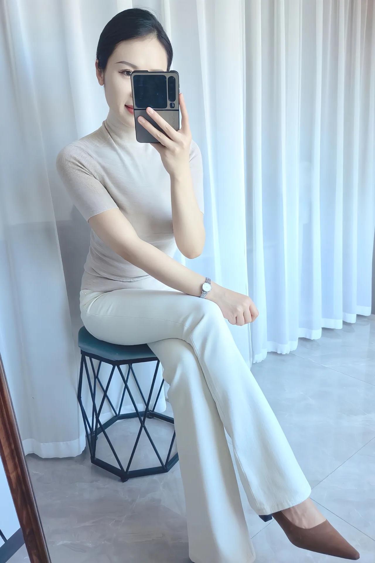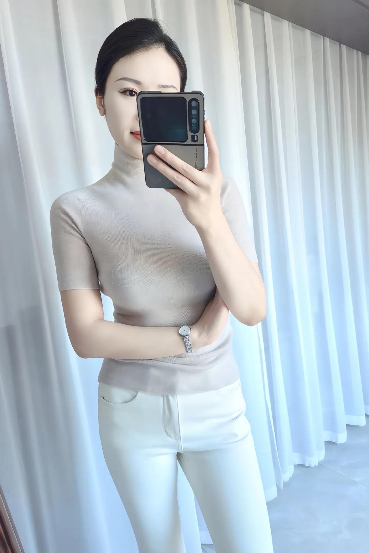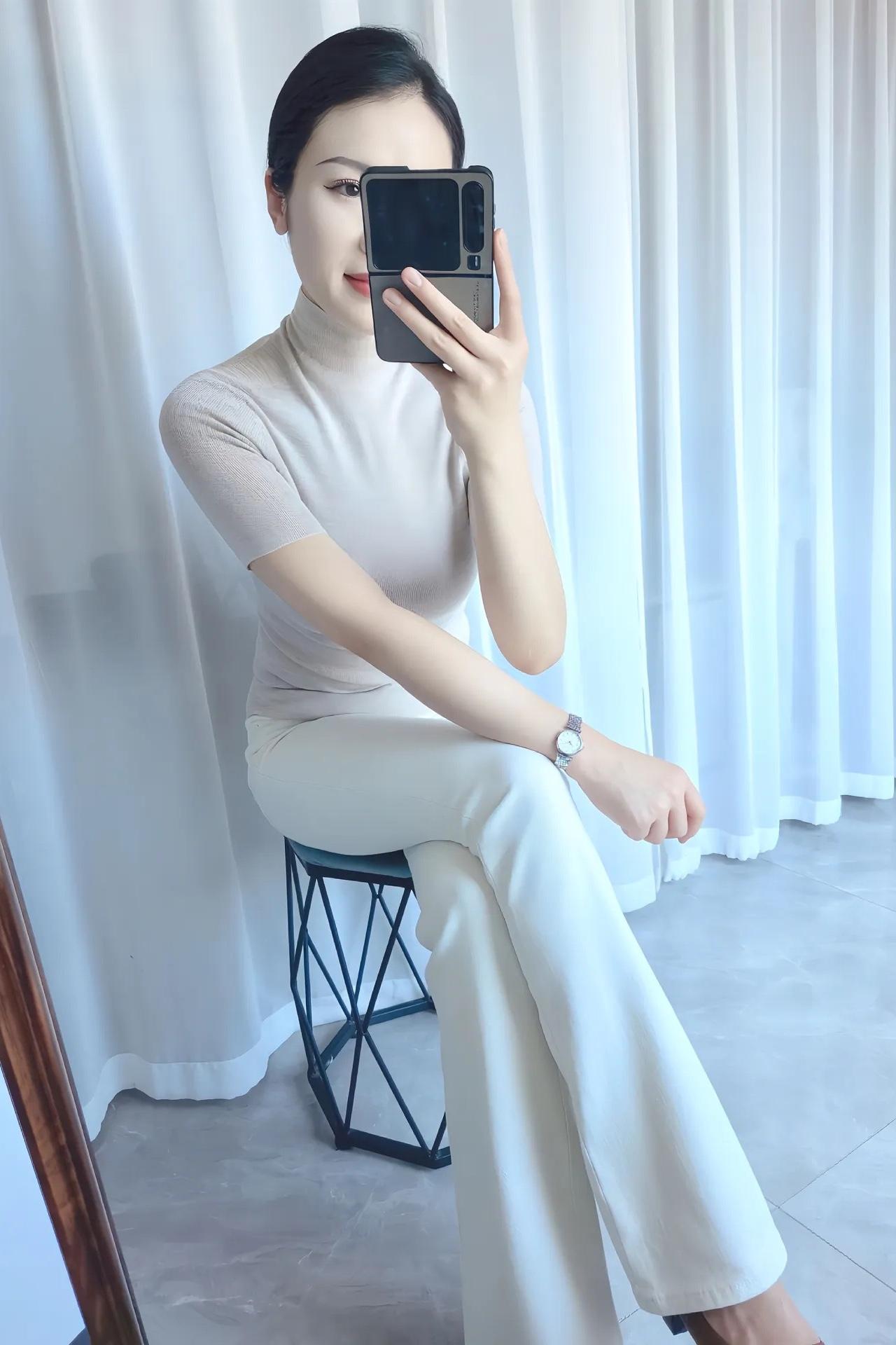 优雅气质穿搭,简约时尚,镜前自拍,轻松自在。