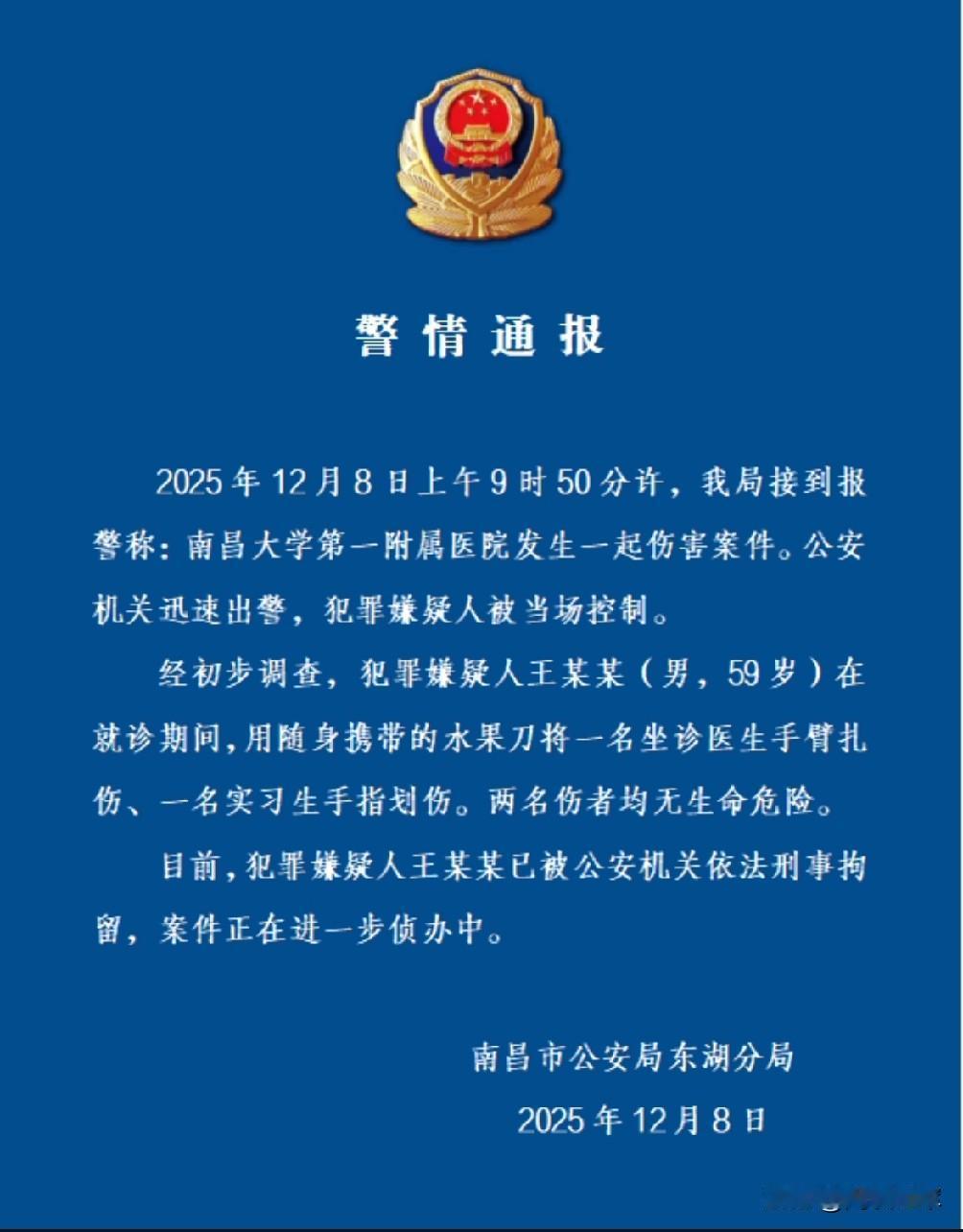 南昌发生伤医事件,警方通报“嫌犯被刑拘”。原因是什么,请曝光真实的起因。伤人不对