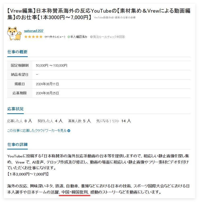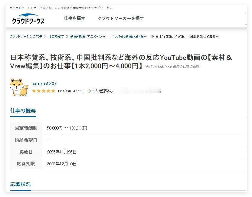 日媒爆料某外包平台雇人制作“日本好中国坏”的视频,平均一条视频价格不到180块钱,除了在视频长度和字数有要求外,内容要吹捧日本,抹黑中国,就算是虚假编造的也行。 经常刷短视频的人可能会发现,网上总有一些吹捧日本多厉害、顺带抹黑中国的内容,要么说日本街道干净到没有一点垃圾,要么拿些捕风捉影的事指责中国人素质差。 这些内容看着就知道是虚假编造的,但是数量又不少,难免让人有一个疑惑,这些卖力“日吹”又“黑华”的水军到底是从哪里来的。 最近日本网民的一个爆料,把这个问题的答案彻底揭开了,有人在日本最大的招聘平台Crowd Works上,发现了一条明目张胆的招聘信息。 发布信息的账号叫satorus1207,招聘要求写得清清楚楚,就是找人做视频,核心任务就两项,一是拼命夸日本,二是使劲黑中国。 报酬也明码标价,一条视频2000到4000日元,换算成人民币也就90到180块钱。 更离谱的是对视频内容的要求,不光要夸日本的科技、文化这些方面,黑中国的时候更是没底线。 明确说可以找各种角度批判所谓的“不当行为、道德缺失”,实在没素材甚至允许编故事,用AI生成虚假图片和视频都可以。 有一条更苛刻的招聘信息更过分,要求做一条27分钟以上、文案超过一万字的视频。 一万字的文案要好几天才能写完,27分钟的长视频剪辑起来更是费功夫,普通电脑都顶不住,得专门买高性能的设备,这点报酬连成本都不够覆盖。 这些做出来的视频也有明确的去处,一部分投放到海外的视频平台,目的是抹黑中国的国际形象,抬高日本的地位。 另一部分更阴险,直接投放到中国的互联网上,想污染网络环境,偷偷培养亲日的人。 为了让视频看起来更“真实”,有些创作者更是耍起了偷梁换柱的把戏,把中国城市漂亮的城建说成是日本的,把中国地铁里乘客有序排队的画面,安到日本地铁头上。 顺着这条招聘信息往下查,更惊人的情况浮出水面。 这个账号根本不是第一次干这事,2024年7月和8月就两次发布过类似的招聘,目标除了中国,还有韩国,都是要突出日本在铁路、汽车这些领域的所谓优势,再踩一踩中韩。 招聘信息里附的“参考视频”链接也暴露了背后的产业链,操盘手在YouTube上开了好几个账号,像“感动日本”“璀璨的日本技术”之类的,前者发了500多条视频,后者更夸张,超过800条。 这些视频标题一个比一个夸张,什么“日本技术碾压全球”“中国产业要崩溃”,点进去看内容全是东拼西凑的零碎信息,很多数据都是编的,根本站不住脚。 这事儿被日本网民曝光后,立刻在当地引发了轩然大波,愤怒的声音占了大多数。 要知道现在的日本经济状况并不好,连续好几个季度都是负增长,普通人的实际工资一直在降,大米价格涨得让普通家庭买菜都要精打细算,养老金也在不断缩水,年轻人躺平啃老都成了常见现象。 大家本来就对民生问题意见很大,看到有人公开招募水军搞这种事,自然炸开了锅。 不少日本网民在社交平台上质问,政府放着好好的民生问题不管,难道有闲钱花在这种上不了台面的信息战上?还有人说,用纳税人的钱做这种抹黑别国的事,简直是丢国家的脸。 除了愤怒,更多人好奇的是,支撑这么多视频制作、账号运营的钱到底从哪来。 且不说招募水军的报酬,单是运营好几个YouTube账号,长期产出视频的设备、剪辑、维护成本就不算低,几百条视频堆下来,绝对不是一笔小数目。 虽然没有直接的实锤证据,但日本网民纷纷把怀疑的目光投向了官方,尤其是自民党和外务省。 之前就有日本媒体曝光过,自民党每年都会划拨专项经费搞“网络引导”。 外务省近年的“海外战略信息传播”预算更是超过560亿日元,这些钱不少都用在了培养亲日分子、输出日本所谓的“历史认识”上。 更讽刺的是,这些打着“展示日本海外反响”旗号的视频,实际看的人没几个,留言点赞的几乎全是日语用户,而且语气一看就是日本右翼分子。 说白了,这更像是右翼分子自导自演的“自娱自乐”,根本达不到他们想要的宣传效果。 这些日本水军本质上是官方或右翼势力操控的舆论工具,用低价外包的粗制滥造内容搞信息污染。 不过大家也得警惕,虽然这些内容对了解情况的人来说漏洞百出,但对那些不熟悉中日实际情况的人,长期看还是可能被误导。
