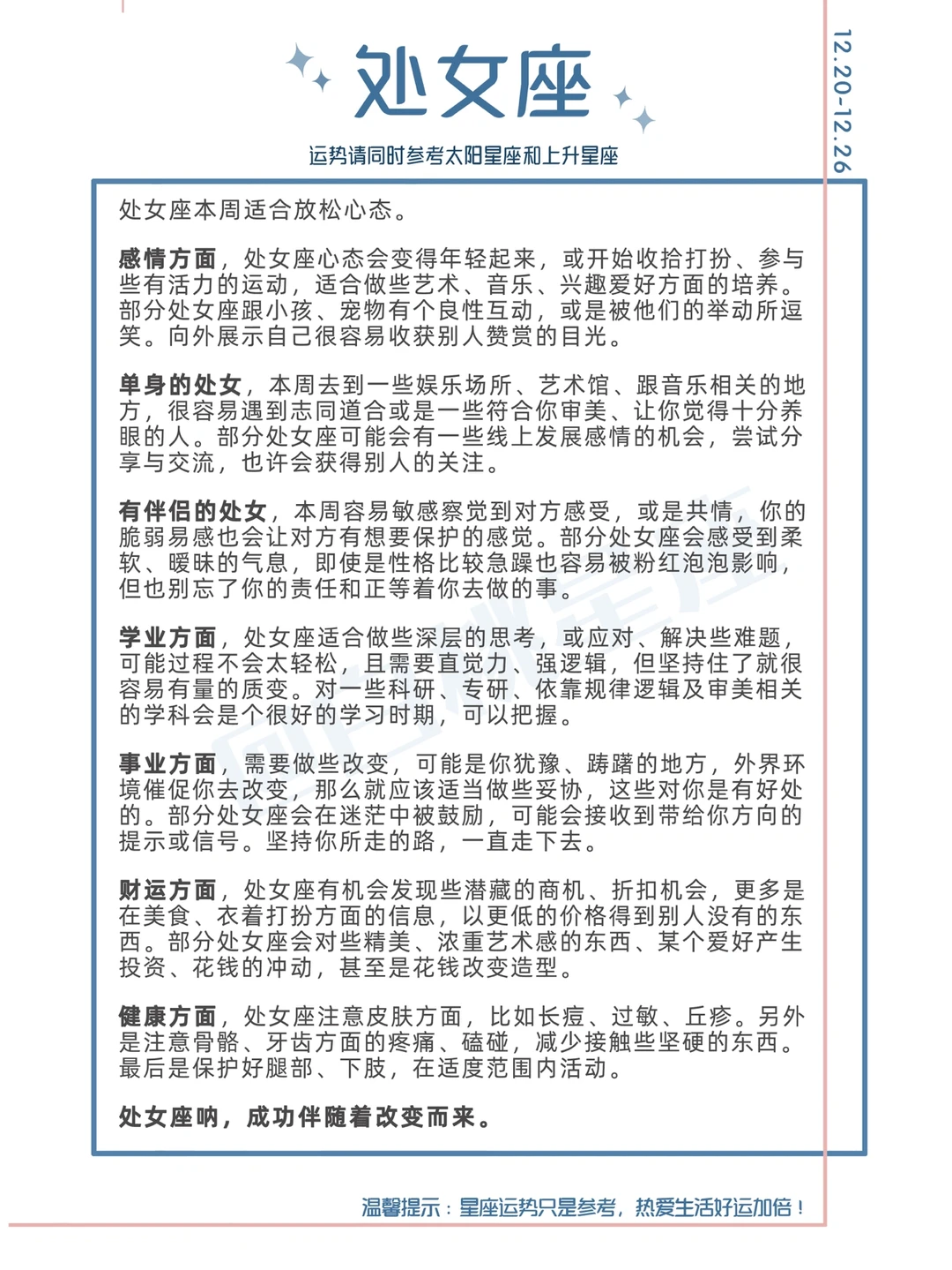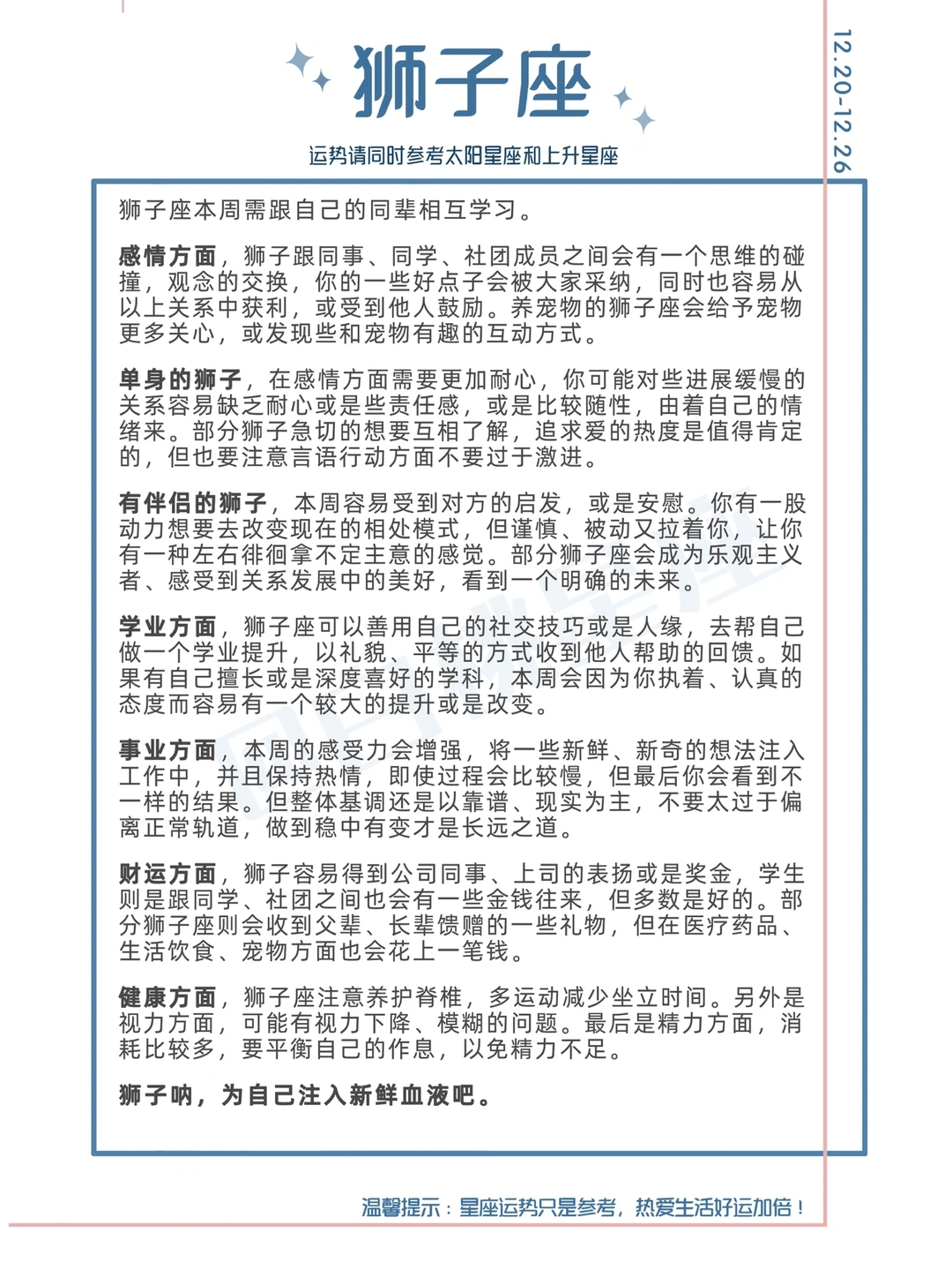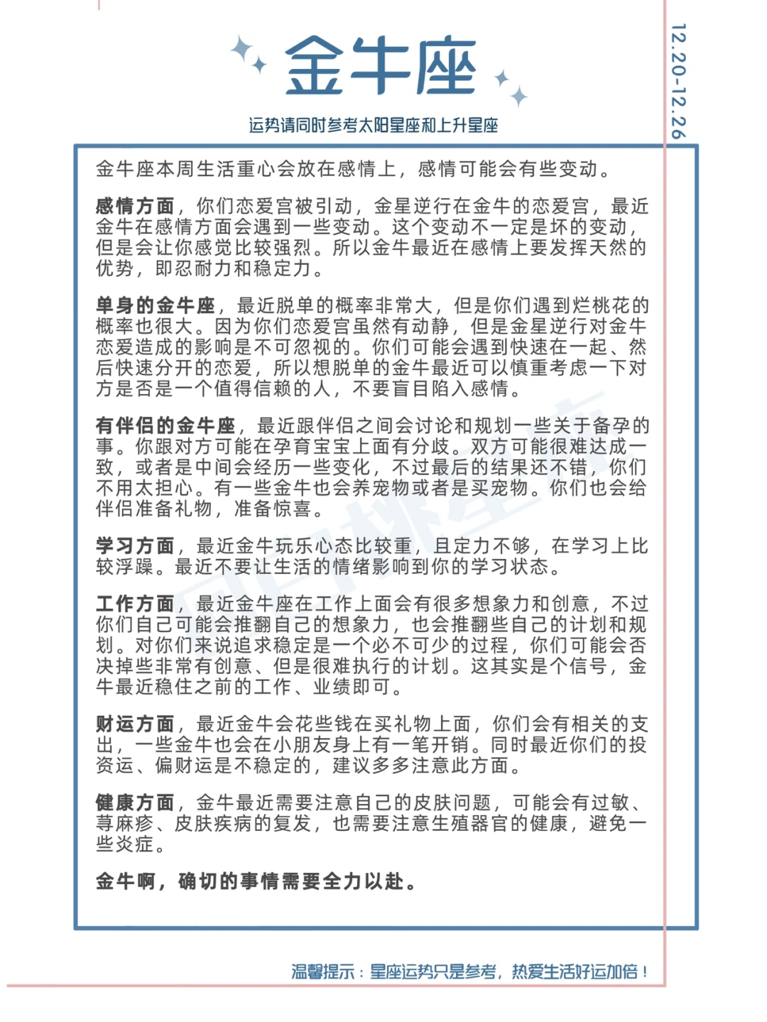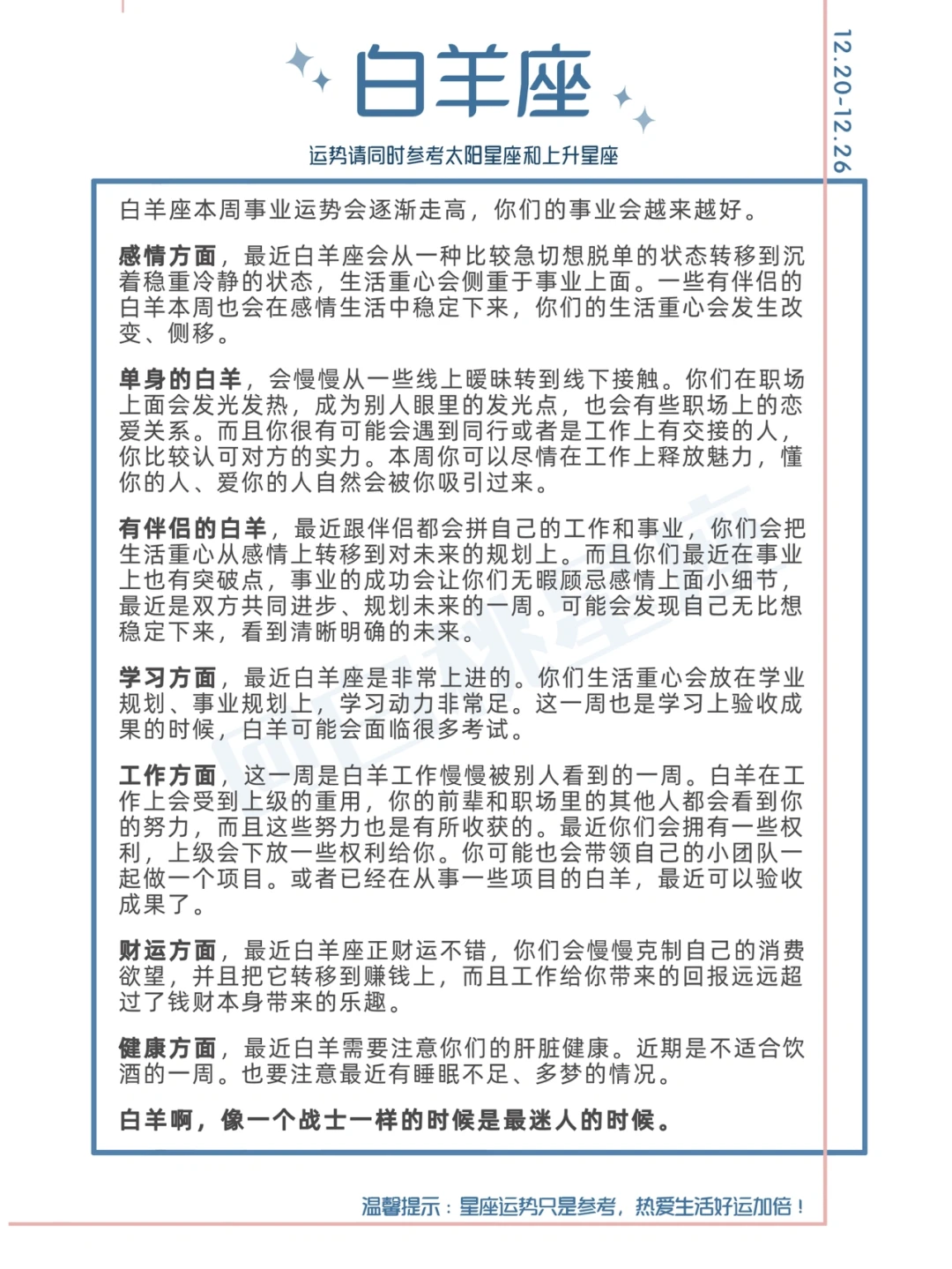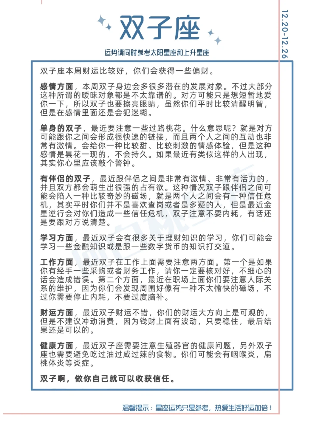 (重点参考上升和太阳星座,一般运势是上升星座对应会发生的事件,太阳星座对应感受到的东西。)