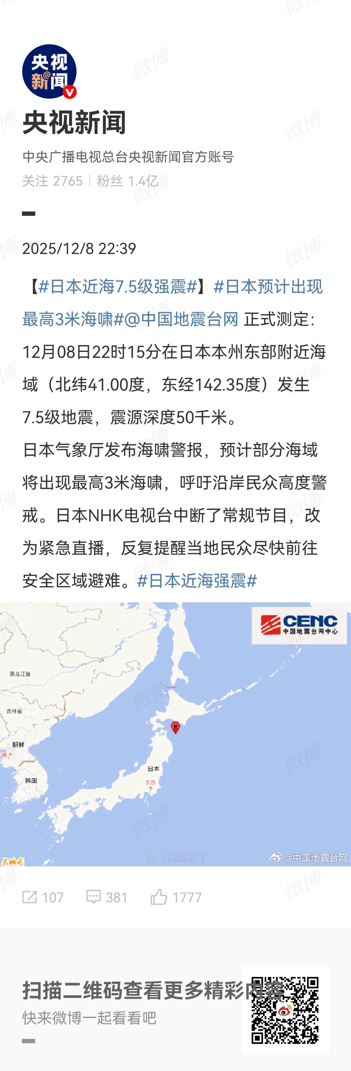 临睡前,吃了一口大瓜,这瓜有点意思:一早看到新闻,日本12月5日共同社报道,预测东京将发生7.3级地震,最坏情况下将导致1.8万人遇难,经济损失预计达83万亿日元。今天早上中国民间有高人预测,日本本州东部海域将发生7.8级左右地震。神奇的是,12月8日22时15分,在日本本州东部附近海域发生7.5级地震,震源深度50千米。到底是真地震还是假地震,日本共同社的预测可能给出了答案,至于预测地点不一致,完全可能是想欲盖弥彰;但这个叫玛雅奇迹的中国网友,是个高人,真正印证了“高手在民间”。