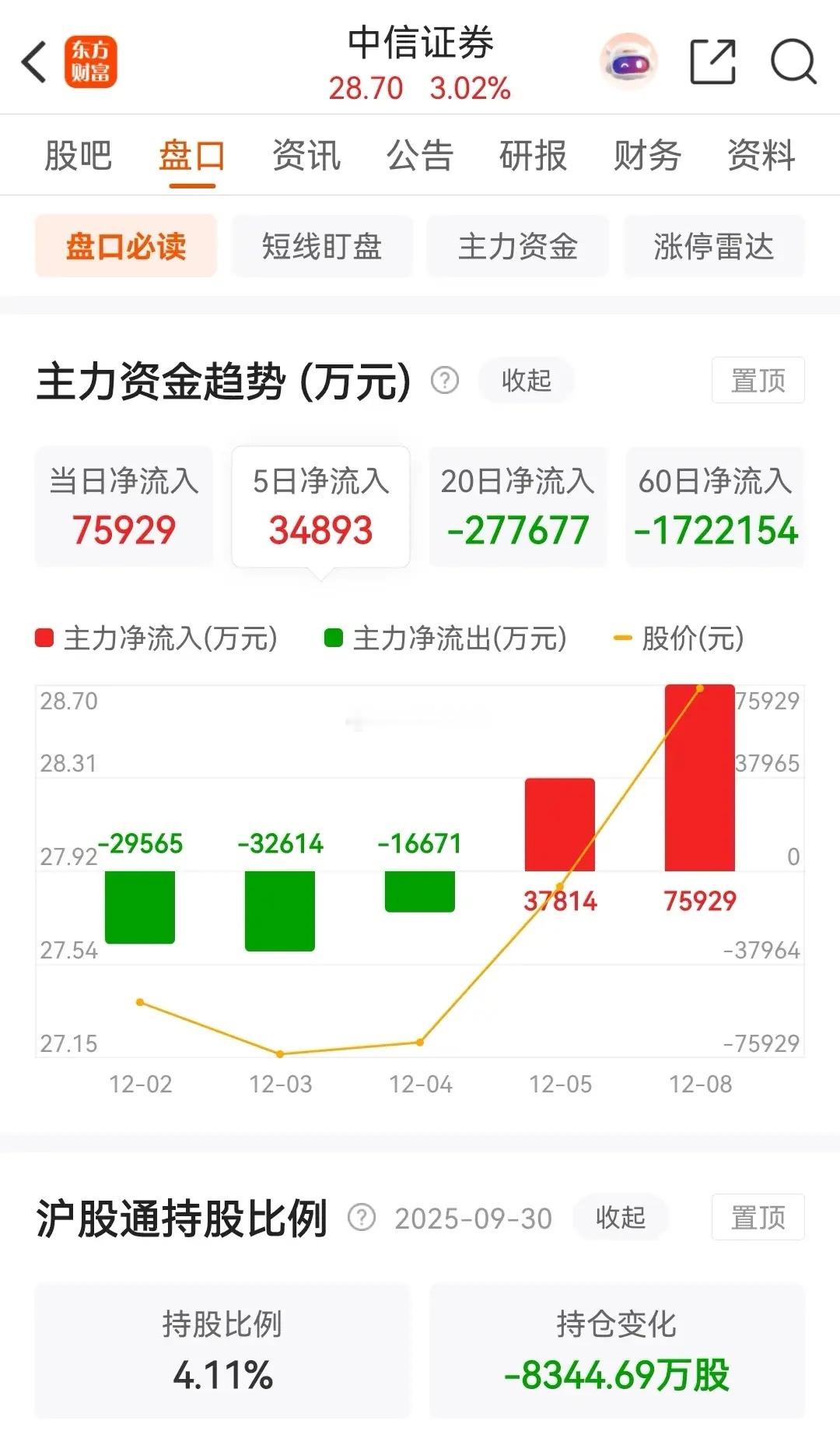东方财富今天冲高回落,被主力资金净卖出了3.9993亿元;中信证券则是再次放量上