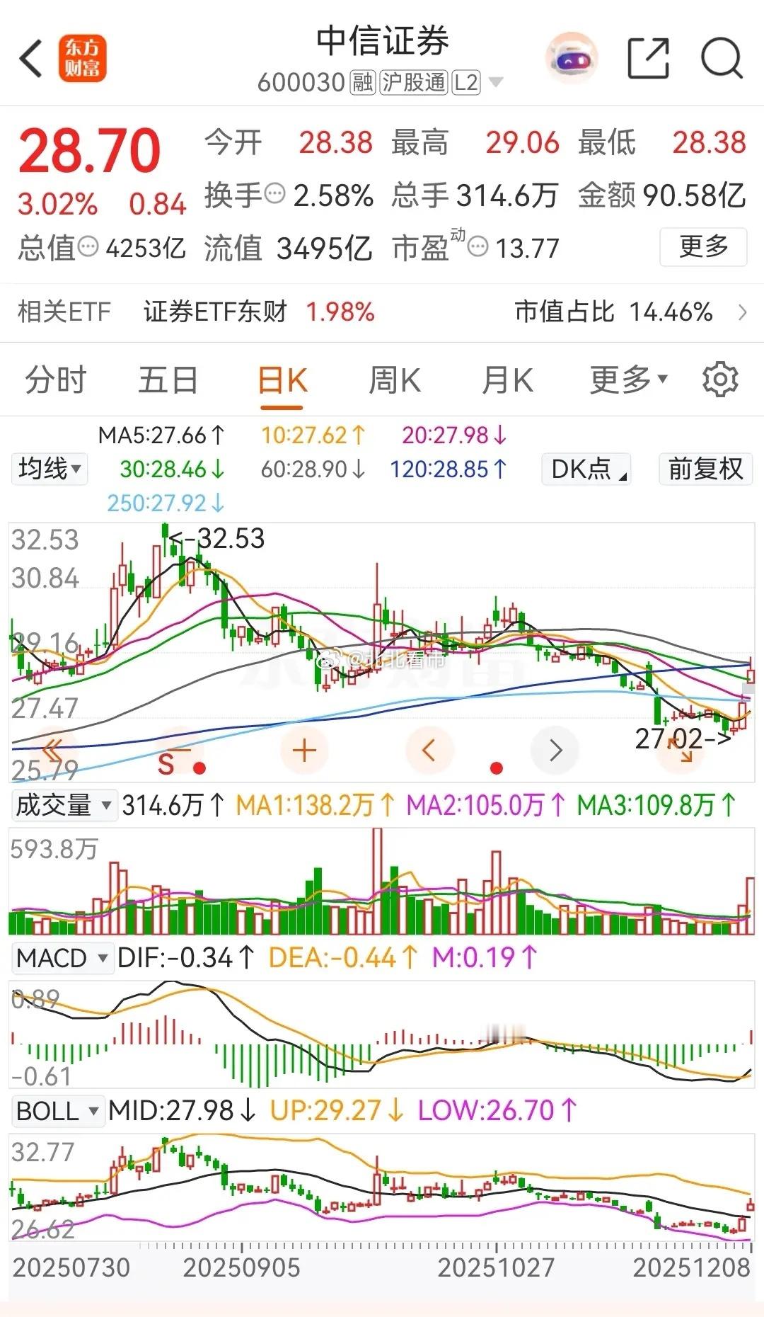 东方财富今天冲高回落,被主力资金净卖出了3.9993亿元;中信证券则是再次放量上涨,被主力资金净买入了7.5929亿元。从今天的走势上看,东方财富早盘跳空高开后快速冲高,然后回落,震荡走低,收盘时跌破了开盘价,最终收涨了1.42%,收盘报价为23.64元。在资金流向上,被主力资金净卖出了3.9993亿元,近五个交易日则是被主力资金合计净卖出了14.9144亿元。中信证券今天的走势要强于东财,早盘跳空高开后走高,全天都在高位横盘整理。收盘时上涨了3.02%,报价为28.70元,成交量也是放出了倍量。在资金流向上,主力资金大幅净买入了7.5929亿元,近五个交易日则是合计被净买入了约3.4893亿元。从走势上看,今天收盘站稳的30日均线。至于更详细的技术分析,可以查看今日关于券商概念板块走势的分析。下面简要说一下中信证券和东方财富的业绩情况。头部券商中信证券2025年前三季度实现营业收入558.15亿元,同比增长32.70%;归母净利润231.59亿元,同比增长37.86%。互联网券商代表东方财富在2025年前三季度实现营业收入为115.89亿元,同比增长58.67%;归母净利润90.97亿元,同比增长50.57%。从二者近三个交易的走势上看,中信证券要强于东方财富,但是东方财富在牛市中的弹性也不要忽视。