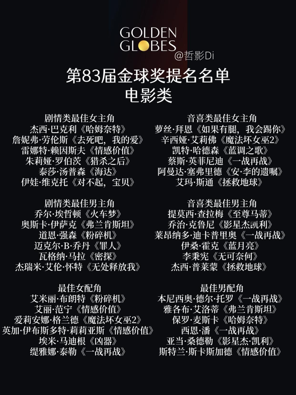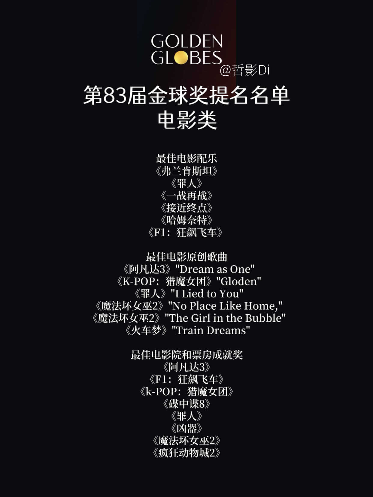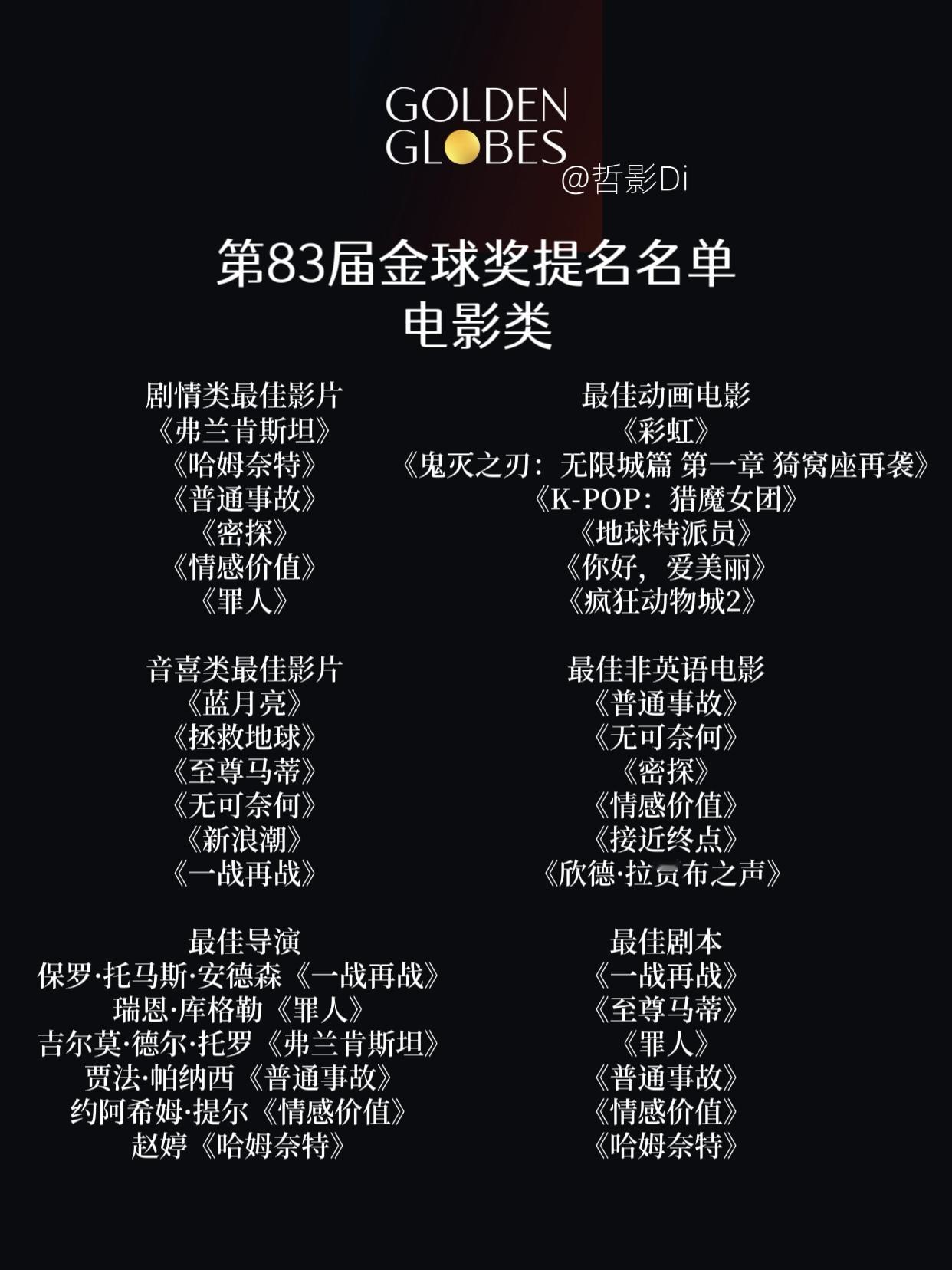 2026金球奖提名第83届金球奖电影类提名名单公布,由保罗·托马斯·安德森执导的影片《一战再战》以9项提名领跑本届金球奖,戛纳电影节评审团大奖影片《情感价值》则获8项提名紧随其后,大热商业电影《罪人》收获7项提名跻身前三,多伦多电影节人民选择奖得主《哈姆奈特》则获得6项提名。 目前颁奖季影后领跑选手萝丝·拜恩将与艾玛·斯通、辛西娅·埃里沃、阿曼达·塞弗里德争夺本届金球音喜影后;“甜茶”提莫西·查拉梅则将与莱昂纳多·迪卡普里奥、乔治·克鲁尼、李秉宪和伊桑·霍克角逐本届音喜影帝,这两组竞争相当激烈。戛纳影帝瓦格纳·马拉凭借《密探》提名剧情类影帝,他将与《罪人》男主迈克尔·B·乔丹争夺最终的影帝桂冠,杰西·巴克利则要面对戛纳影后雷娜特·赖因斯夫的挑战,两人将争夺本届剧情类影后。NEON则是本届金球奖最大赢家,其发行的《普通事故》《情感价值》《密探》《无可奈何》《接近终点》在本届金球奖提名中大放异彩,共斩获20项提名,创造历史。本届金球奖颁奖典礼将于2026年1月11日举行。奥斯卡战线