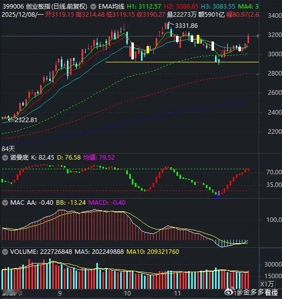 成交额重回2万亿,A股开启新一轮扩张?大盘今日小幅高开后震荡上扬,午后有所回落,最终报收小阳线。两市成交额2.04万亿,较上周五放量3109亿,时隔20个交易日两市成交额再度突破2万亿元。这意味着A股度过了低谷,开启了新一轮的扩张。很多个股也告别了至暗时刻,将出现新一轮上涨。需要注意的是,大盘从11月14日调整至今,才25个自然日,连一个月都不满,这个时间不太够,远远低于第二浪的69个自然日。它可能还会继续上下震荡,很难一口气突破4000点。不过,只要它不跌就足够了,只要它稳定,没有下跌风险,那些调整到位的板块才能顺利爆发。哪些板块调整到位了?我们先来看指数。创业板指与科创50都从国庆后就开始调整的,到现在刚好满了两个月,时间与空间都达标了,而且今天的表现都很好,创业板指的涨幅是宽基指数里最大的,科创50指数涨幅居第二、且出现了“芙蓉出水”形态。接下来,只要大盘稳定,创业板指与科创50指数可能会迎来新一轮上涨。创业板与科创板是科技股的集中营,比如CPO、芯片、机器人、AI应用,外加一个新能源(光伏、锂矿、固态电池、储能)。科技股的机会比较确定,新能源则需要消息面的刺激,主要是多晶硅的收储落地、碳酸锂的供需。总体上,大盘量价齐升,彻底告别了二次探底的可能。资金继续炒作老热点CPO、存储芯片,刺激创业板指、科创50指数涨幅居前。随着A股的回暖,业绩预期大增的光伏、锂矿、AI应用在持续缩量后,也出现了拐点迹象。目前只是预热,真正的大戏可能出现在本月下旬的年报预告。========盘后重要消息:1、佰维存储:宇树科技Go2智能机器狗中已应用公司的LPDDR4X、eMMC存储产品。佰维存储在互动平台表示,公司已推出适用于具身智能领域的eMMC、UFS、BGA SSD、LPDDR4X/5/5X等产品。根据第三方媒体拆解报告,宇树科技的Go2智能机器狗中已应用公司的LPDDR4X、eMMC存储产品。2、浙江荣泰:拟约5.45亿元在泰国投建年产1.4万吨云母纸、4500吨云母制品及700万套机器人部件生产项目。人形机器人火热起来了,股价也涨起来了,于是它们玩命扩产。这一幕,与三年前的多晶硅、锂矿等何其相似。机器人零部件表面上看是科技股,其实是周期股的内核。3、高盛绩前唱多美光,Q3业绩将大超预期。高盛分析师在业绩前发布预测,预计美光科技第三季度营收将达到132亿美元,超过华尔街127亿美元的普遍预期,预计每股收益为4.15美元,高于3.84美元的平均预期。4、美的集团:已完成100亿元股份回购方案,拟注销公司总股本1.24%。回购后注销,它A股里为数不多的好公司。它也不像格力电器那样很任性的搞跨界,实控人退居幕后由职业经理人打理,股价在2022年见底后走出了3年慢牛,距离2021年的历史高点只有一点点了。