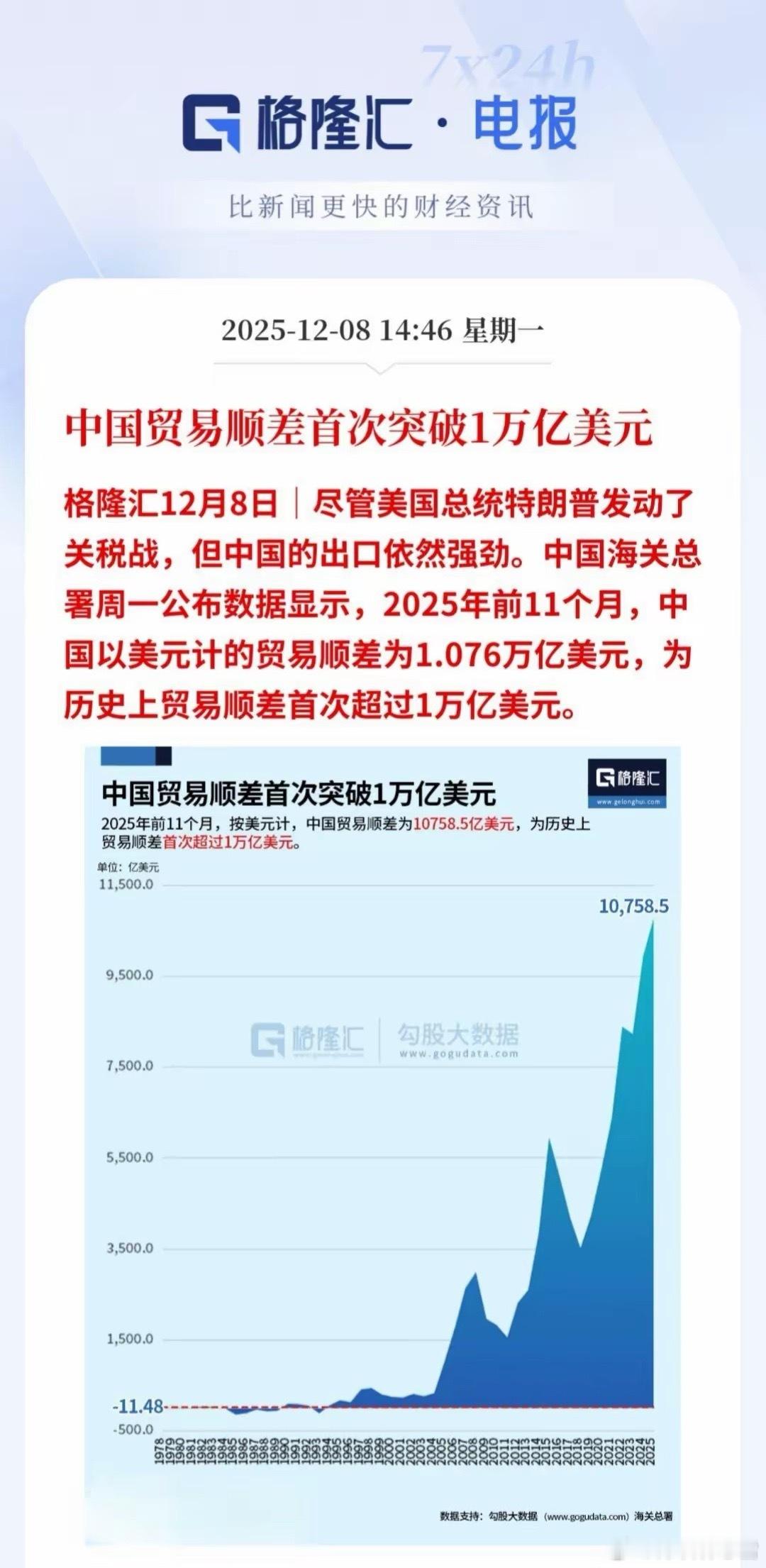 外贸大超预期!贸易顺差首破万亿美元大关海关总署重磅数据出炉:前11个月中国贸易顺差达1.076万亿美元,创下历史首次破万亿的里程碑!即便面临美国关税战持续扰动,中国出口依旧保持强劲势头,硬核供应链实力尽显无疑!