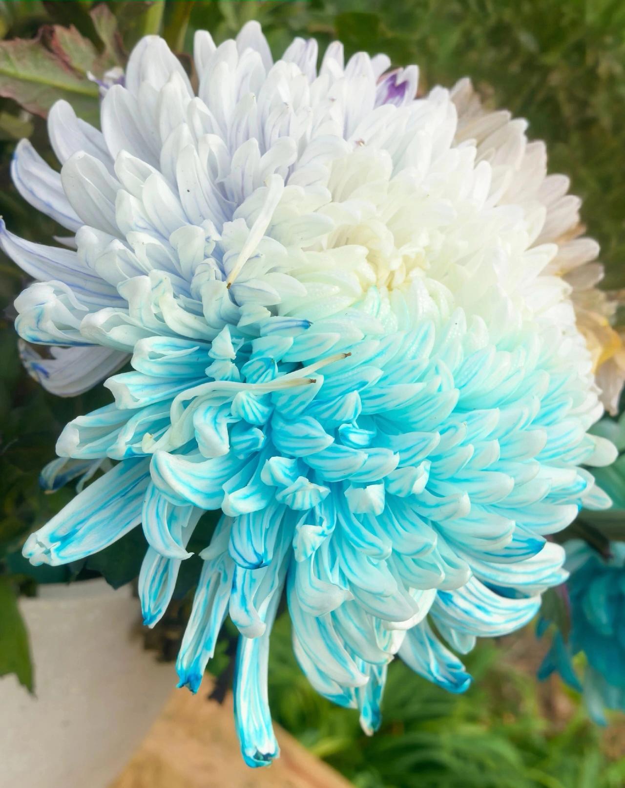 这朵菊花宛如造物的调色盘,花瓣层层叠叠,晕染着梦幻色彩。上部是纯净的乳白与淡紫交织,似晨雾轻拢;中部渐变出冰蓝与月白的条纹,像海浪在花瓣上凝固;下部则是澄澈的湖蓝,边缘泛着薄荷般的清凉。细密的花瓣如丝绒般舒展,每一片都带着独特的色彩纹理,蓝紫白三色交融处,仿佛将天空、海洋与云朵的精华都凝于这一朵花中。背景的绿意更衬得它清丽脱俗,既有菊花的雍容,又有琉璃般的幻彩,宛如秋日里绽放的一场蓝色梦境。