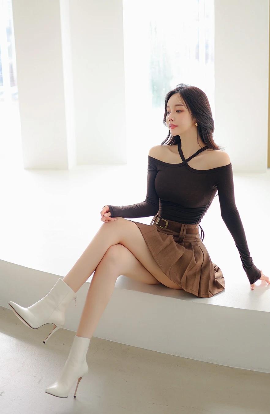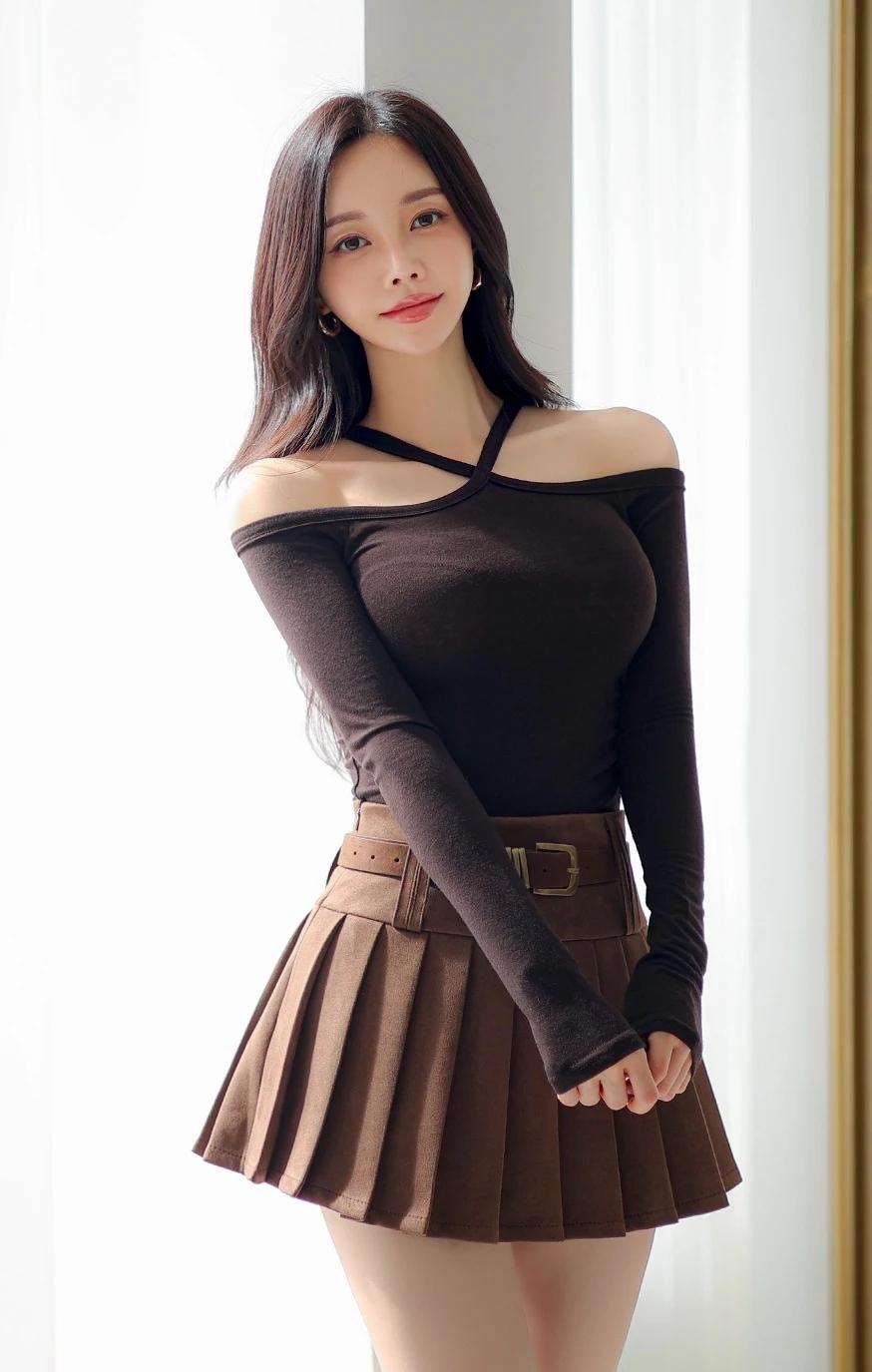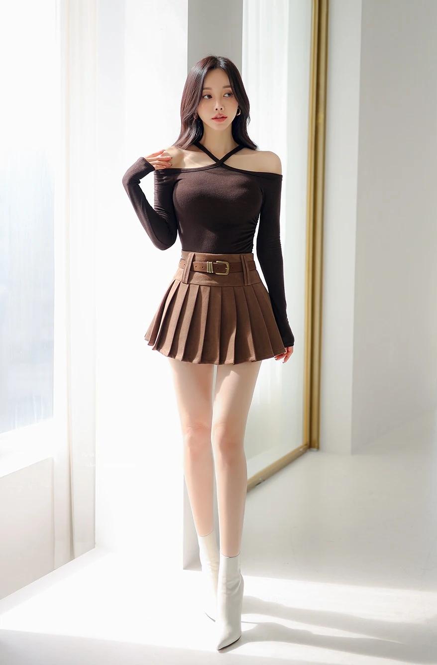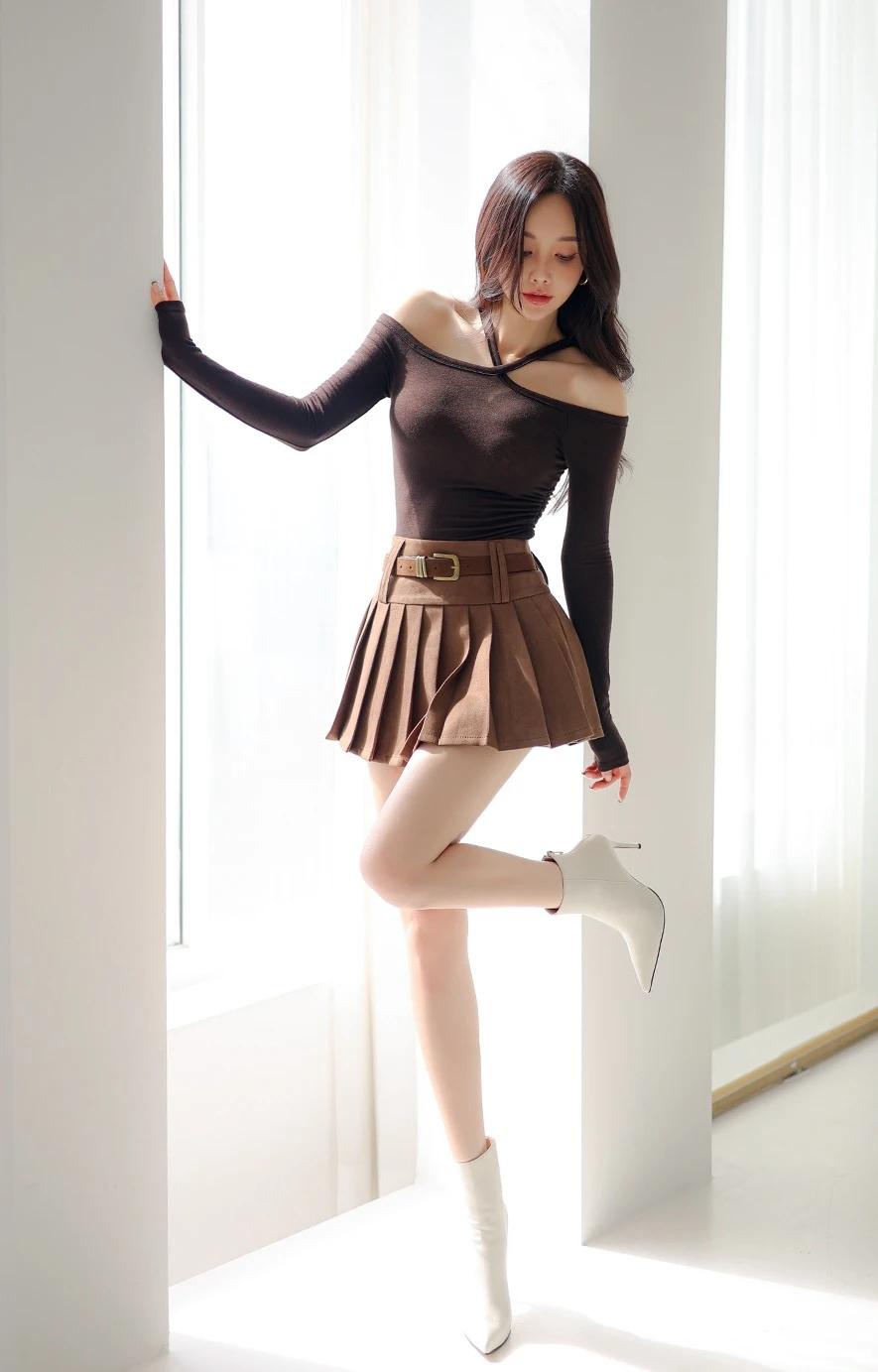 孙允珠-时尚穿搭黑色露肩上衣搭配棕色百褶裙,简约又优雅,完美展现女性魅力!💃
