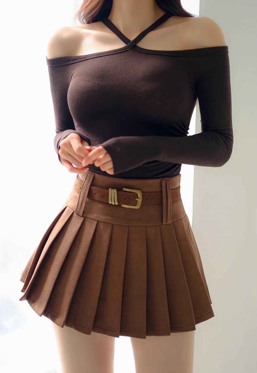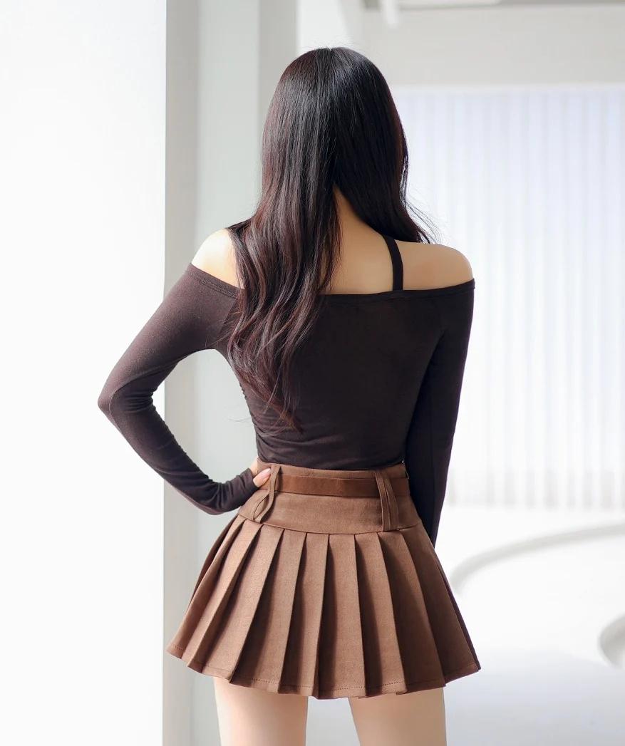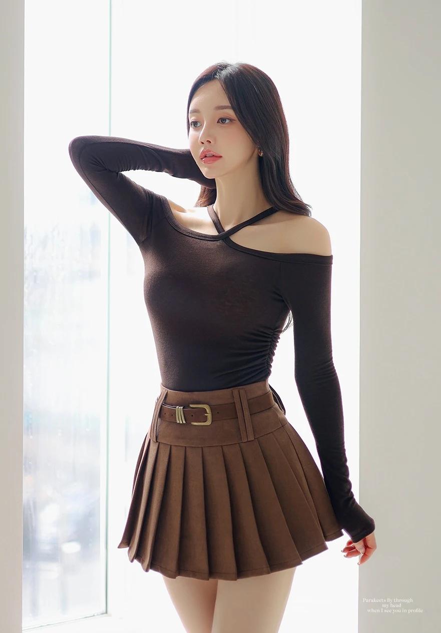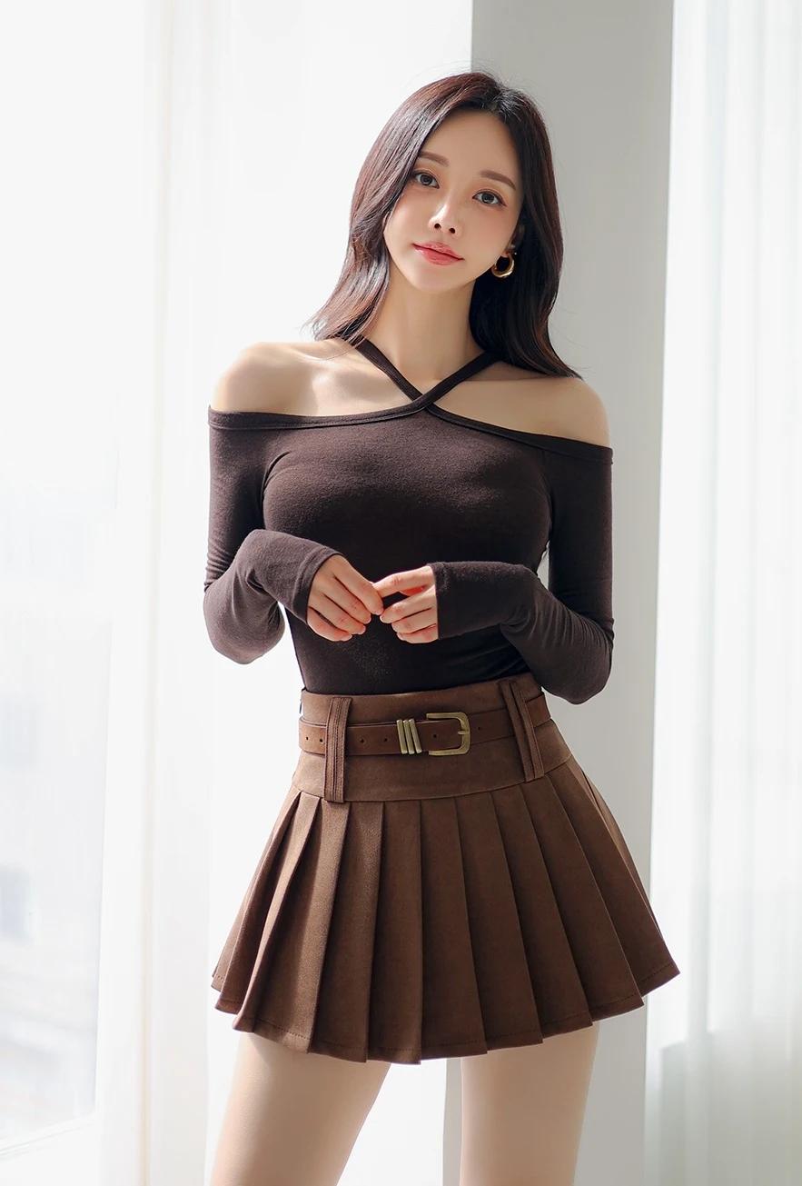 孙允珠-时尚穿搭黑色露肩上衣搭配棕色百褶裙,简约又优雅,完美展现女性魅力!💃