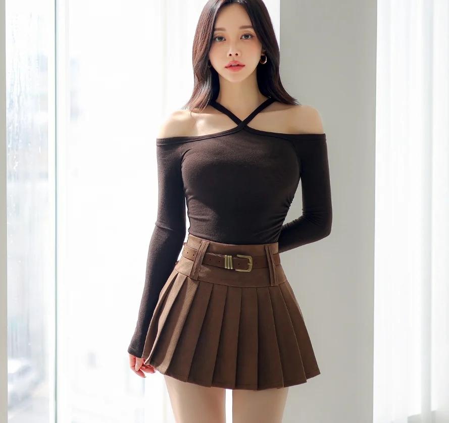 孙允珠-时尚穿搭 黑色露肩上衣搭配棕色百褶裙,简约又优雅,完美展现女性魅力!💃