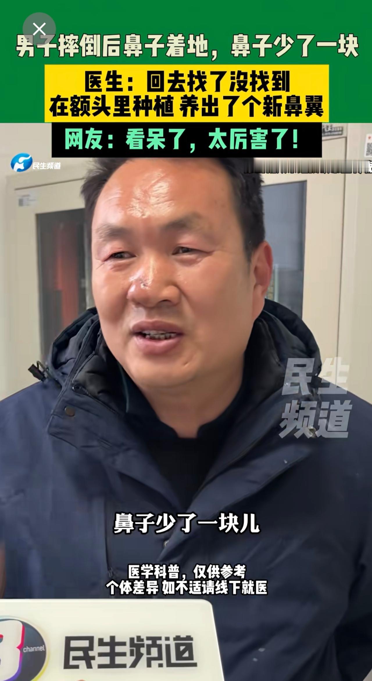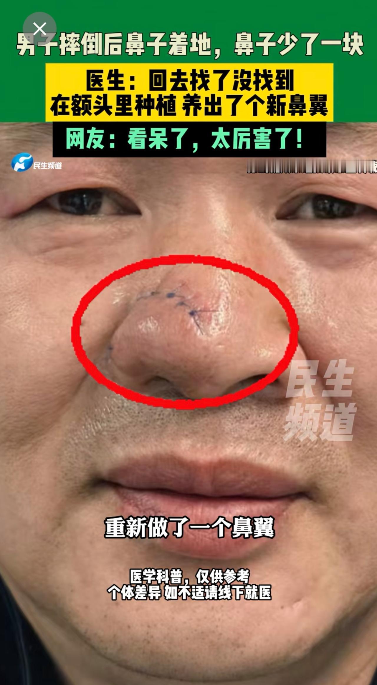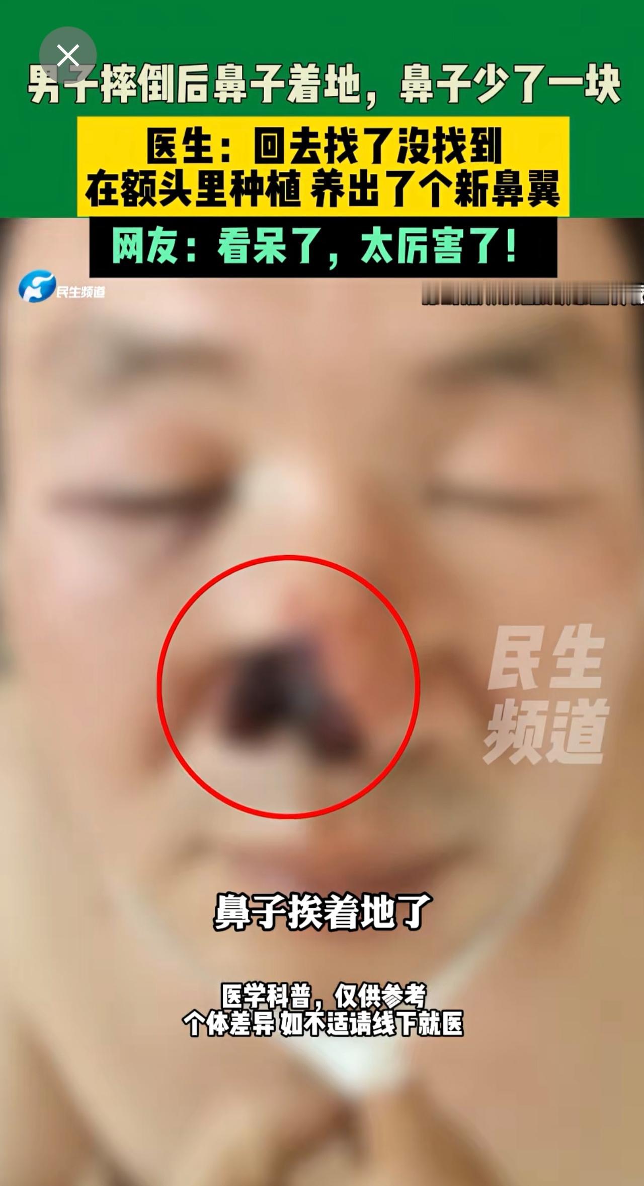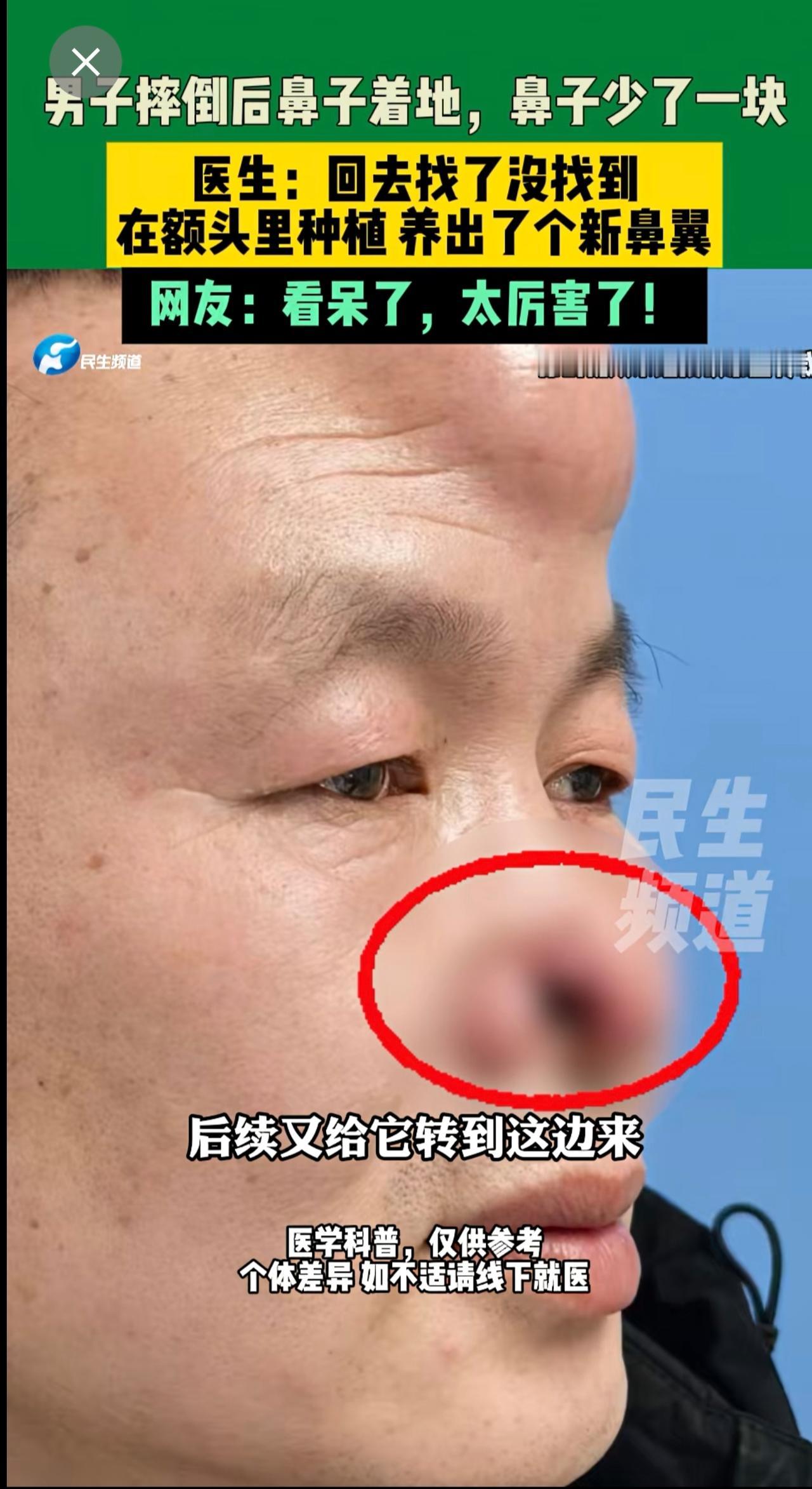 12月8日(发布)河南郑州 男子摔倒后鼻子着地,鼻子少了一块,医生:回去找了没找到,在额头里种植,养出了个新鼻翼,网友:看呆了,太厉害了!