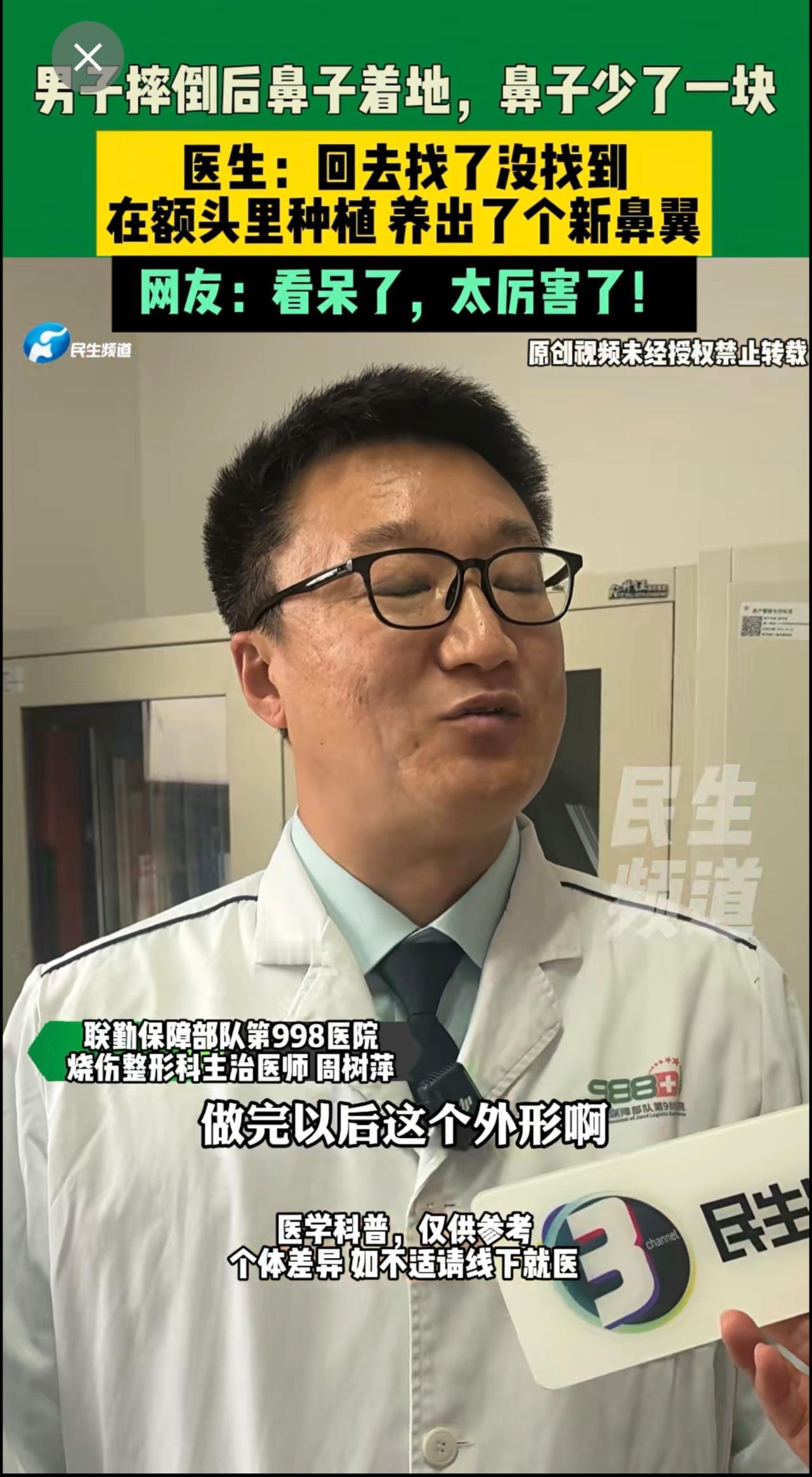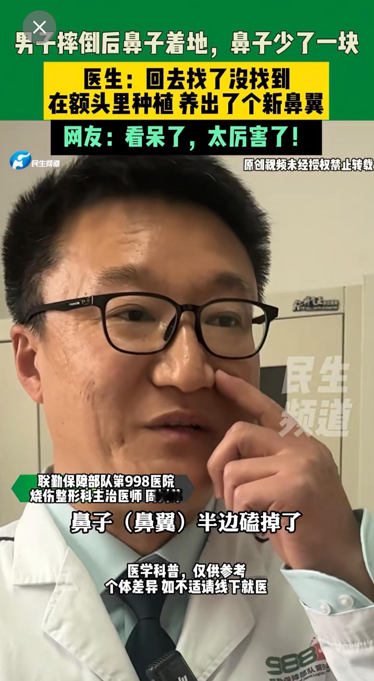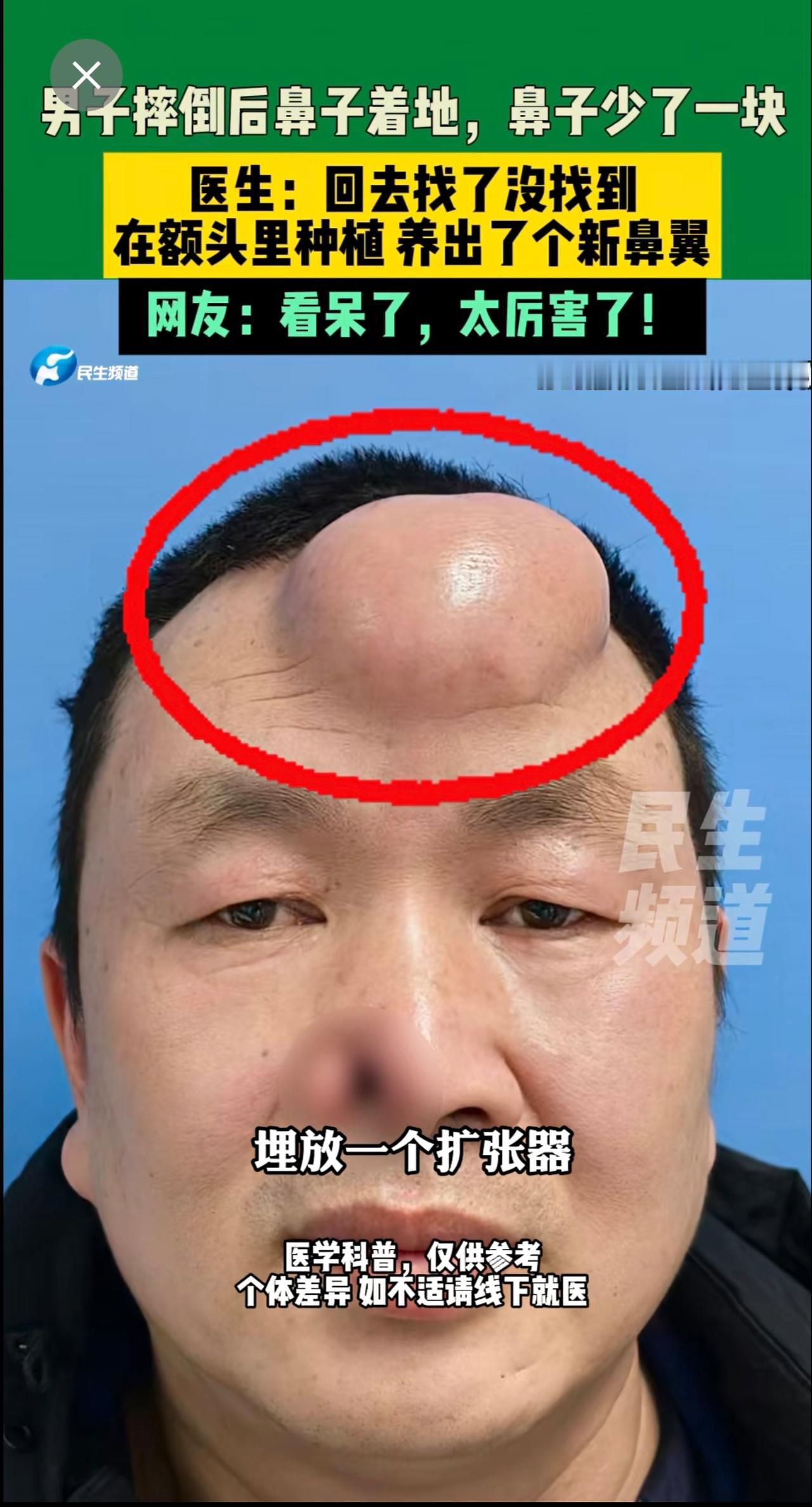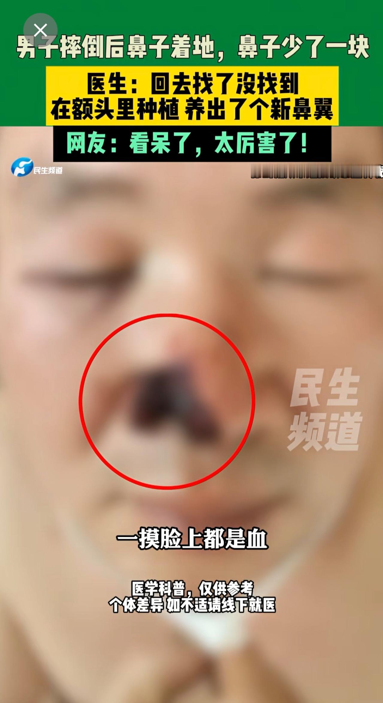 12月8日(发布)河南郑州 男子摔倒后鼻子着地,鼻子少了一块,医生:回去找了没找到,在额头里种植,养出了个新鼻翼,网友:看呆了,太厉害了!