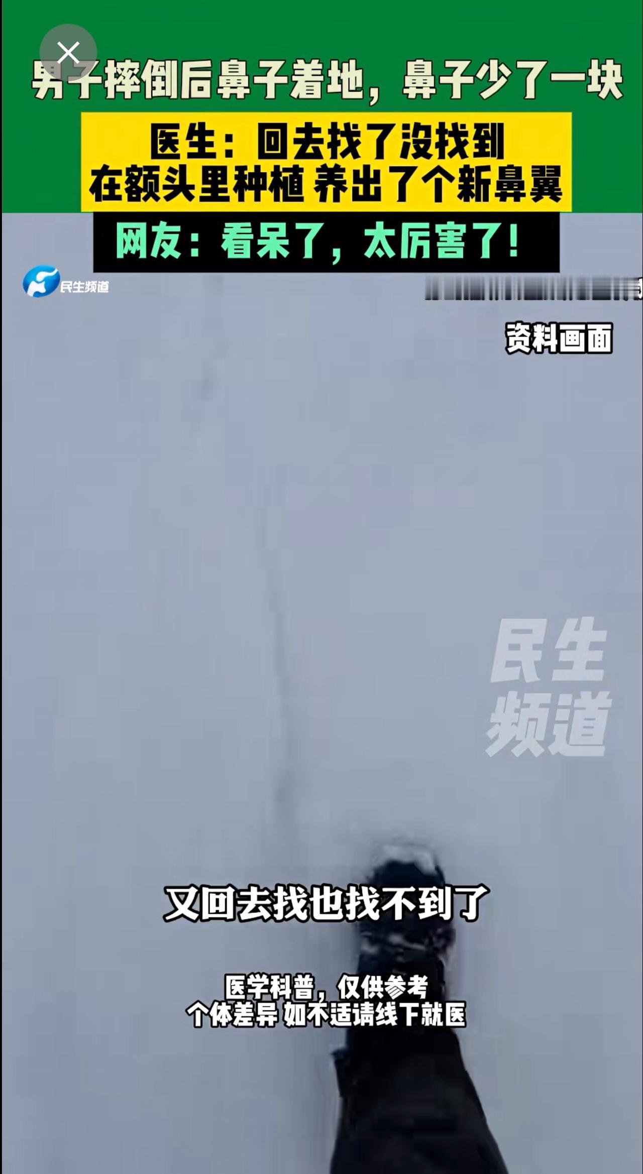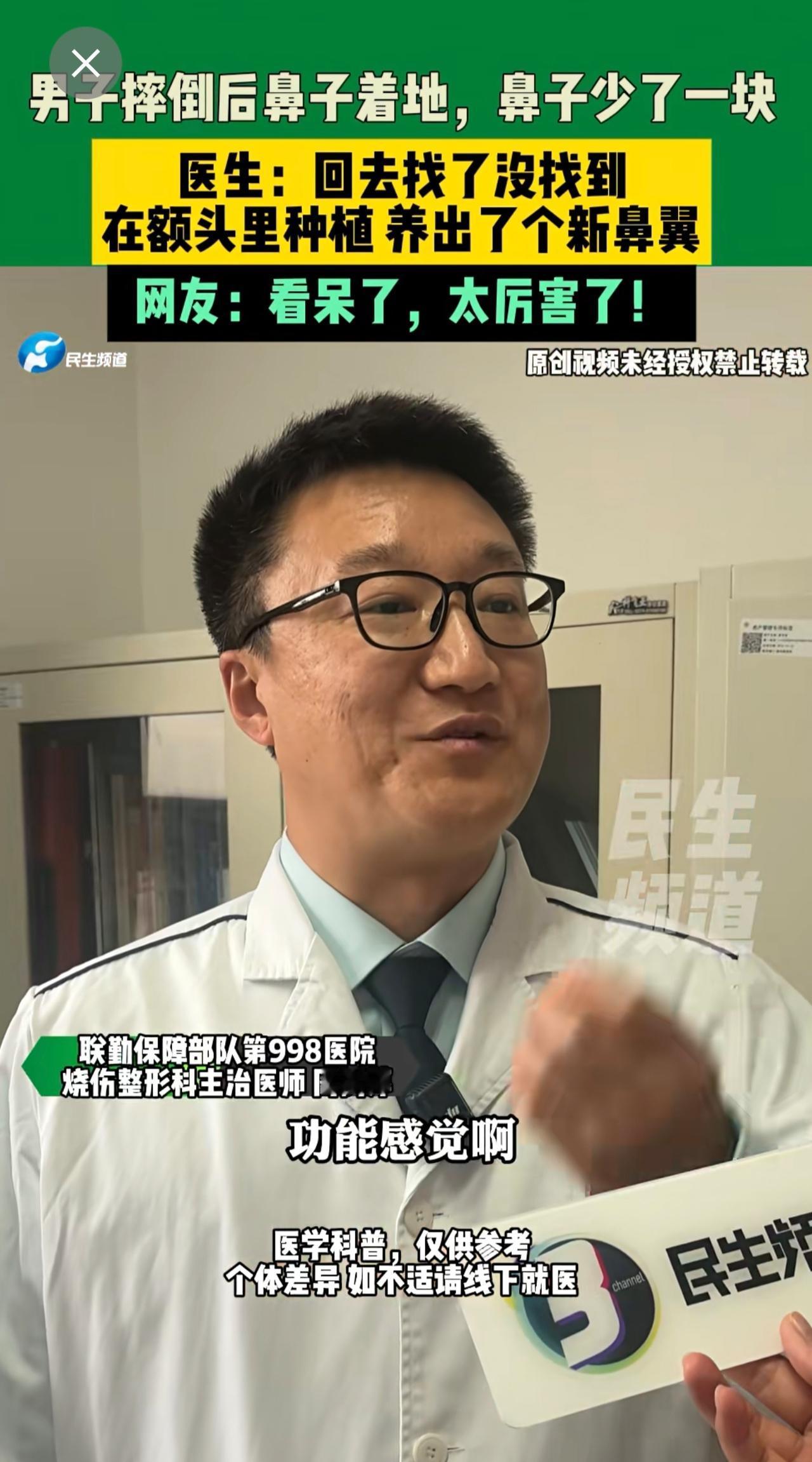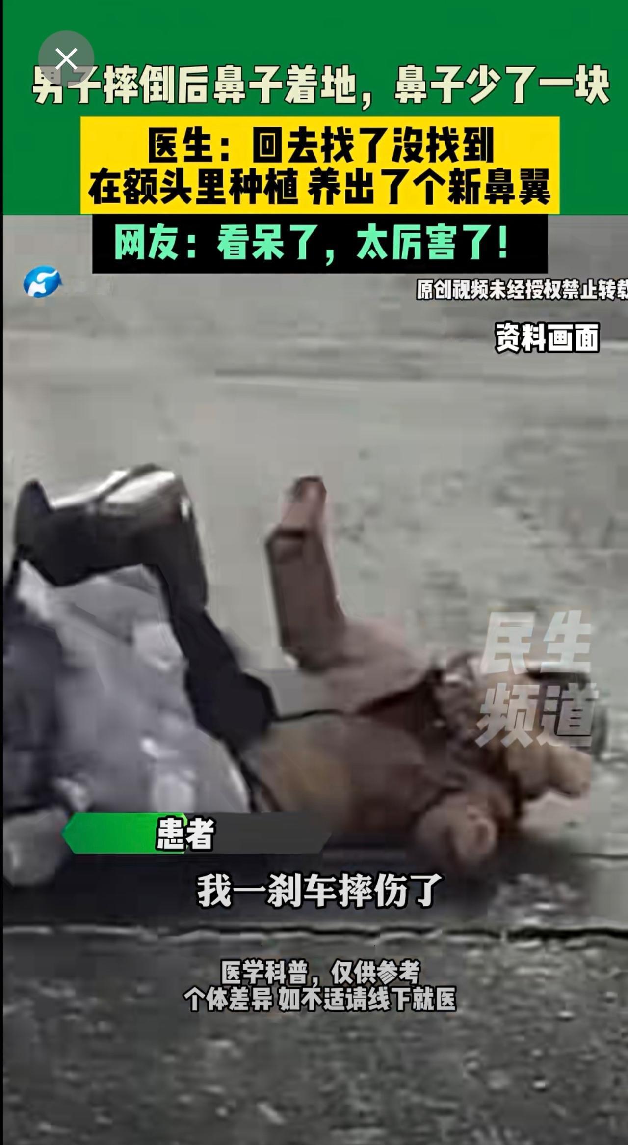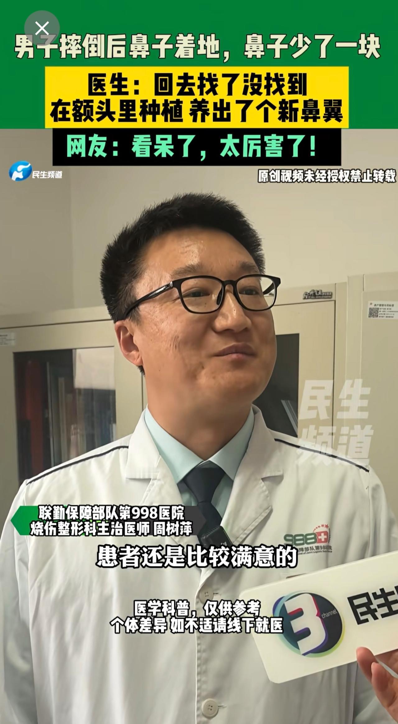 12月8日(发布)河南郑州 男子摔倒后鼻子着地,鼻子少了一块,医生:回去找了没找到,在额头里种植,养出了个新鼻翼,网友:看呆了,太厉害了!