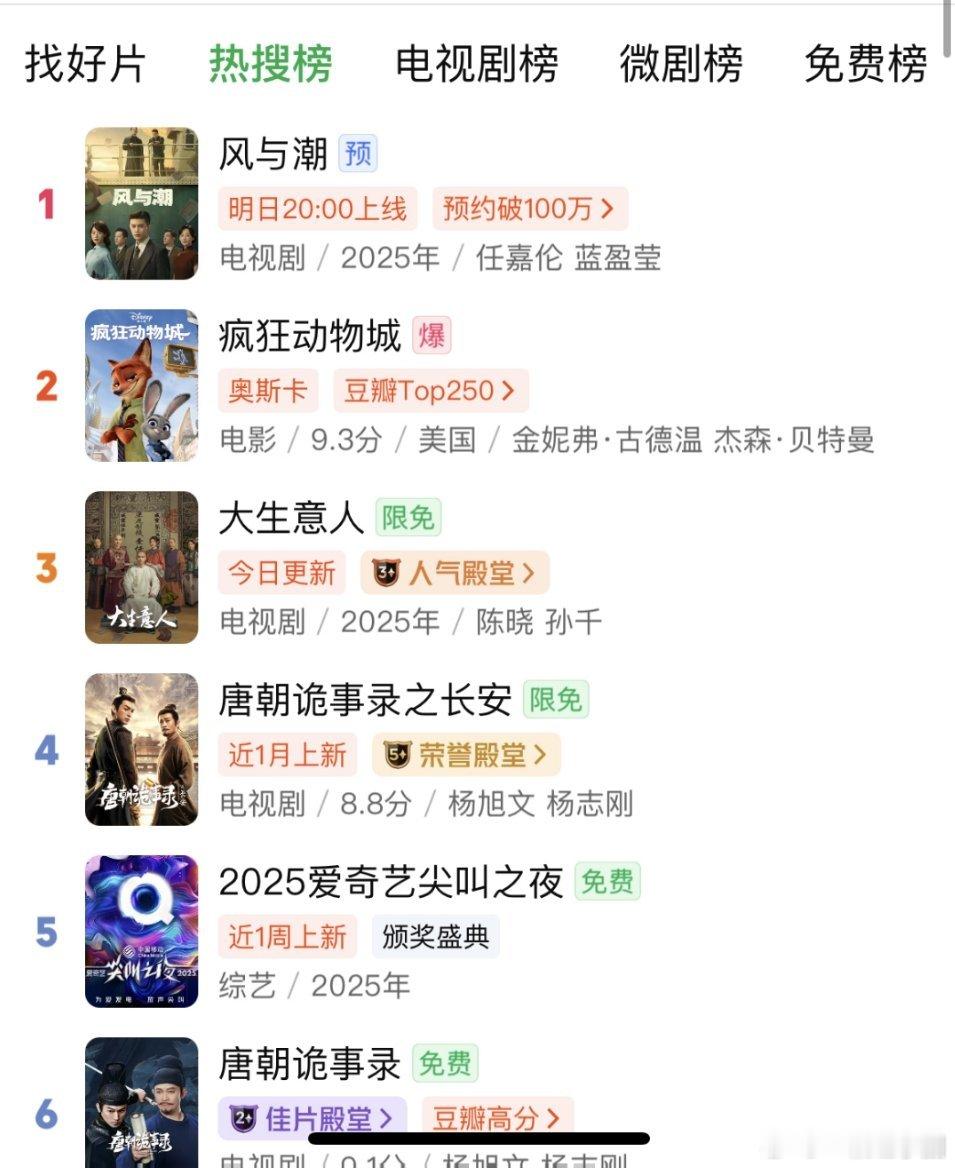风与潮爱奇艺站内热搜已登顶!明晚才播!而且,在榜的可都是近期热门影视剧啊!