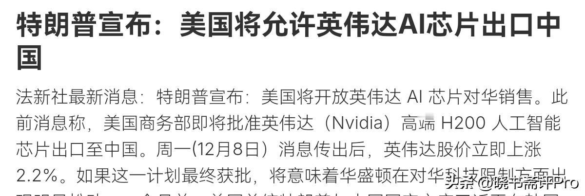 美国对华出现重大让步,中美已经走向事实上的互利共赢之路!12月9日,根据法新社报道,美国总统特朗普亲口宣布,美国将允许英伟达AI芯片出口中国。法媒称,美国商务部即将批准英伟达(Nvidia)高端 H200 人工智能芯片出口至中国。很显然,特朗普的这一宣布,这意味着美国在技术管制方面出现了重大松动。 相关资料显示,H200 芯片比 H100 更快处理海量数据,其计算能力几乎是目前可合法出口给中国的 H20 芯片的六倍。如果 H200 获准进入中国,中国的 AI 实验室将能够构建性能接近美国顶级 AI 超级计算机的系统。很显然,美国的这一举动,这说明什么呢?这说明我们对于美国的反制完全奏效,美国终于意识到中美双方斗则两伤,合则两利。 事实很清楚,若不是我们使用稀土管制反制美国,美国绝不可能作出如此重大的让步。某种程度来说,随着中美经贸关系渐趋稳定,美国放松科技管制,这意味着中美双方事实上走向了互利共赢之路。从美国的角度而言,美国产品可以获得中国市场,美国政府可以获得税收。从我们的角度而言,我们在人工智能领域发展有了更好的基础。事实证明,中美完全可以坐下来进行合作,而这恐怕也是美国对华政策一个重大的转向。