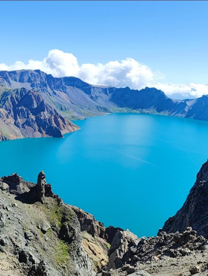 这抹澄澈的蓝,是长白山天池给人间的惊喜。火山岩壁环伺着一汪宝石色的湖水,云絮缠在远山尖,风掠过石缝里的细草,连波纹都轻得像句耳语——这是天地攒了千万年的温柔,一抬眼就撞进心尖。