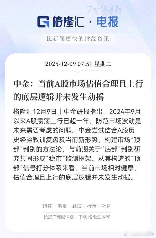 中金的研报说现在A股市场挺健康,估值合理,上涨的大方向没变。还搞了个判断市场顶部的打分系统,结合历史经验和当前情况,发现现在还没到顶!意思就是,股市虽然涨了一年,但价格不算贵,基本面还稳,继续向上的动力还在。不过也提醒大家要注意防范波动,毕竟股市震荡难免!说白了就是,现在市场还算安全,但别盲目追高,保持警惕就好!