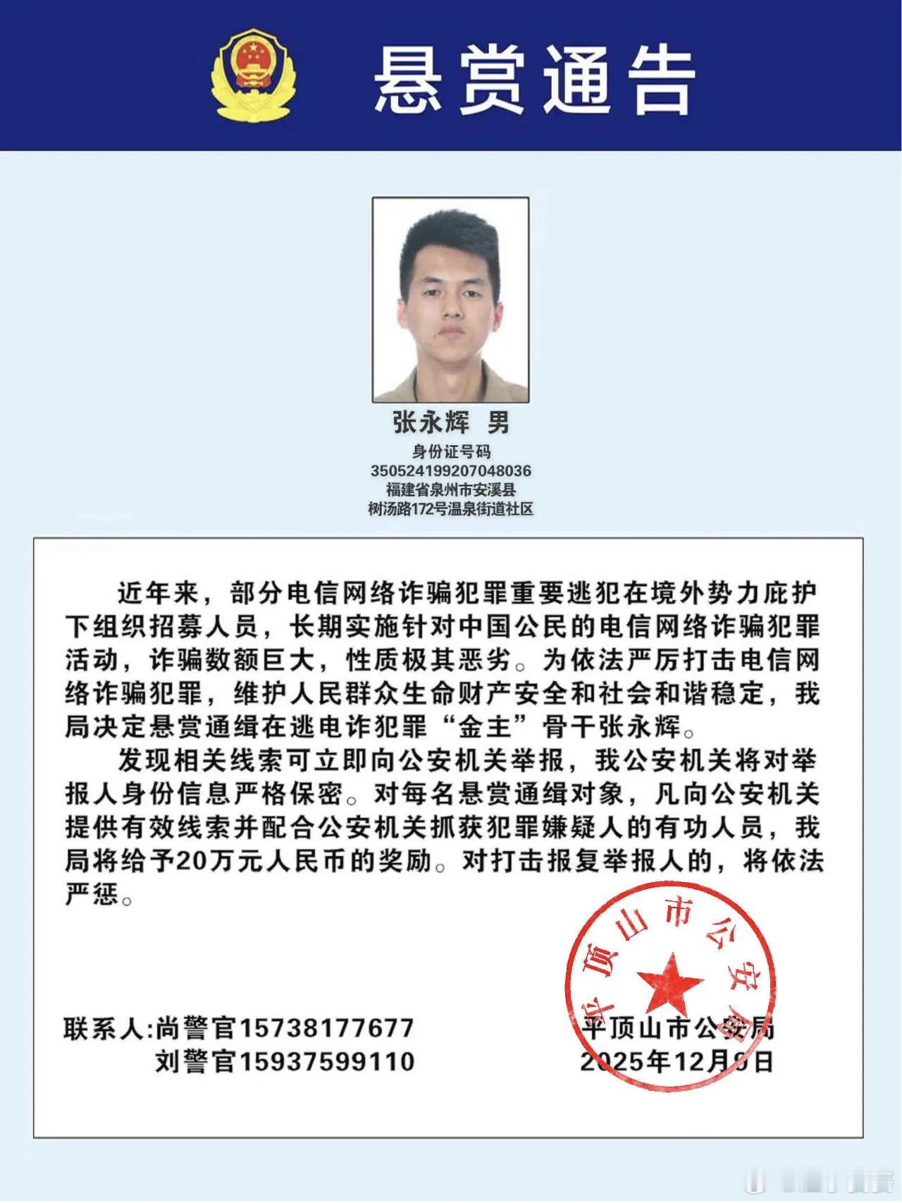 【公安机关公开通缉100名电信网络诈骗犯罪在逃金主和骨干人员】为依法严厉打击跨境电信网络诈骗犯罪,切实维护人民群众财产安全和合法权益,近日,公安部发布通缉令,公开通缉100名电信网络诈骗犯罪在逃金主和骨干,其中包括吴启平、吴清正、傅小滨、欧长华等缅北“四大家族”犯罪集团重要逃犯。经查,近年来,吴启平、吴清正、傅小滨、欧长华等犯罪嫌疑人在境外势力庇护下,组织招募人员,长期实施针对中国公民的电信网络诈骗犯罪活动,诈骗数额巨大,性质极其恶劣。特别是公安部部署开展打击缅北涉我犯罪专项工作以来,在公安机关严打高压态势下,上述犯罪嫌疑人仍不收敛、不收手,继续大肆组织实施违法犯罪活动。该批在逃人员犯罪事实清楚、证据确凿充分,浙江杭州、温州,福建泉州、龙岩,河南平顶山,广东深圳,云南昆明和重庆等地公安机关决定对其进行公开悬赏通缉。公安机关敦促相关犯罪嫌疑人认清形势,悬崖勒马,主动投案自首,争取宽大处理。同时,希望社会各界和广大人民群众积极举报,协助抓捕犯罪嫌疑人。对提供有效线索和协助抓捕的有功人员,公安机关将依法予以保护和奖励。(来源:公安部)