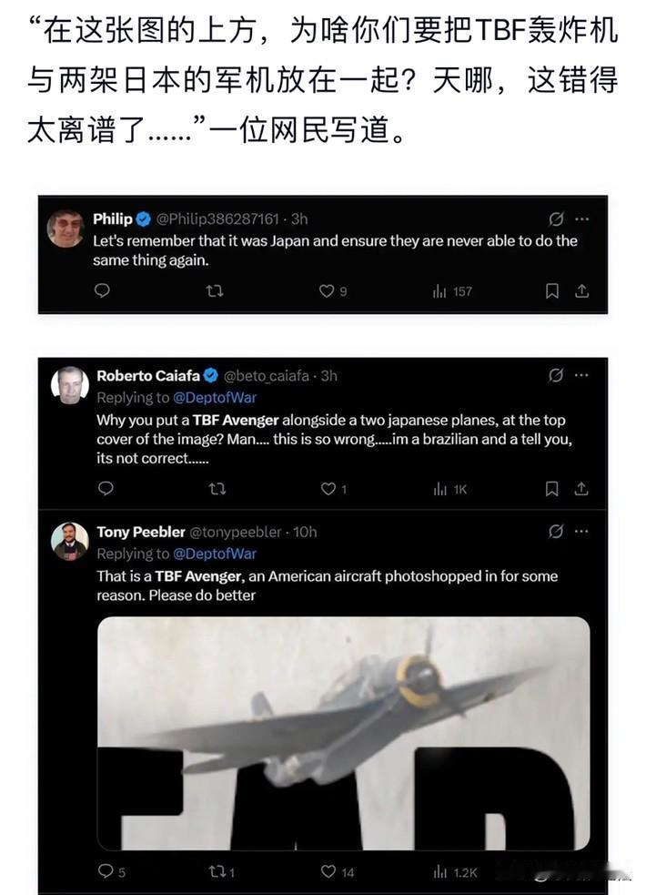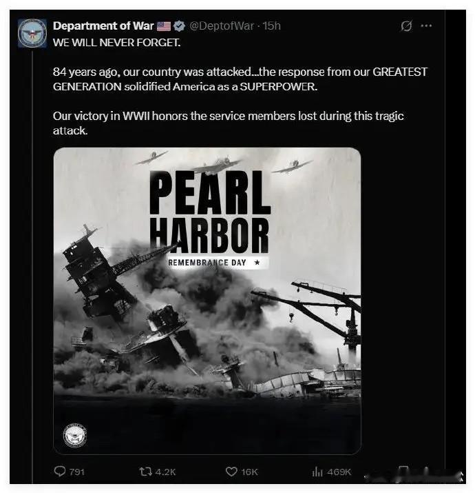 美国战争部意欲何为?发布的纪念珍珠港遇袭84周年海报中,来袭三架敌机中排在C位的居然是美国TBF轰炸机! 军事爱好者发现画面中美国轰炸机成了来袭敌机,不仅如此,画面和配文中也看不到发动袭击者的身份,只是说了“我们不会忘记”。 美国当年珍珠港遇袭可是损失惨重,如今却连凶手的身份都不敢再提了!