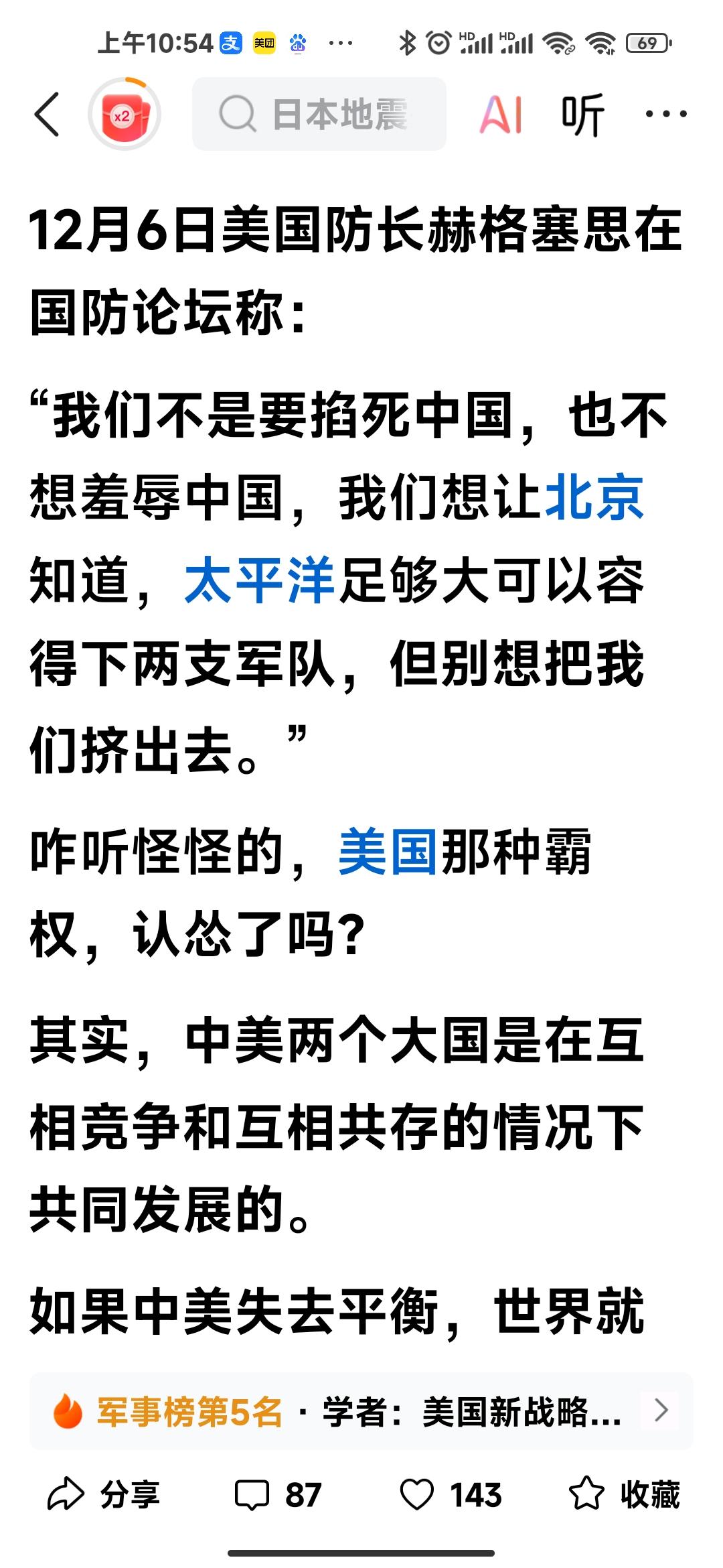 杜文龙表示,美国战争部长告诫日本别惹事。嘿,这日本啊,虽说号称是美国的“儿子”,