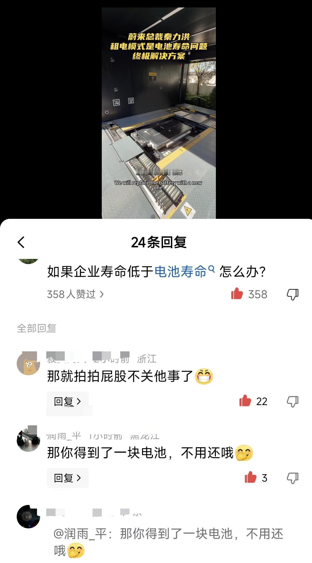 蔚来总裁:租电模式是电池寿命问题终极解决方案!网友回复:要是企业寿命没有电池寿命长怎么办?